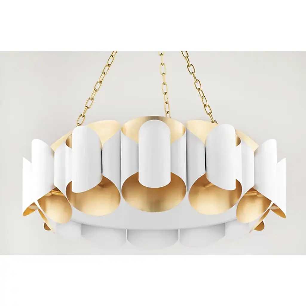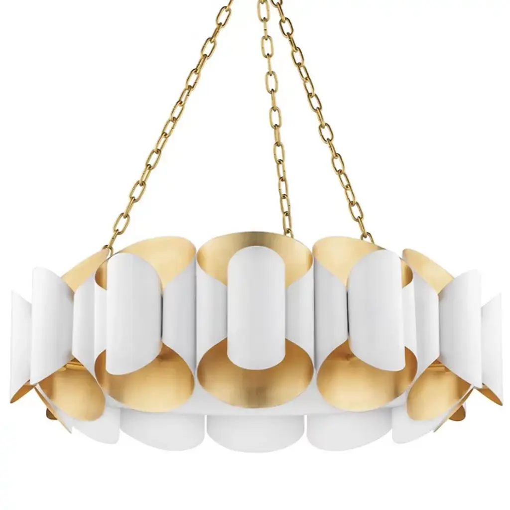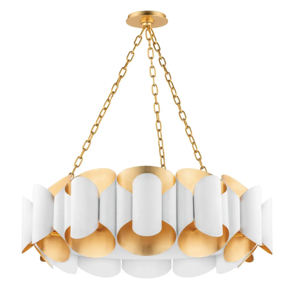 Add a sleek touch of the swinging ’60s to your ceilings with the Banks Chandelier from Hudson Valley Lighting. This piece is anchored from above by a single stepped canopy and a triple array of robust chain links. The links descend to support a lower ring structure containing the fixture’s damp-listed lamping, securely held within a series of smoothly-swept steel shades. Each shade is bevel-cut along its top and bottom and features a reflective interior that contrasts with the sleek outer texture, blunting glare from the sides into a pleasing ambiance above and below with the aid of a small, oppositely curved shade segment.