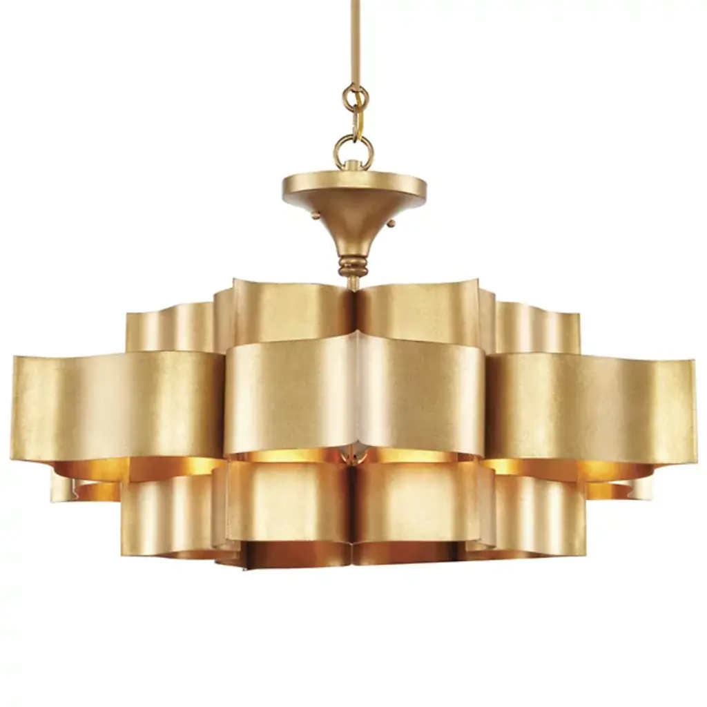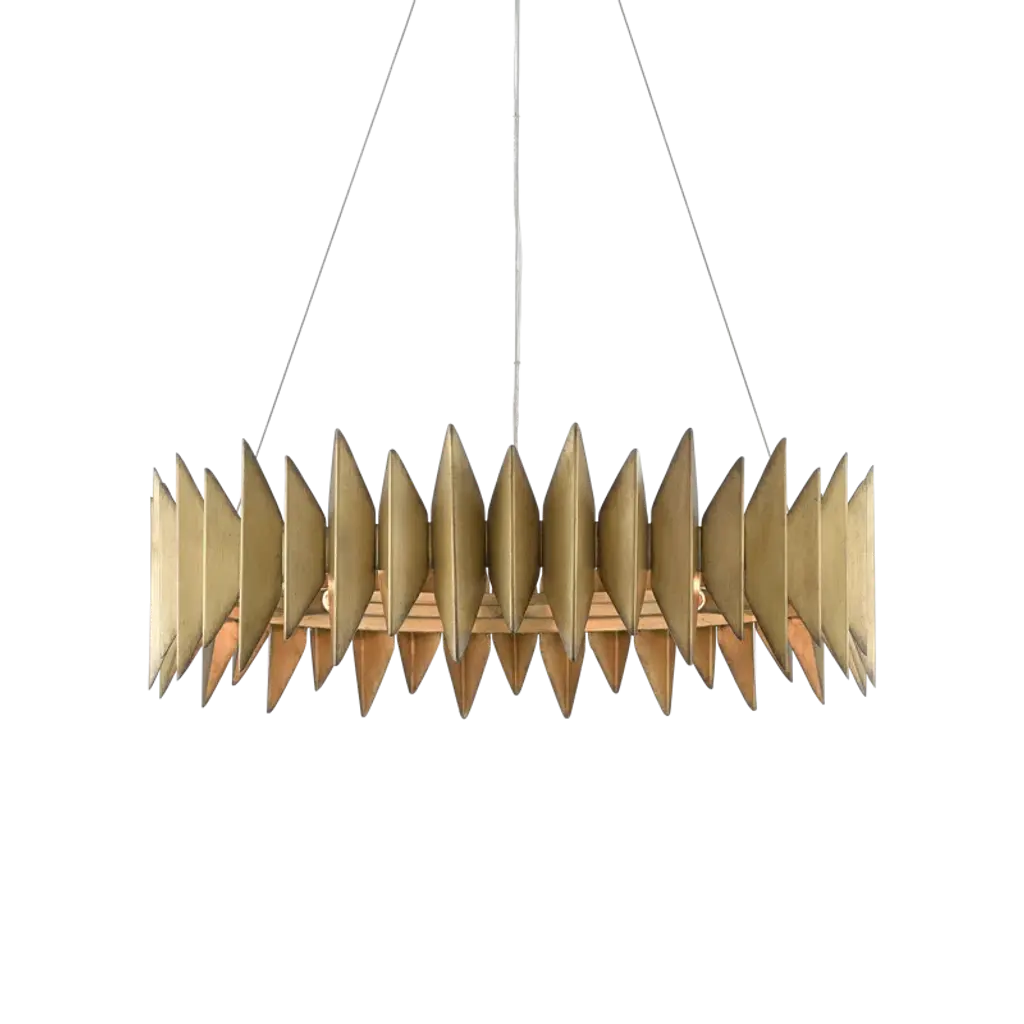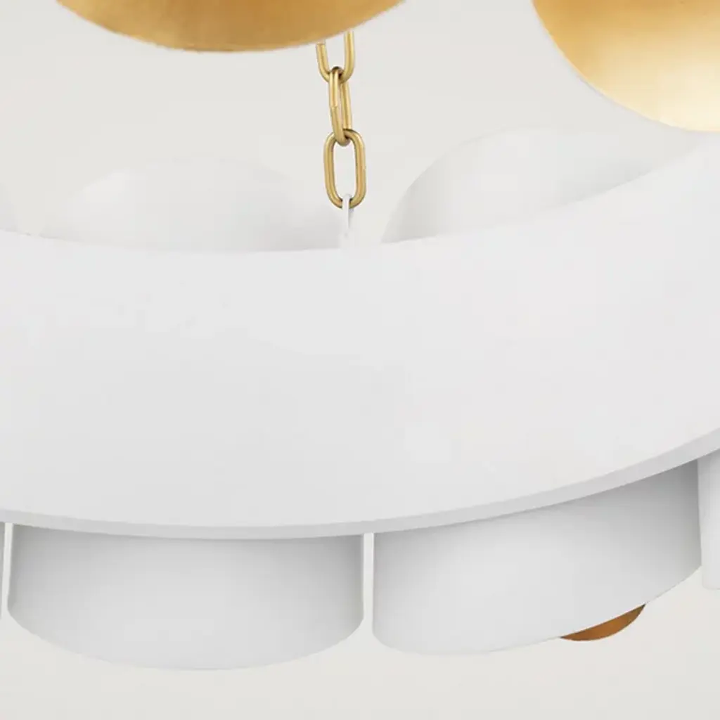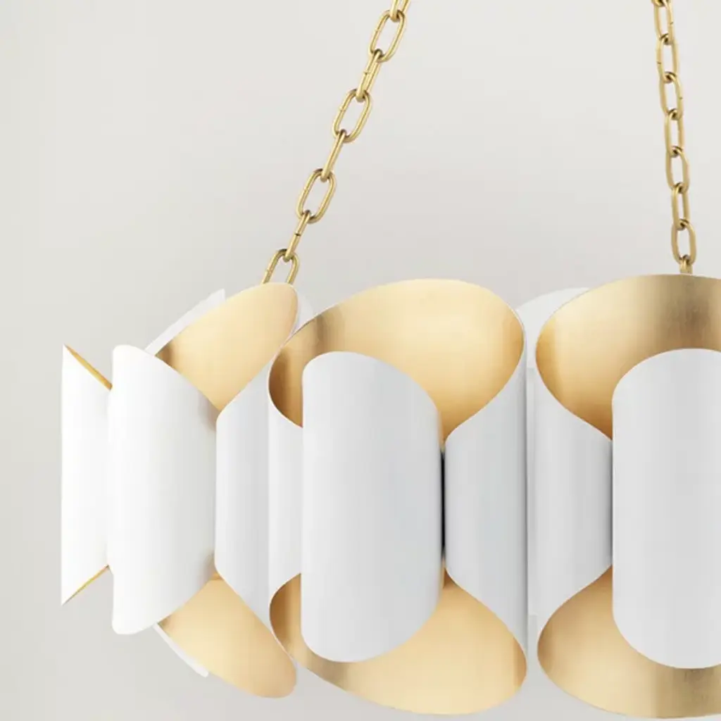 Add a sleek touch of the swinging ’60s to your ceilings with the Banks Chandelier from Hudson Valley Lighting. This piece is anchored from above by a single stepped canopy and a triple array of robust chain links. The links descend to support a lower ring structure containing the fixture’s damp-listed lamping, securely held within a series of smoothly-swept steel shades. Each shade is bevel-cut along its top and bottom and features a reflective interior that contrasts with the sleek outer texture, blunting glare from the sides into a pleasing ambiance above and below with the aid of a small, oppositely curved shade segment.