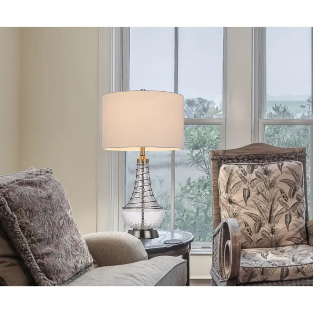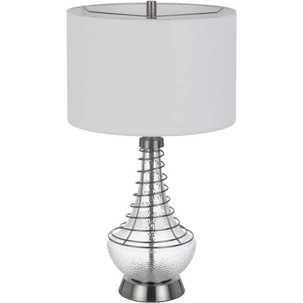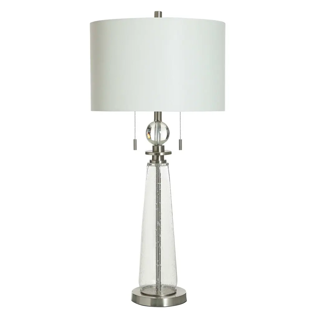 With Clean and smooth lines this table lamp will make a wonderful addition to any living room or bedroom. It features a pear shaped glass body upon a weighted brushed steel metal base.. The lamp ships complete with a round hardback fabric shade and matching finial.