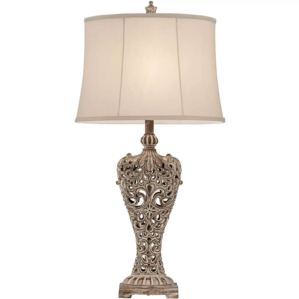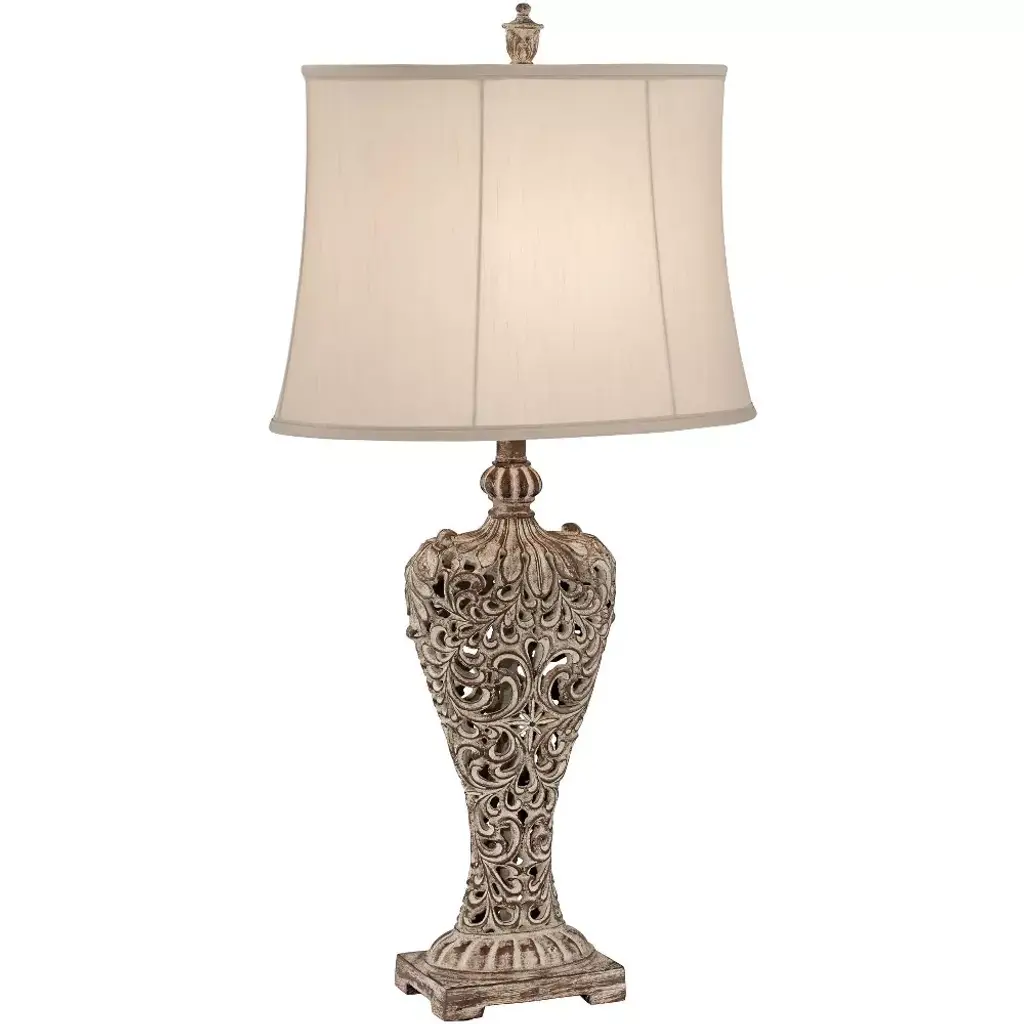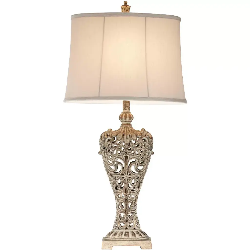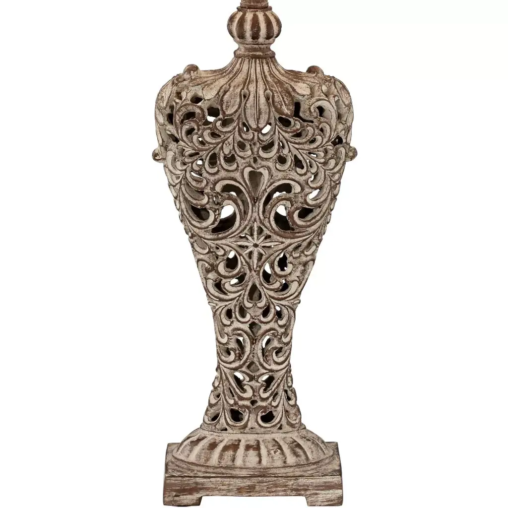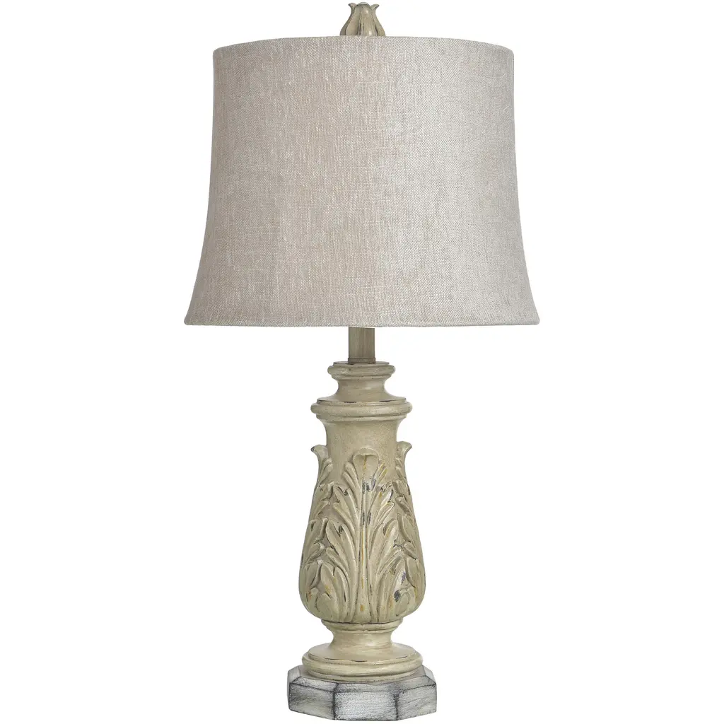 Ornately carved details give character to this Elle table lamp. Gentle scrolls and scalloped accents, made from resin, are coated in an antique gold finish that radiates in the light. Up top, a light oval off-white shade lends itself to the intricate base and softens the glow from the bulb. An elegant addition to any tabletop in your home.