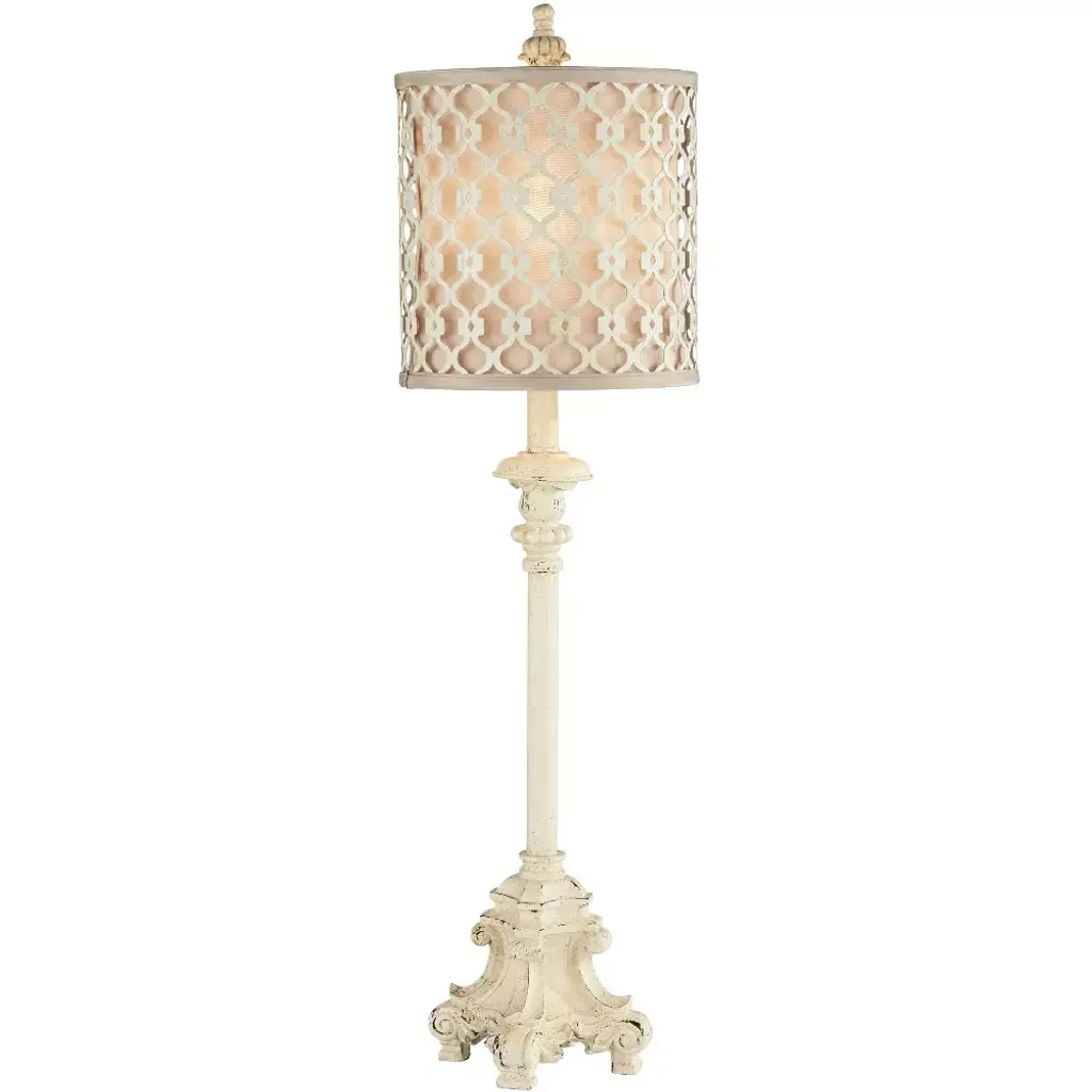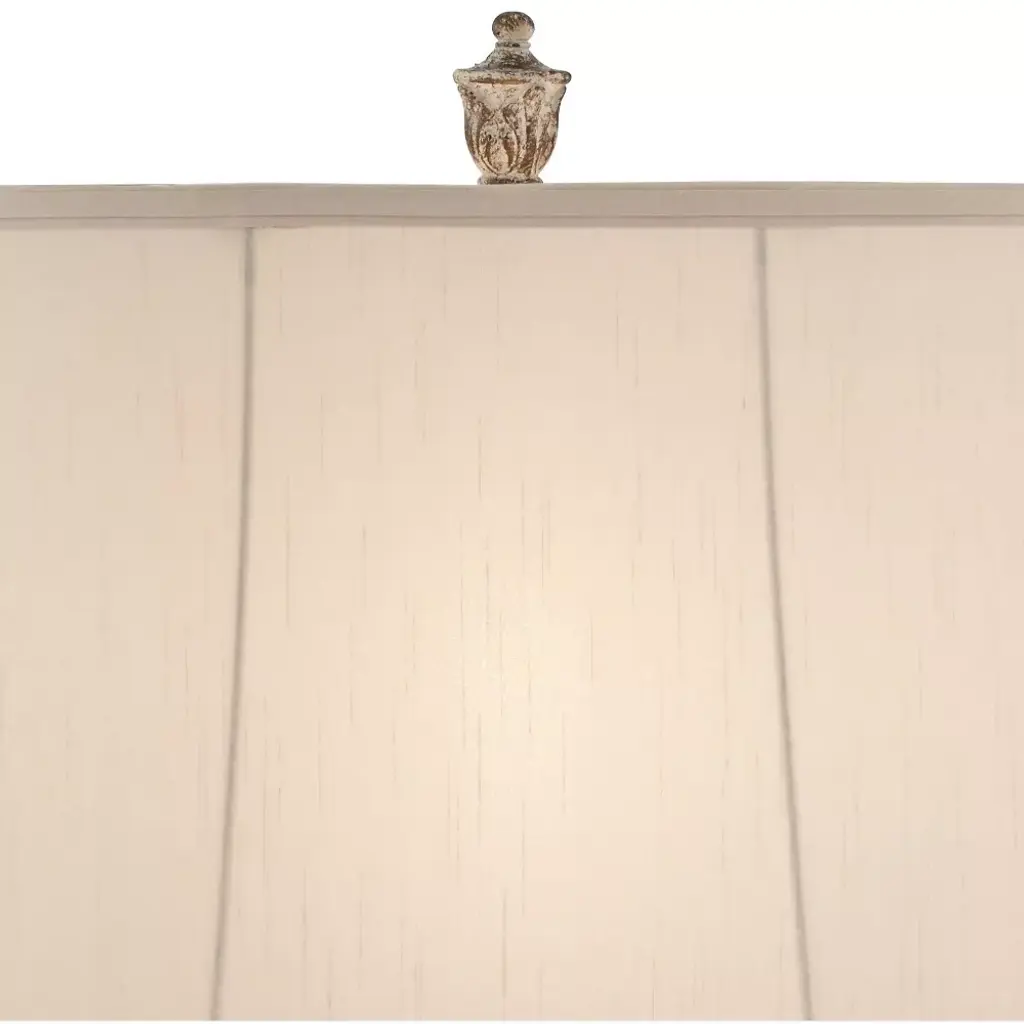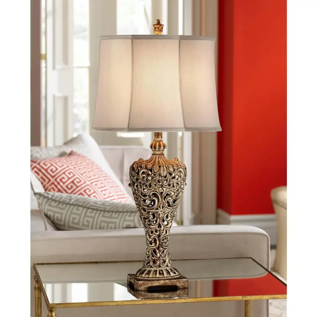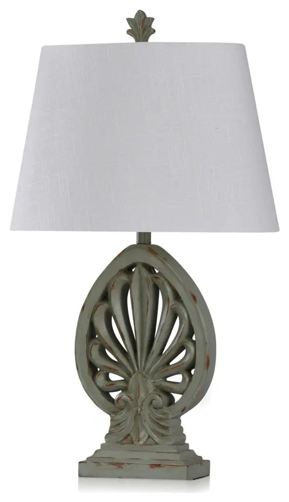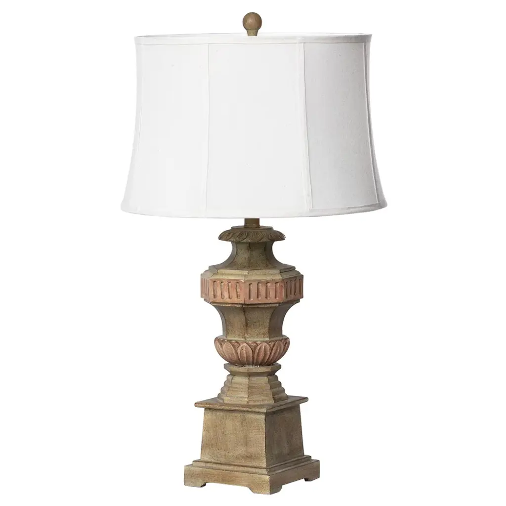 Ornately carved details give character to this Elle table lamp. Gentle scrolls and scalloped accents, made from resin, are coated in an antique gold finish that radiates in the light. Up top, a light oval off-white shade lends itself to the intricate base and softens the glow from the bulb. An elegant addition to any tabletop in your home.
