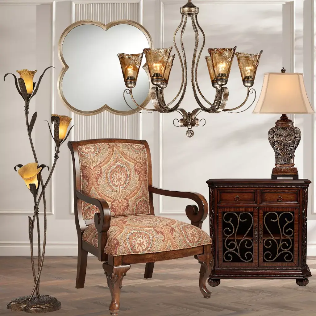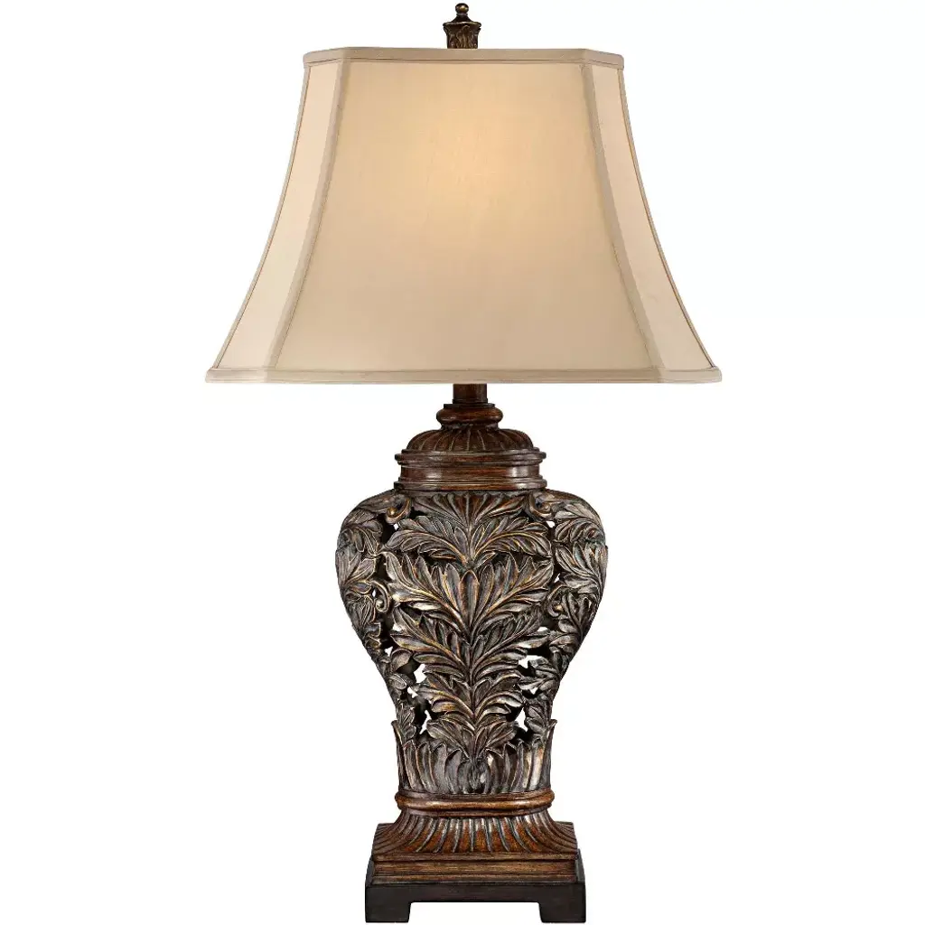 This enchanting table lamp has a beautiful openwork vase design of gently curling leaves. The base is constructed from resin with a handsome bronze finish that is complemented by the light tan rectangular shade. A wonderful lighting accent for the living room or family room. This lamp also comes with a tabletop line cord dimmer, which allows you to control the level of lighting. The dimmer has a handy USB charging port for charging phones and more. Simply insert the lamp plug into the dimmer outlet, and then slide the switch on the control to dim or brighten the lighting.