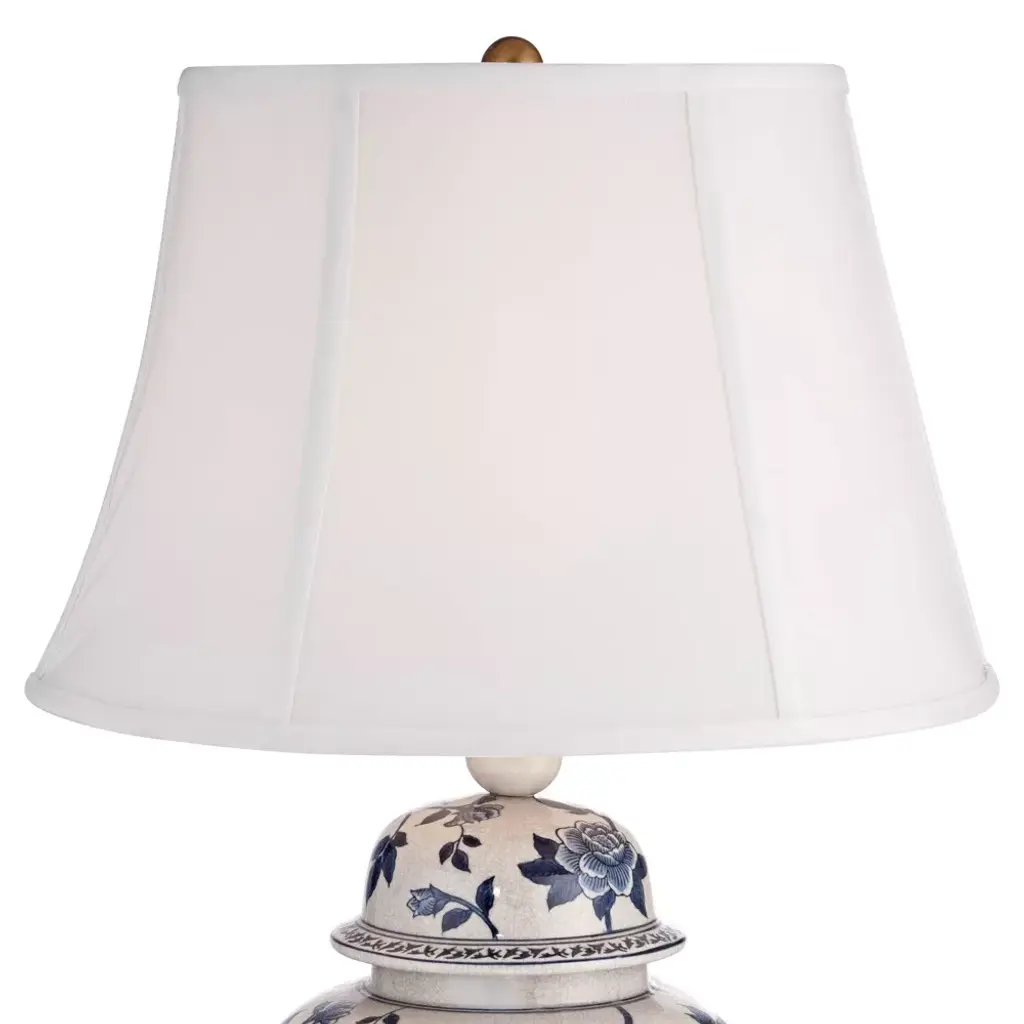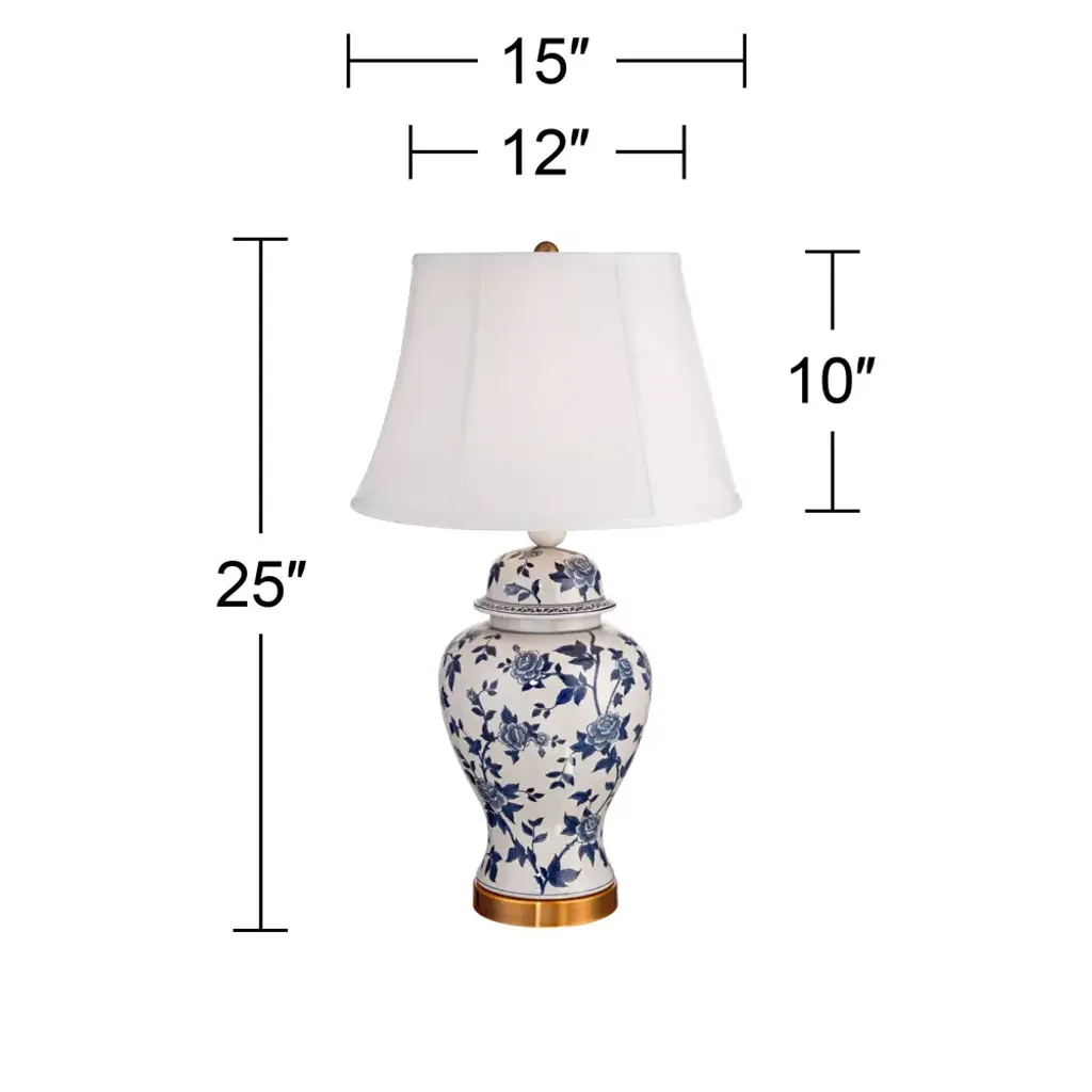 A visually stunning table lamp from Barnes and Ivy in a temple jar shape with a delicate rose vine design in a rich blue and white color pattern. A crackle ceramic finish adds an antique-inspired look, while the handsome white lamp shade will complement any style of decor. A brass finish metal base completes the look.