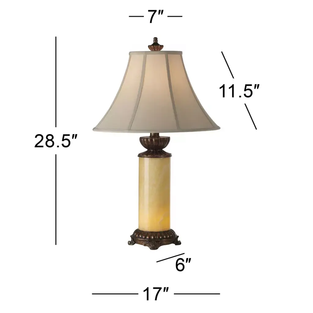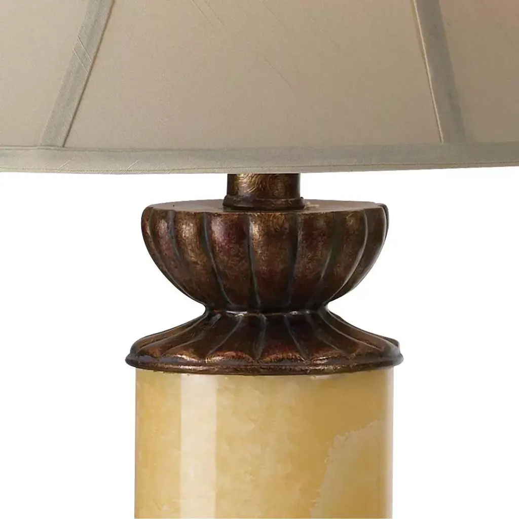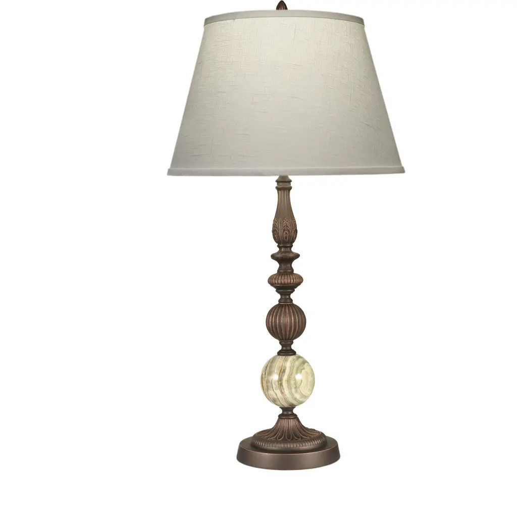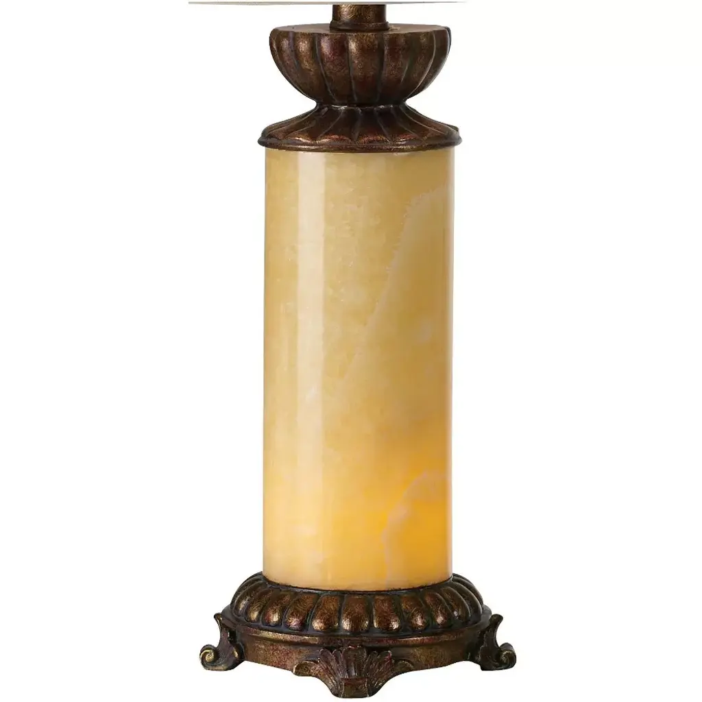A tasteful, refined table lamp design, featuring a natural stone onyx column. A built-in night light behind the stone can be illuminated at night to cast a beautiful glow. Accents are in a dark bronze finish. Topped by a flared bell shade with finial. 4-position switch. Due to the nature of the natural stone onyx, there may be variations in base pattern and color.