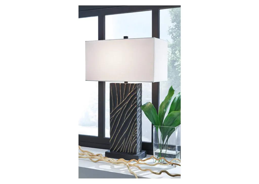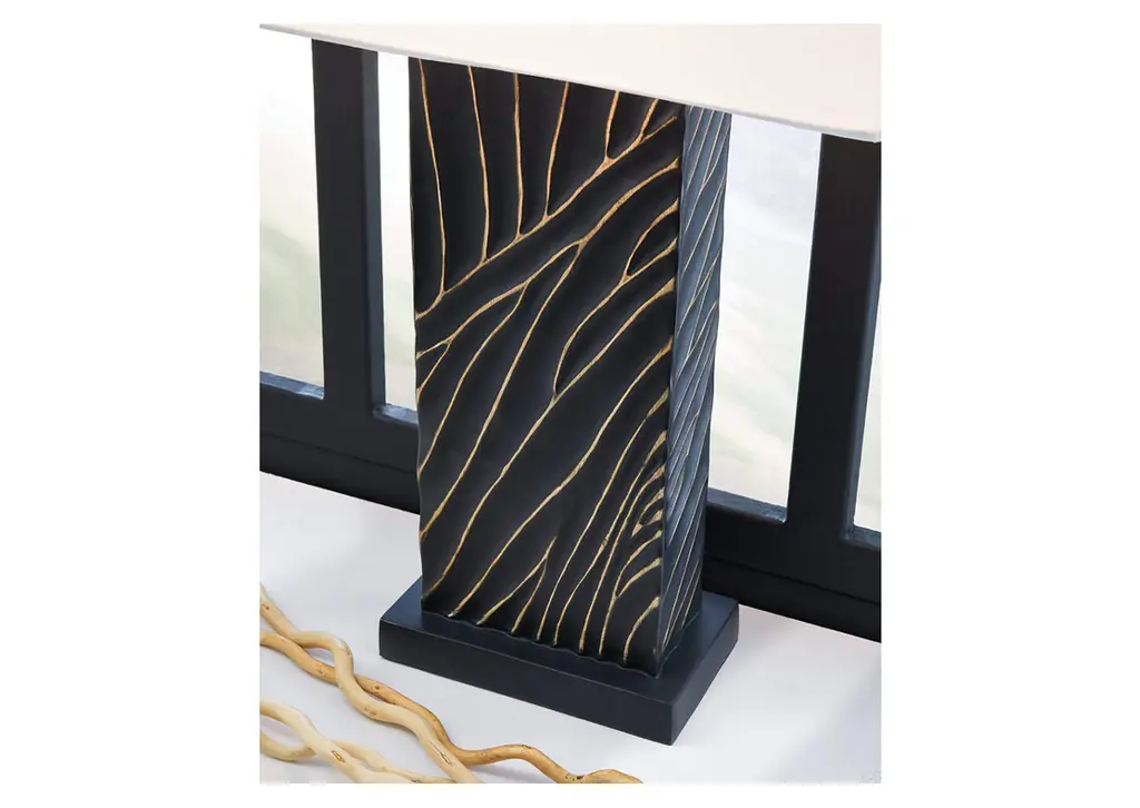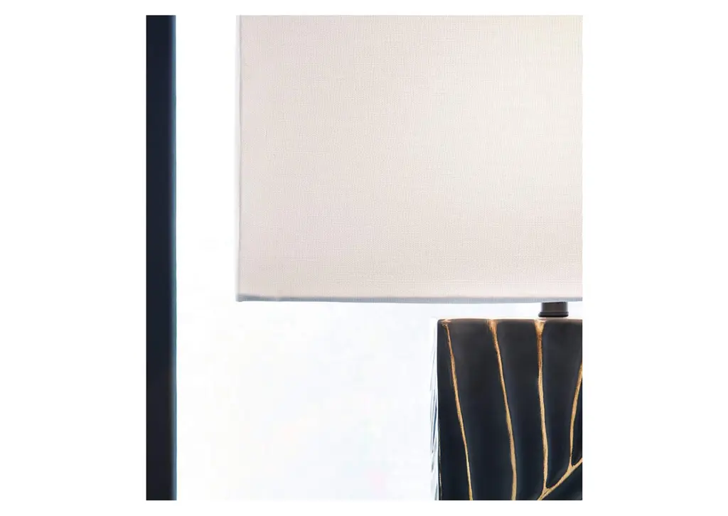 Kick your style up a notch with the Bartlen table lamp. The impressive black base boasts textured detail enhanced with striking gold accents for sophisticated flair. Its eye-catching form exudes an urbane yet casual vibe, making it an easy addition to existing decor. Weight 15.000 lbs. (6.75kgs.)