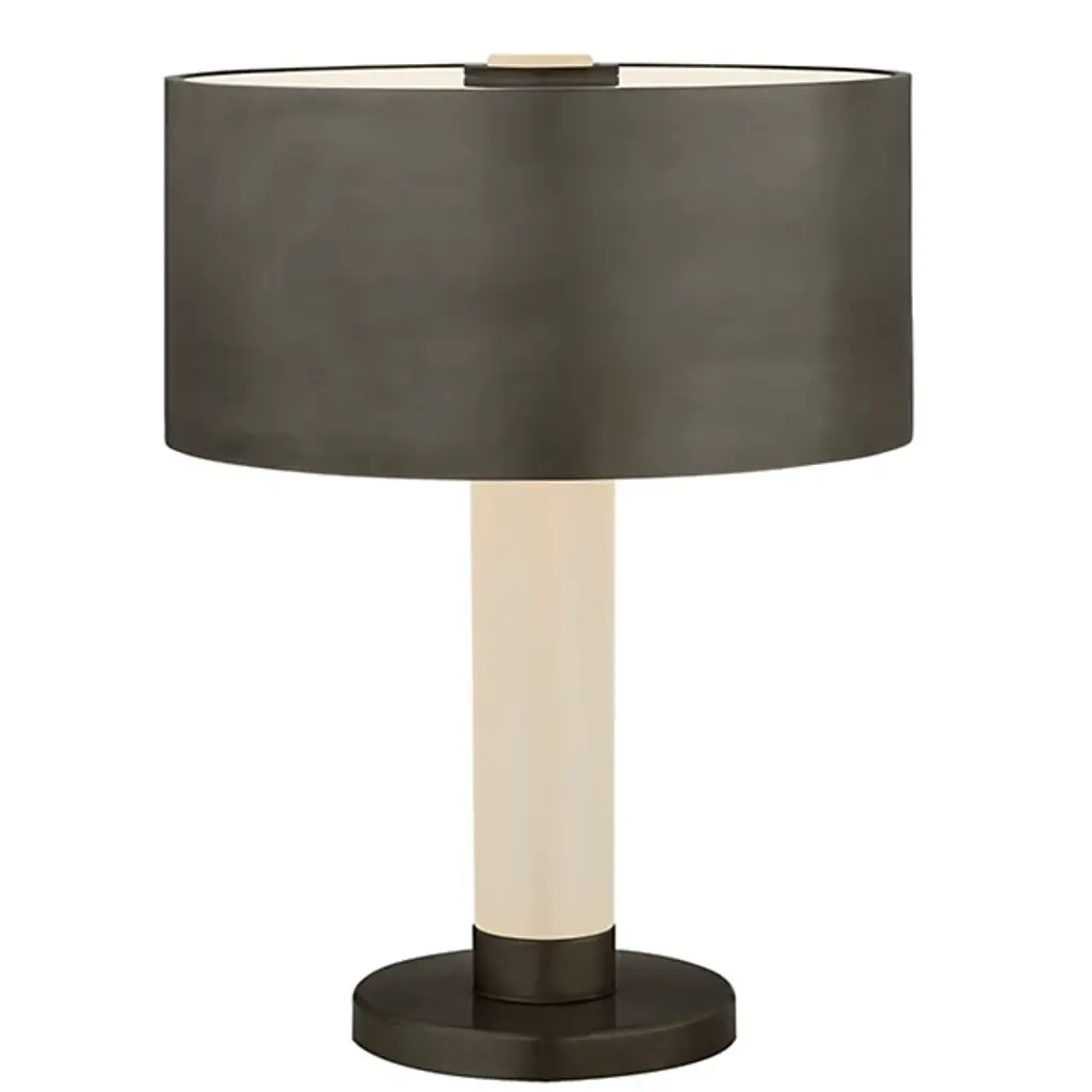 With a simple and stately look, the Barton LED Table Lamp by Visual Comfort Signature, formerly known as Visual Comfort, brings visual balance and light to the room. A circular metal base supports a tubular body that ascends to a smooth, metal shade. Its two-tone finish displays a clean contrast that remains simple and tasteful. Its incandescent bulb emits a warm glow perfect for beside a reading chair or bedside while enhancing the etched crystal texture of its cylindrical body. From designer Ralph Lauren, this piece brings a tasteful accent to any space in the home.