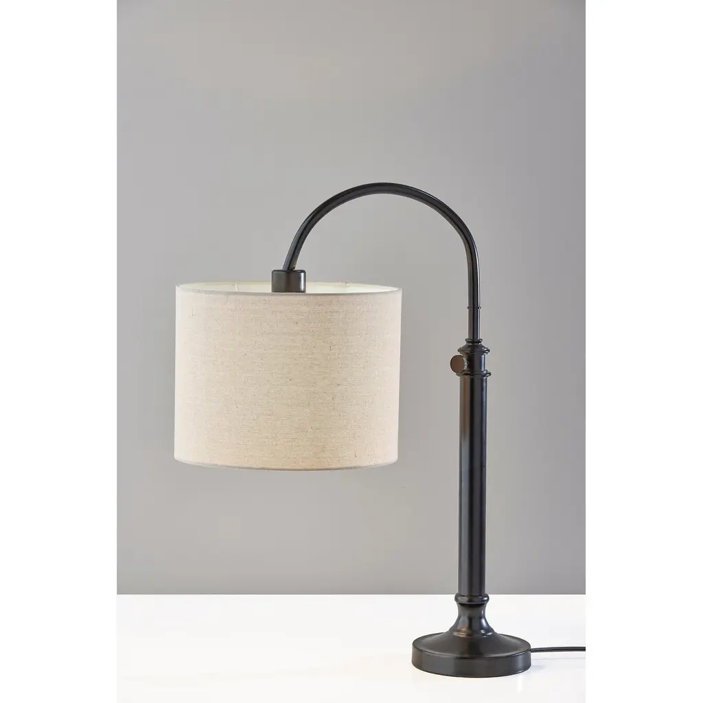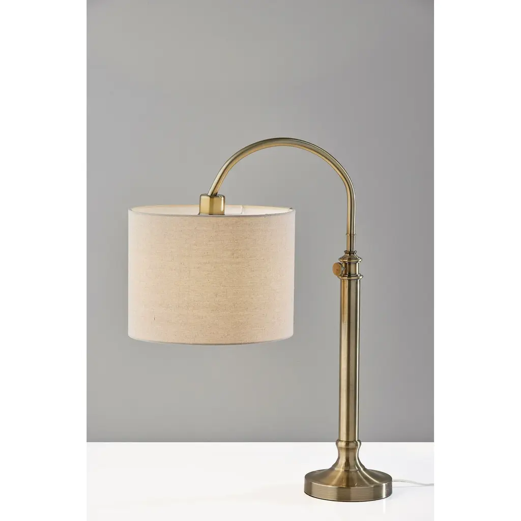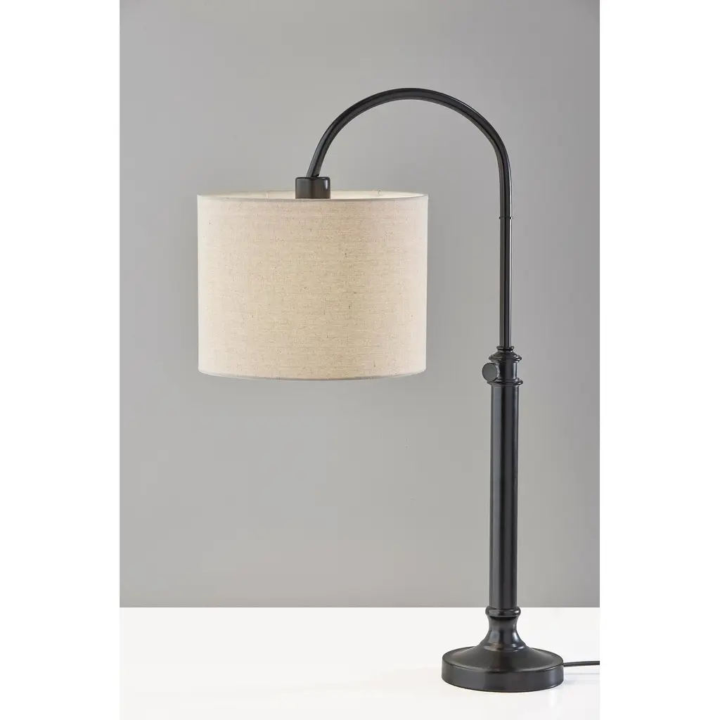 The Barton task table lamp's classic detailing and adjustable height make it a stylish and versatile addition to desks, end tables, and nightstands. With an antique brass finish that complements Victorian, rustic, and transitional styles, the lamp features a round base and cylindrical tube body with subtle detailing. An arcing stem supports an oatmeal-colored linen drum shade that softly diffuses the light from a 100W bulb. The height of the lamp can be easily adjusted between 25" and 32" using the knob located on the tube, allowing you to customize the lamp height to your space. For a darker look, the table lamp is also available with an antique bronze finish. Complete your décor with the coordinating Barton task floor lamp.