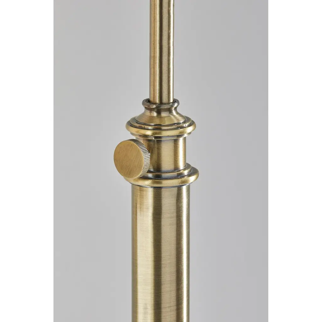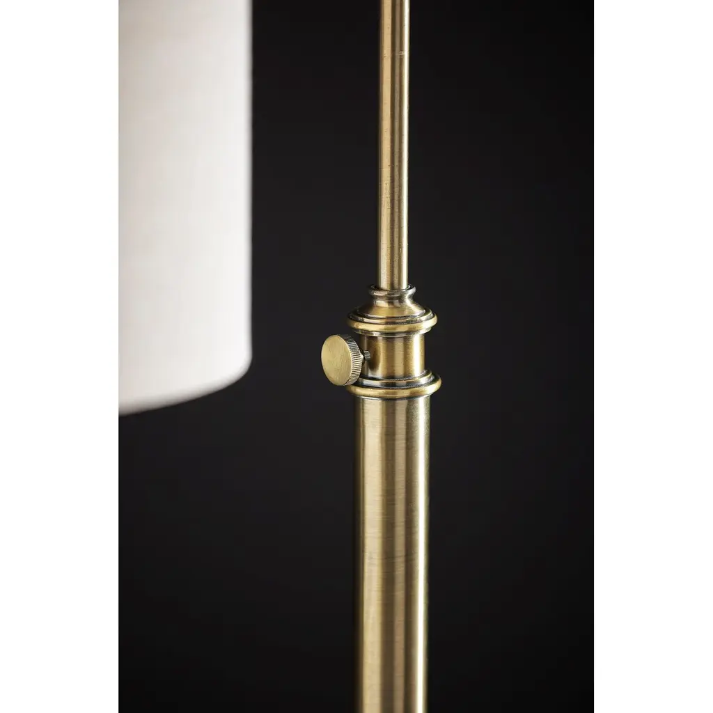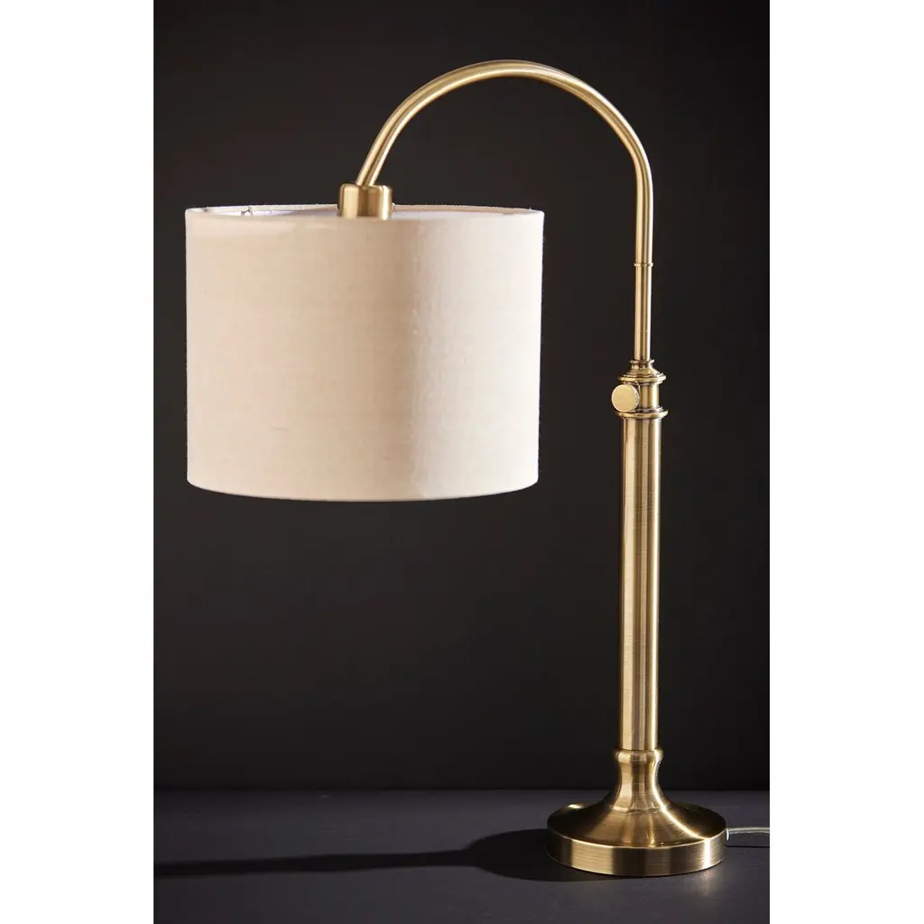 The Barton task table lamp's classic detailing and adjustable height make it a stylish and versatile addition to desks, end tables, and nightstands. With an antique brass finish that complements Victorian, rustic, and transitional styles, the lamp features a round base and cylindrical tube body with subtle detailing. An arcing stem supports an oatmeal-colored linen drum shade that softly diffuses the light from a 100W bulb. The height of the lamp can be easily adjusted between 25" and 32" using the knob located on the tube, allowing you to customize the lamp height to your space. For a darker look, the table lamp is also available with an antique bronze finish. Complete your décor with the coordinating Barton task floor lamp.
