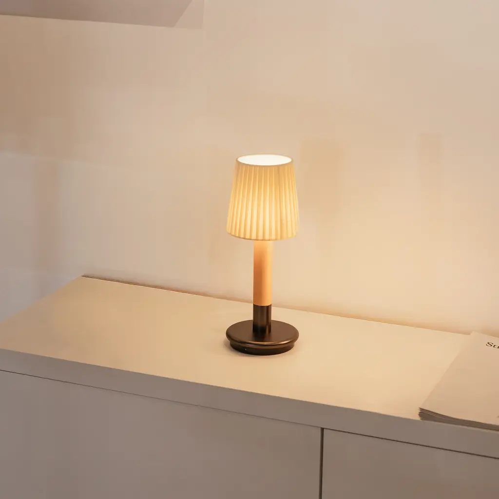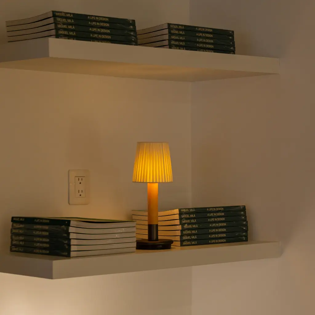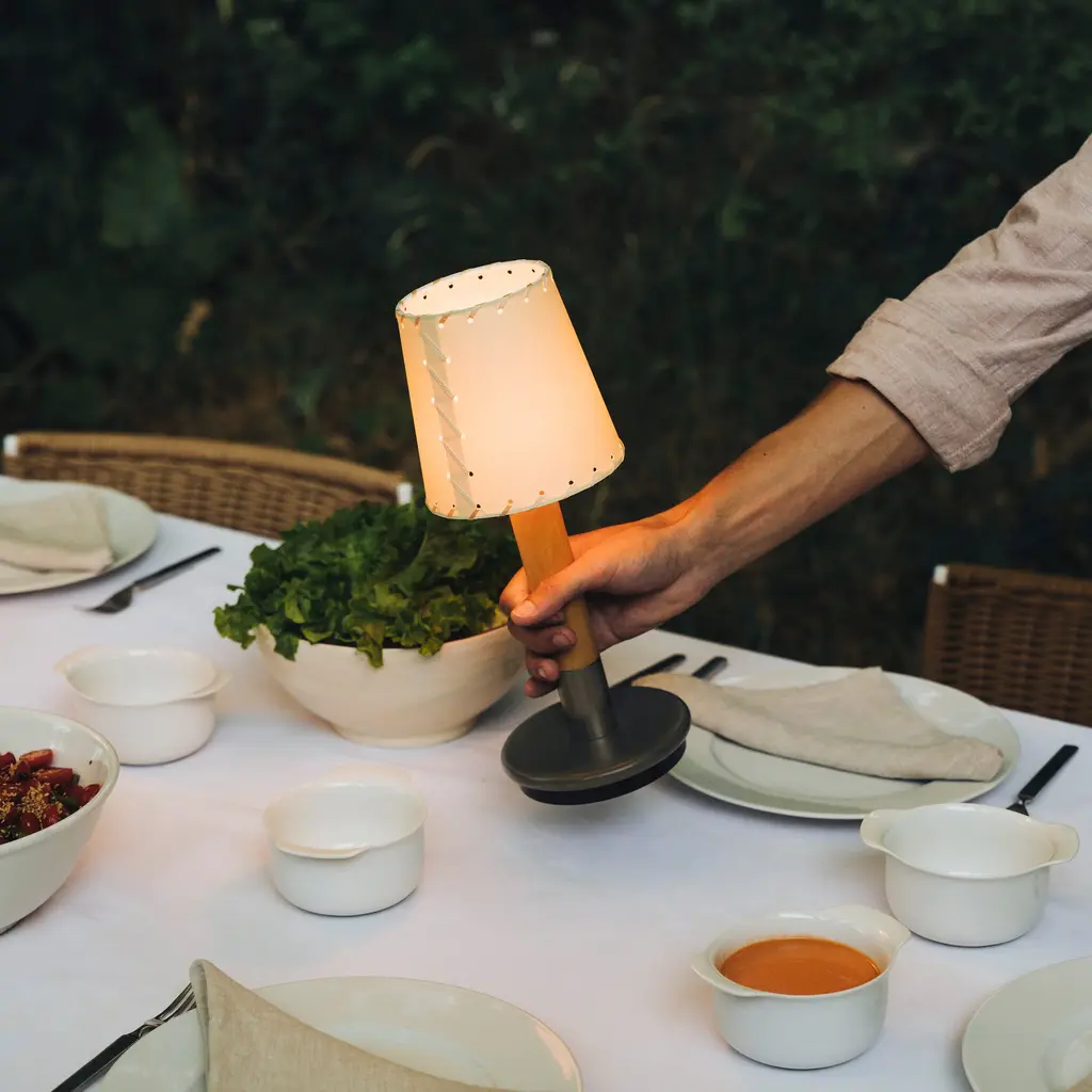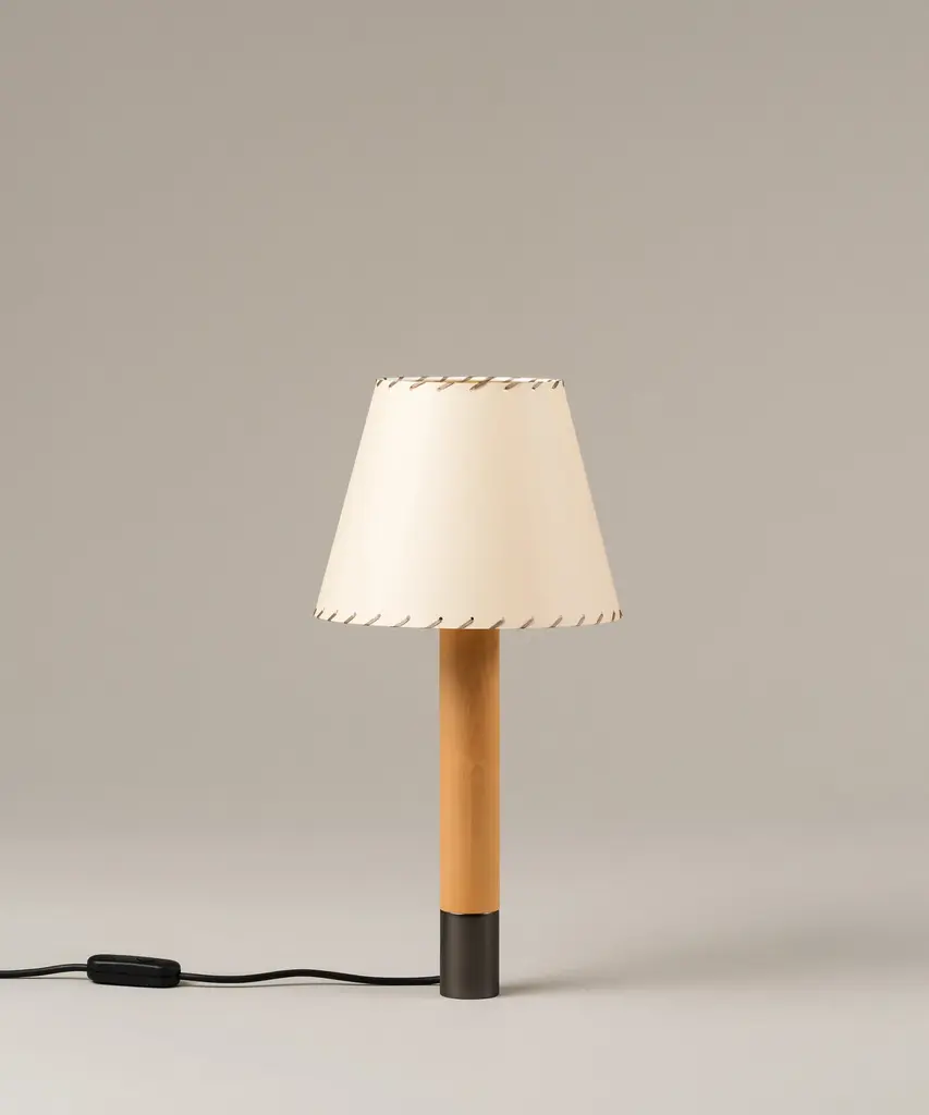 Batería is the completely portable version of designer Santiago Roqueta’s slim LED table lamp, meant to go anywhere that impromptu light is needed. Like its Básica Mínima siblings, it features the natural look of a birchwood cylinder supported by a heavy metal base of equal diameter, in bronze paired with a stitched beige parchment shade or nickel with a natural ribbon shade. Just a touch at the base switches it on (with 2 light levels) and it has a power range up to 14 hours. Contact charger included.