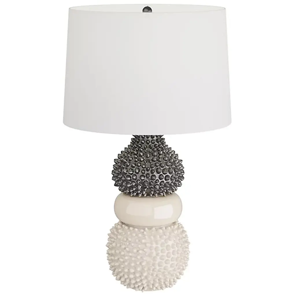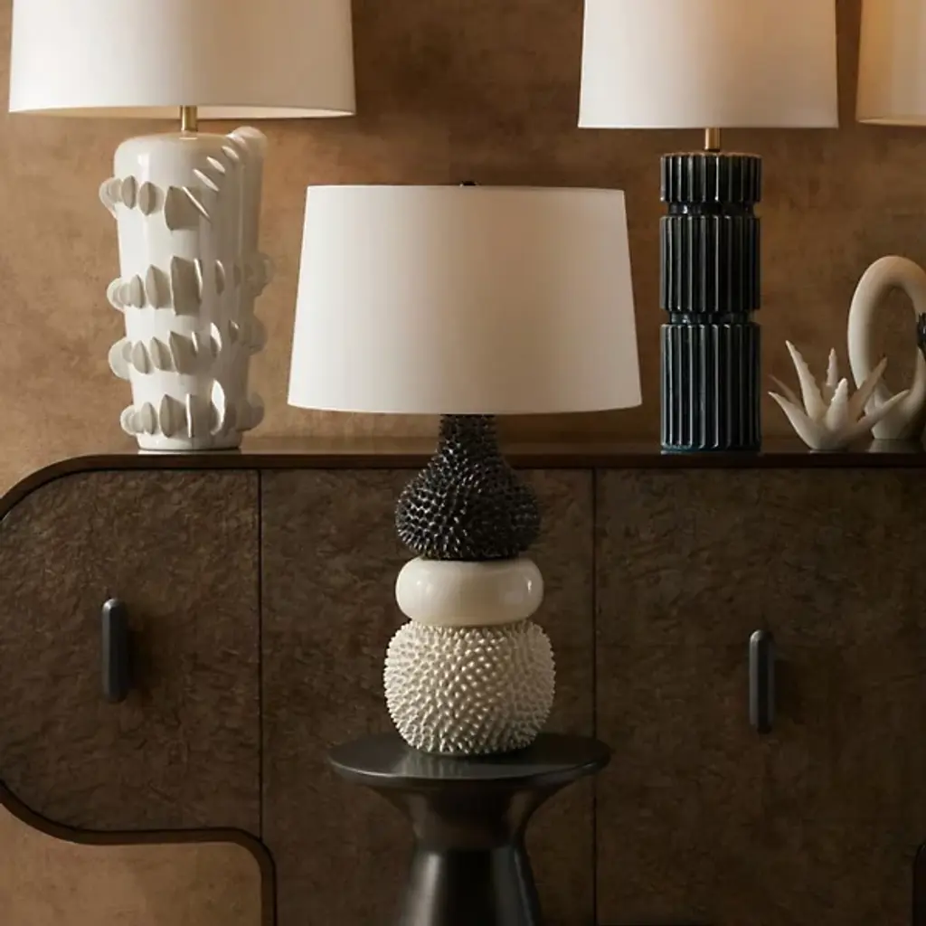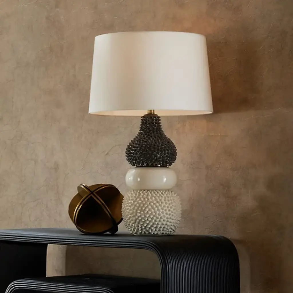 The Basilio Table Lamp from Arteriors fuses transitional style and nature-inspired design. Crafted from ceramic, this table lamp draws inspiration from the delicate spikes of a sea urchin, creating a captivating and organic aesthetic. The table lamp’s body is complemented by a microfiber shade, adding texture and warmth to the design. Equipped with a 3-way socket switch, Basilio is highly versatile, bringing LED light to your surroundings.