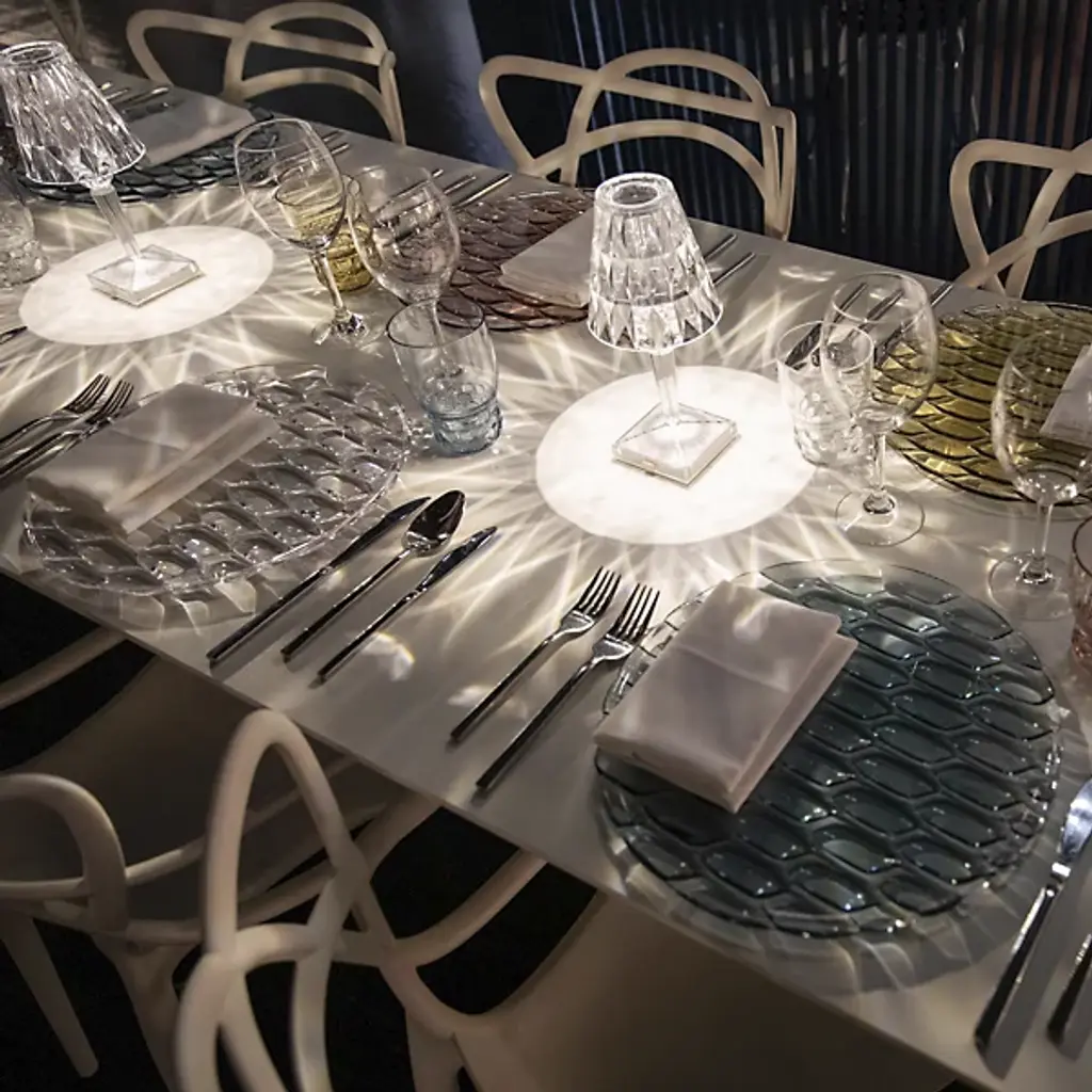 With its faceted shade and base, the Kartell Battery LED Table Lamp sparkles like crystal wherever it goes. However, it's really made out of super-durable PMMA plastic. That and the fact that it's battery-powered (rechargeable via USB cable) makes the Battery a useful--and romantic--little light source wherever you need it.