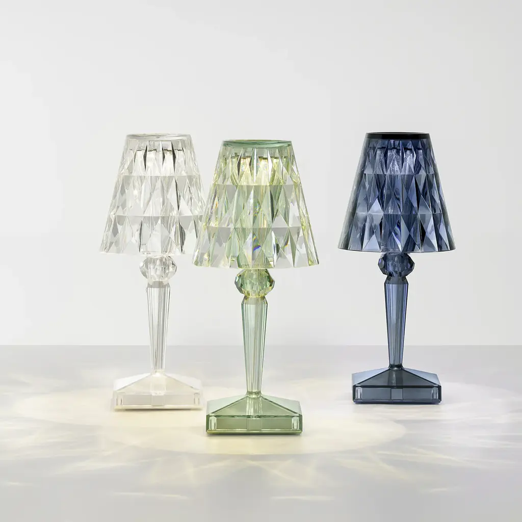 Designed by Ferruccio Laviani for Kartell, the Battery Table Lamp is a compact, yet striking design perfect for a bedside or living room end table. Crafted of molded PMMA, the detailed shade is crafted to appear made from finely cut crystal, emitting a jewel-like pattern of light. Rechargeable and portable, this convenient beauty is ready to accent any space indoors or out.Highlights