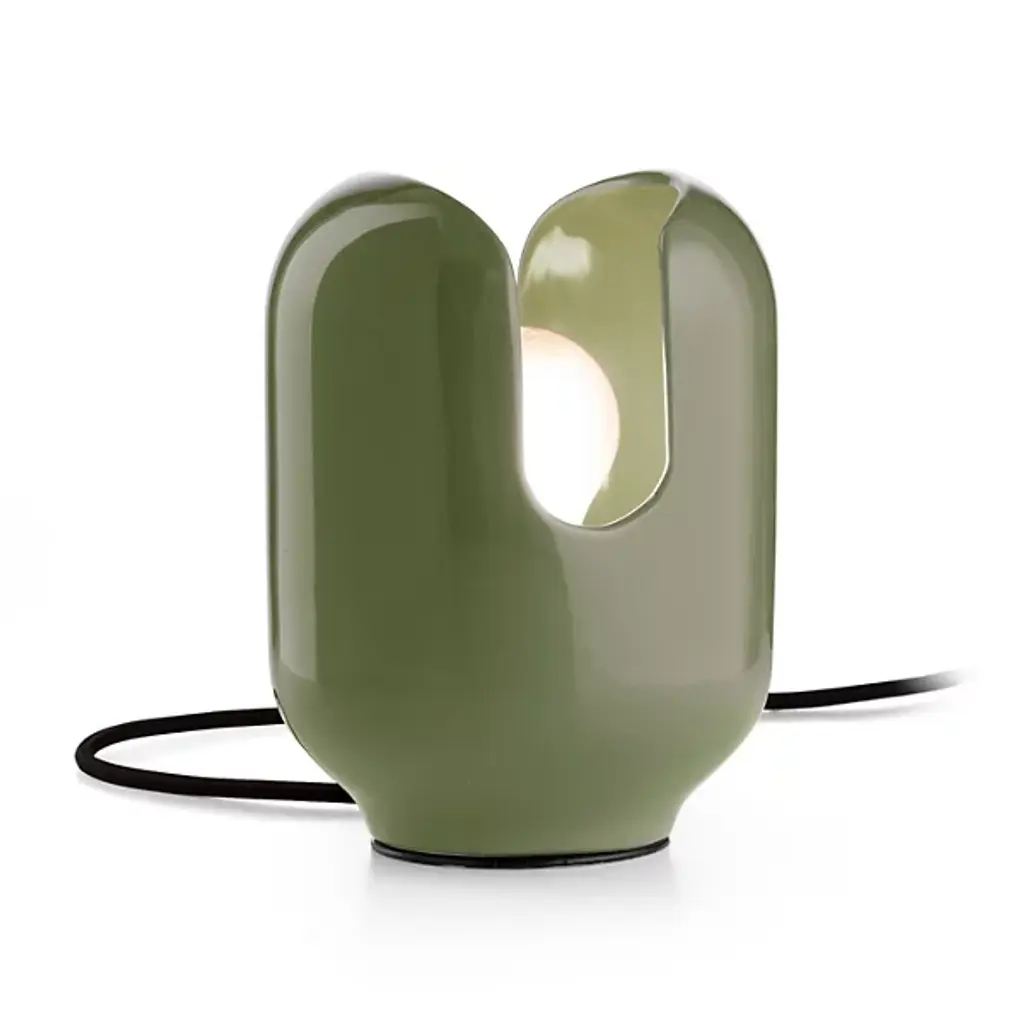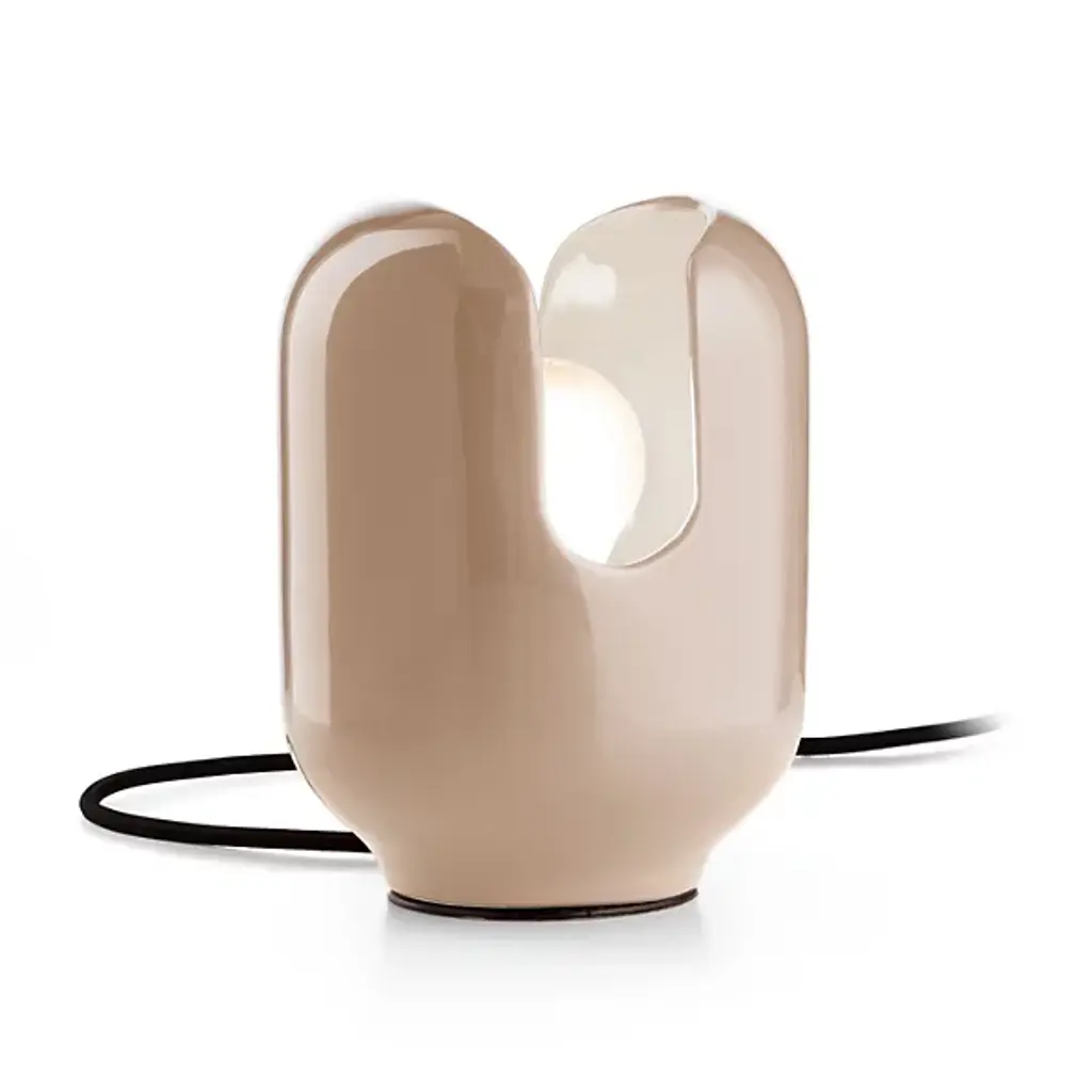Add sculptural elegance to inside spaces with the light-glazed curves of the Batucada Table Lamp from Ferroluce. It’s a marvelous modern design rising from a low-profile metal base. A smooth U-shaped body of handcrafted ceramic partially wraps a lone exposed bulb. The body keeps the bulb’s radiant aura on display from the wide side, while its narrow side helps diffuse the light. The light’s warmth glazes the smooth ceramic form, translating to a lively ambiance.