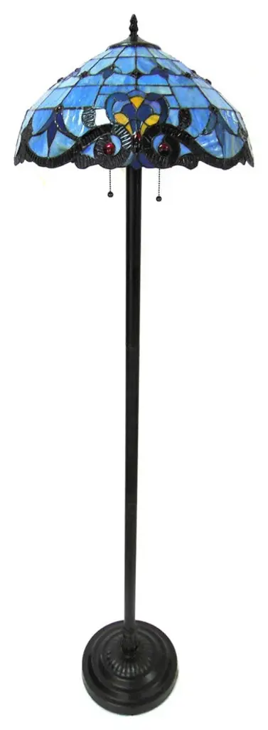 Bavarian is an exquisitely styled Victorian floor lamp designed to reflect warmth to any room. Handcrafted with top-quality materials, the shade is made with intricately cut pieces of real stained glass and designed to enhance any decor. Finished in an antique bronze patina tone, the base design reflects the Victorian era. The shade is hand-crafted, using the same methods developed by Louis Comfort Tiffany in the early 1900s. This process entails using 348 hand-cut stained art glass pieces and 33 glass beads, each wrapped in fine copper foil and soldered together at extremely high temperatures to form each unique piece. The exact size to the nearest inch may vary, and the exact color of each glass piece may vary due to each piece being hand-crafted. The first image is with the light shining through, and the second image is with no light. Dry-listed and recommended for an indoor setting.