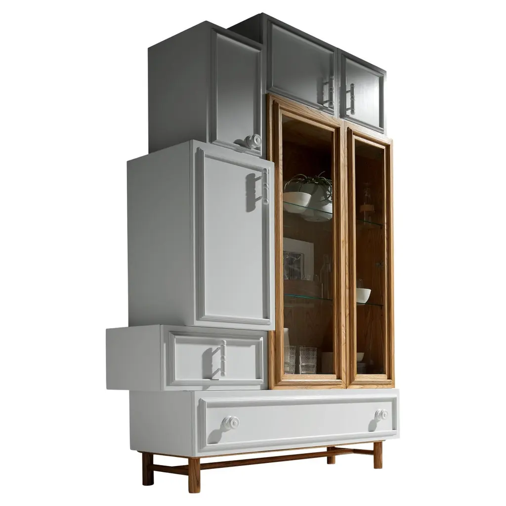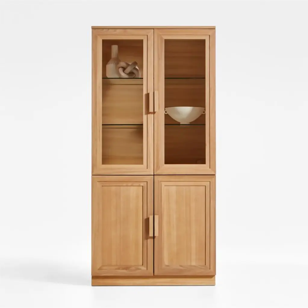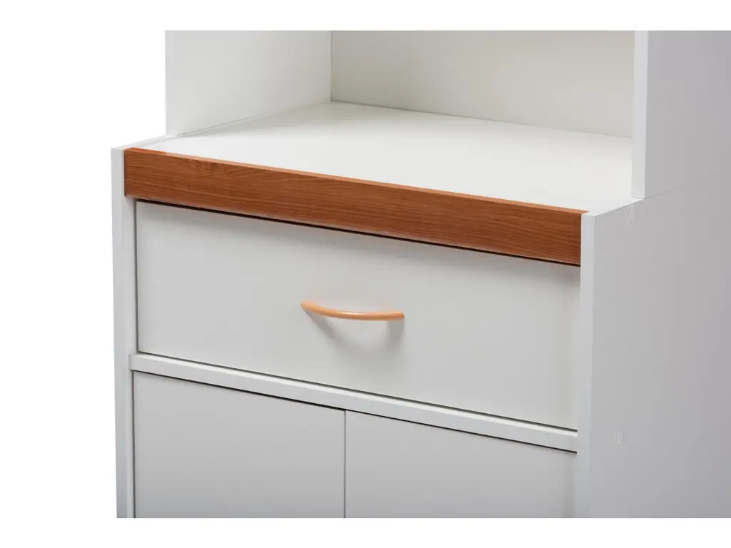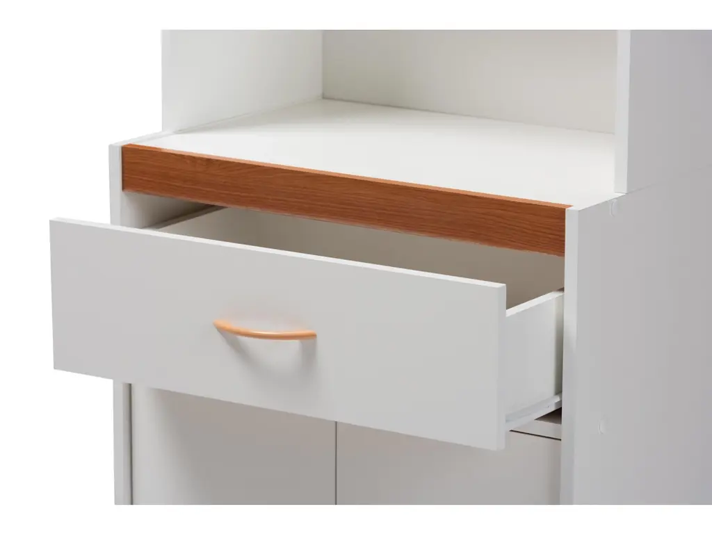 Who says shelving units can’t be chic? This two-tone cabinet provides plenty of storage options. Open cubby space features a cut-out for cord management making it ideal for a microwave or just a small lamp. Upper cabinet doors with glass panels create a distinctive display space, while the pull-out drawer and lower cabinet keep knick-knacks or kitchen essentials neatly tucked away. A wonderful addition to small spaces or anywhere in need of a fresh spin on style.