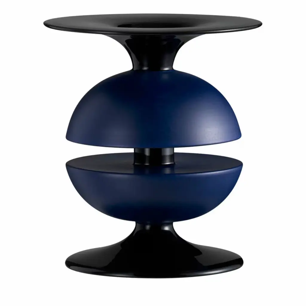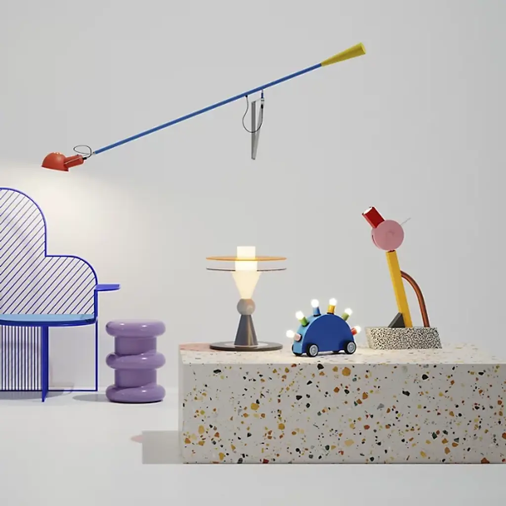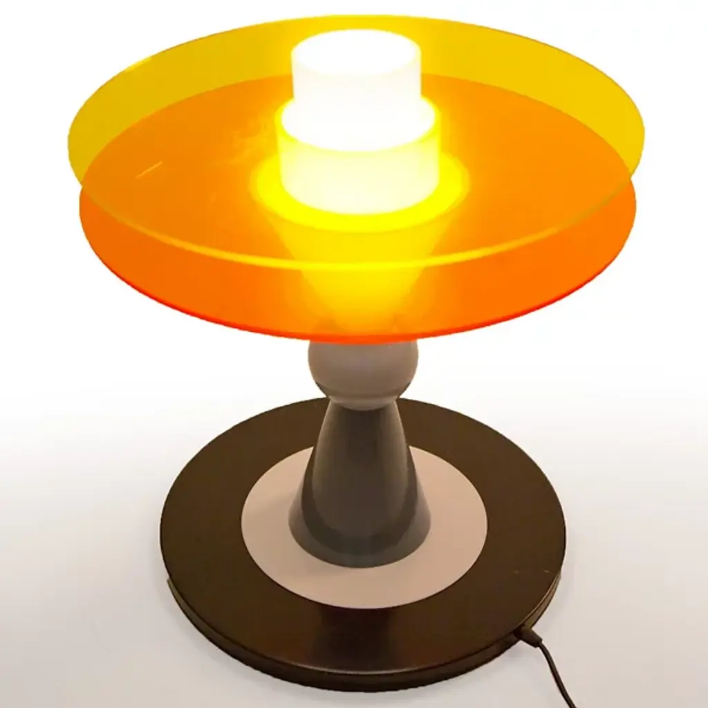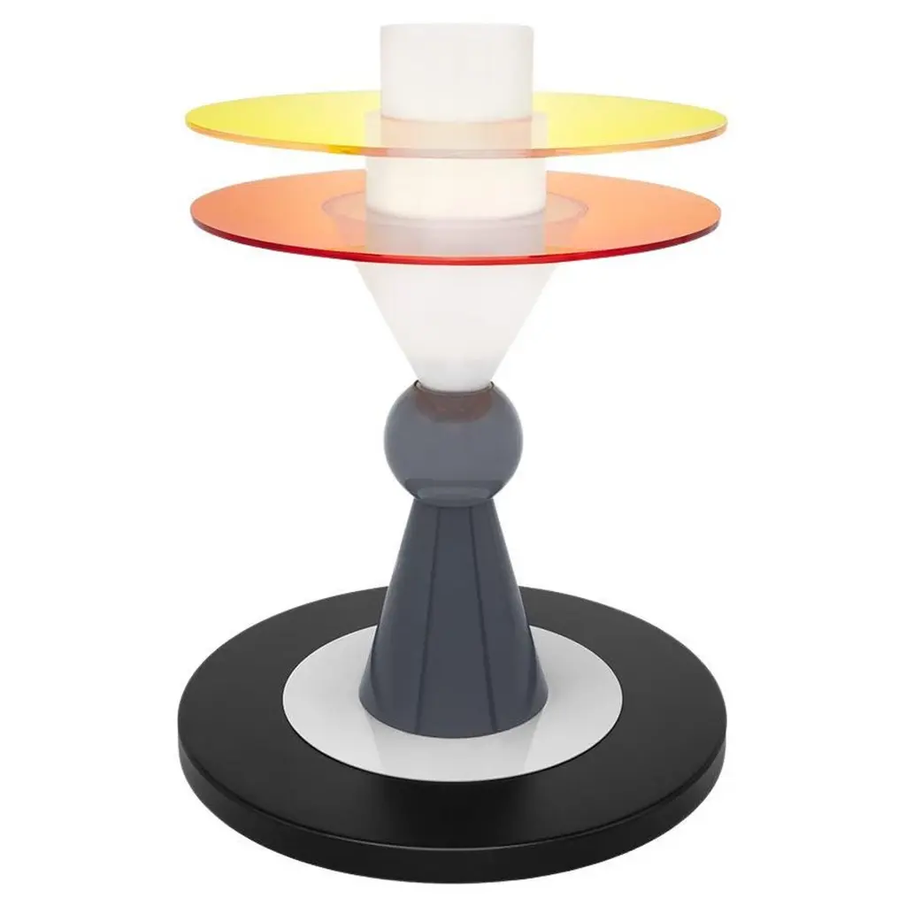 The Bay Table Lamp is an iconic piece originally designed in 1983 by the dynamic Ettore Sottsass and presented by Memphis Milano, a historically sensational creative entity that made its mark on the art and design world in the 80s and beyond. Composed of glass, metal, and perspex, the silhouette is playful and artfully composed. This is a chance to own a piece of art and design history, as each piece is authentically rendered from the same specs and materials as the original release in 1983.