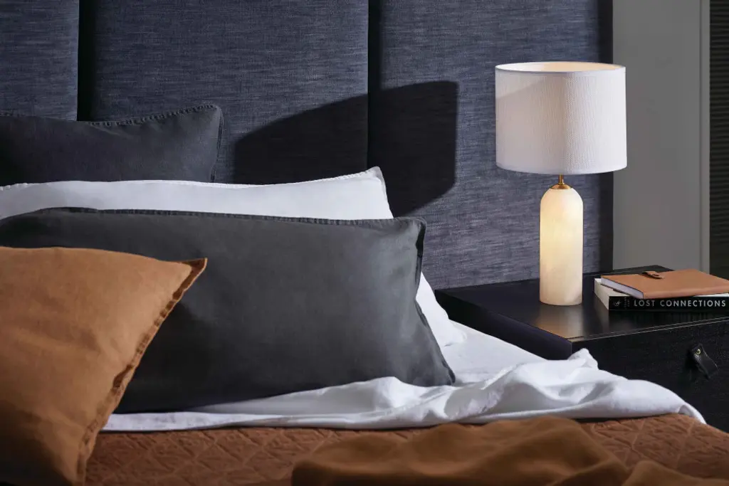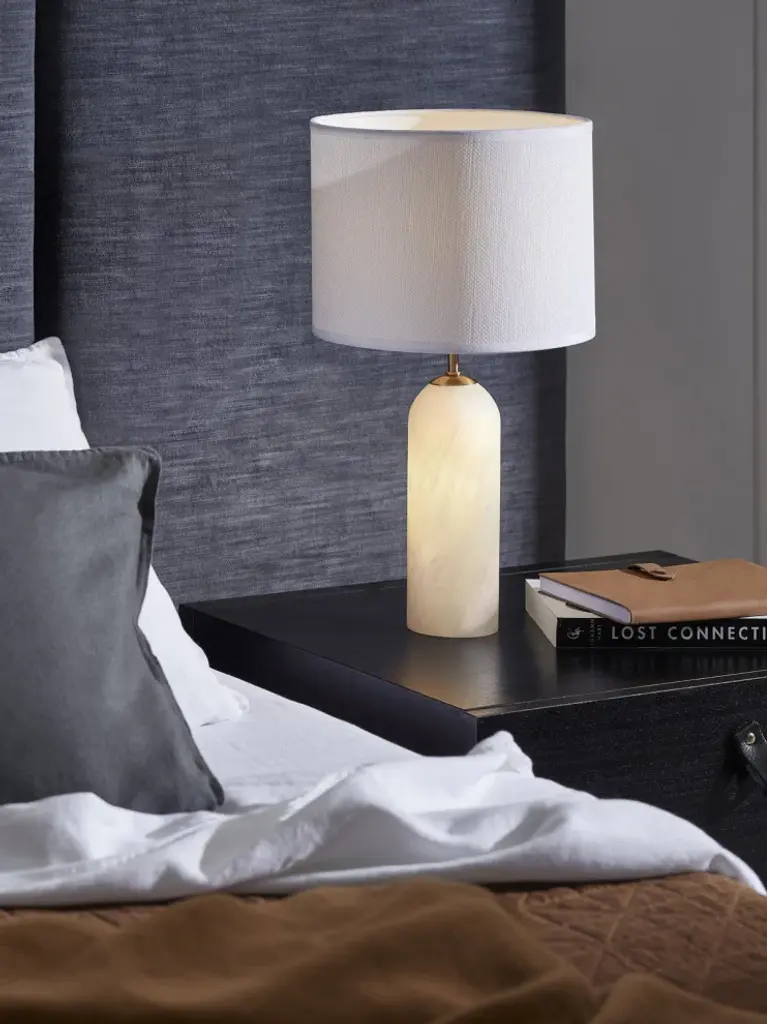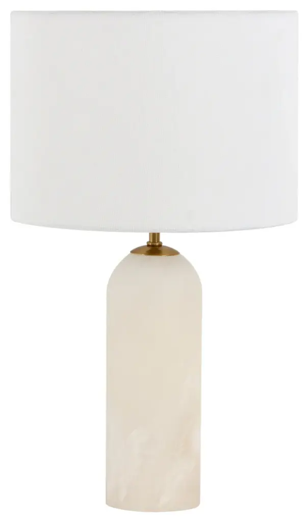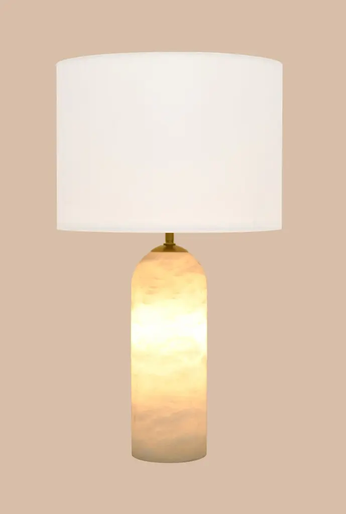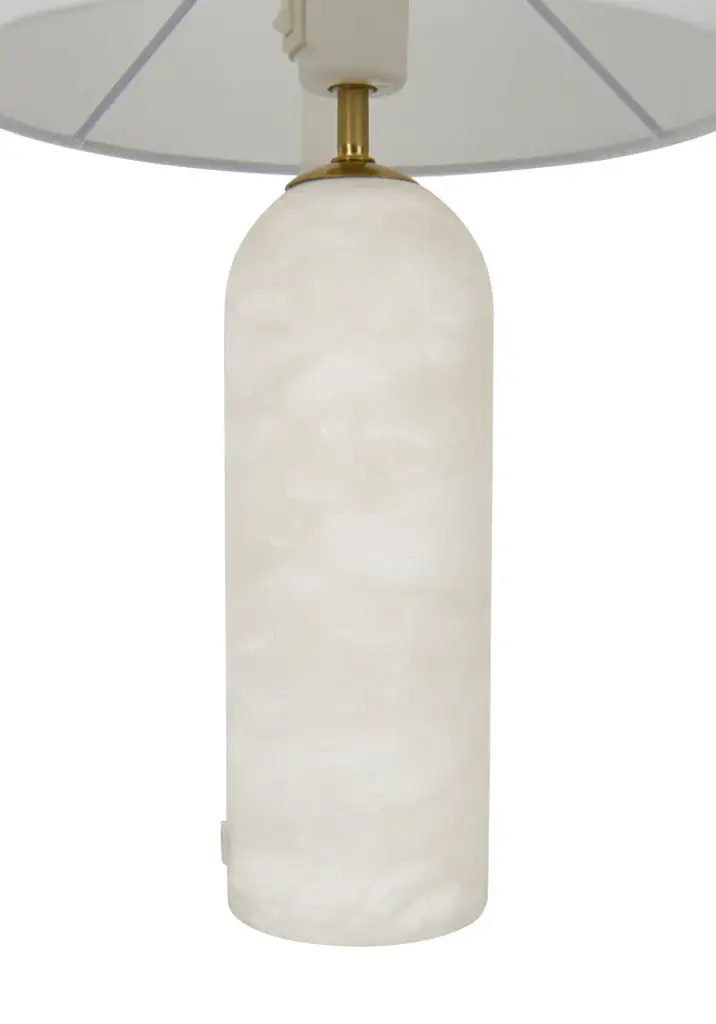 Epitomizing versatility and sophistication, the Firma modern two-light table lamp design is a refined addition to a side table or nightstand. Imbued with the organic elegance of natural Spanish alabaster, the lamp is designed around a capsule-shaped base that glows softly when illuminated from within. On top, a second light is housed under a white linen drum shade, providing ambient illumination for your living area or bedroom. Solid brass details accentuate the warmth of beautiful alabaster and offer a touch of shine for a sophisticated finishing touch. The two lights within this lamp can be illuminated together, or you can choose to only illuminate the base of the lamp for a soft glow perfect for relaxing ambiance.Features:Two lights are controlled separately to light the base and shade together or just the baseAlabaster stone is naturally sourced in Spain for exceptional qualityClassic white linen drum shade assures inviting ambiance and bright, diffused illuminationSolid brass details add a touch of warmth and sophisticationNatural Spanish alabaster features slight variation in pattern that are to be expected and offer unique character