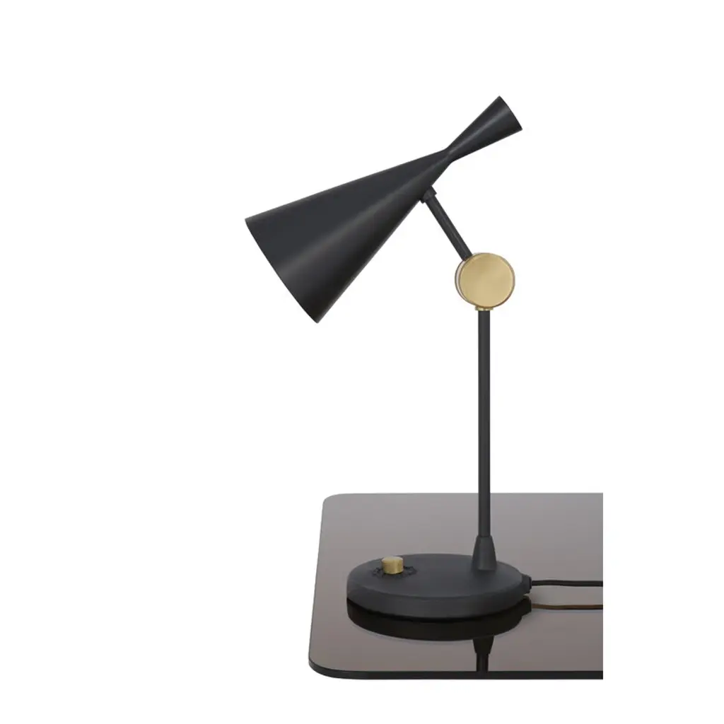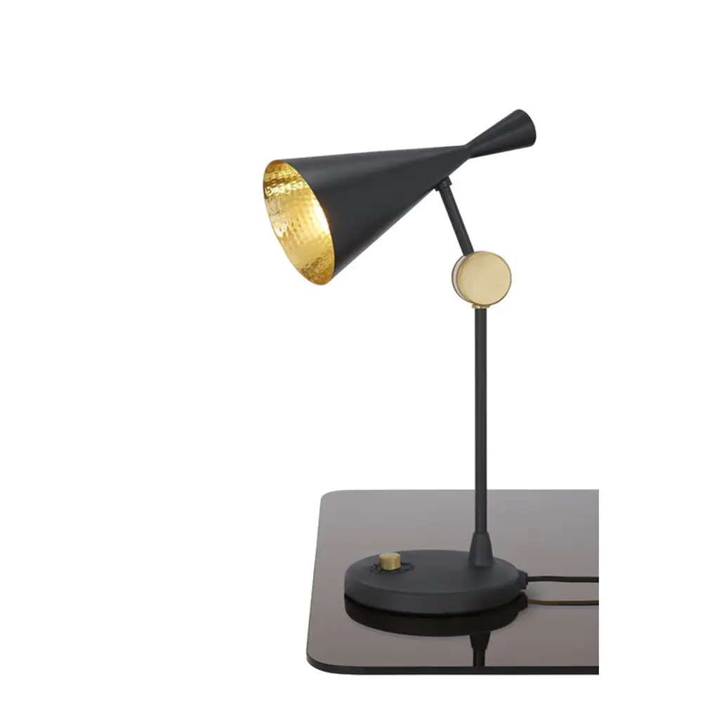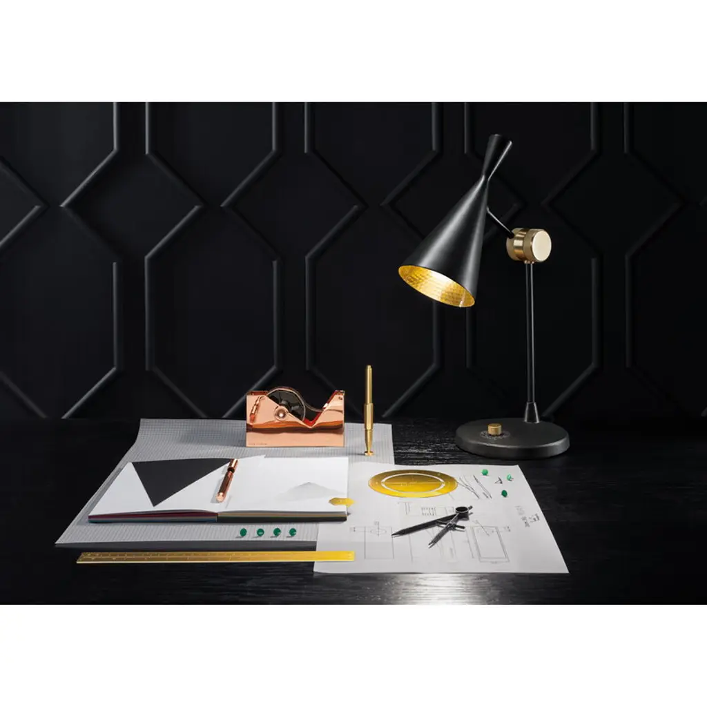 Tom Dixon's Beat table lamp is a member of the sculptural lighting collection inspired by traditional Indian water vessels. Handcrafted of solid brass by local artisans in Moradabad, Northern India, which is known for its rich tradition in metalworking excellence, the elegant table lamp has a smooth exterior in black and its interior is defined by golden sheen and a unique hammering pattern. The Beat table lamp features an integrated LED module that reflects soft and warm light.