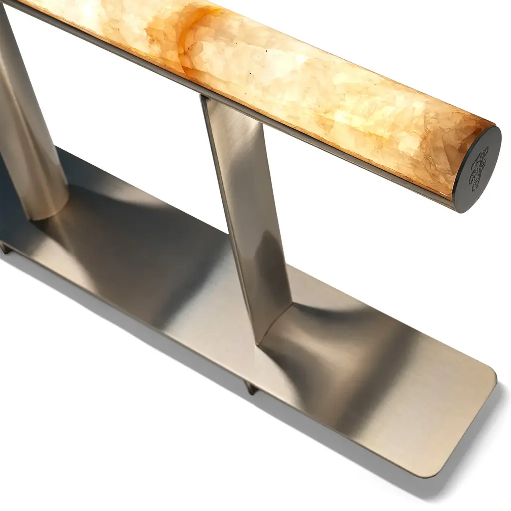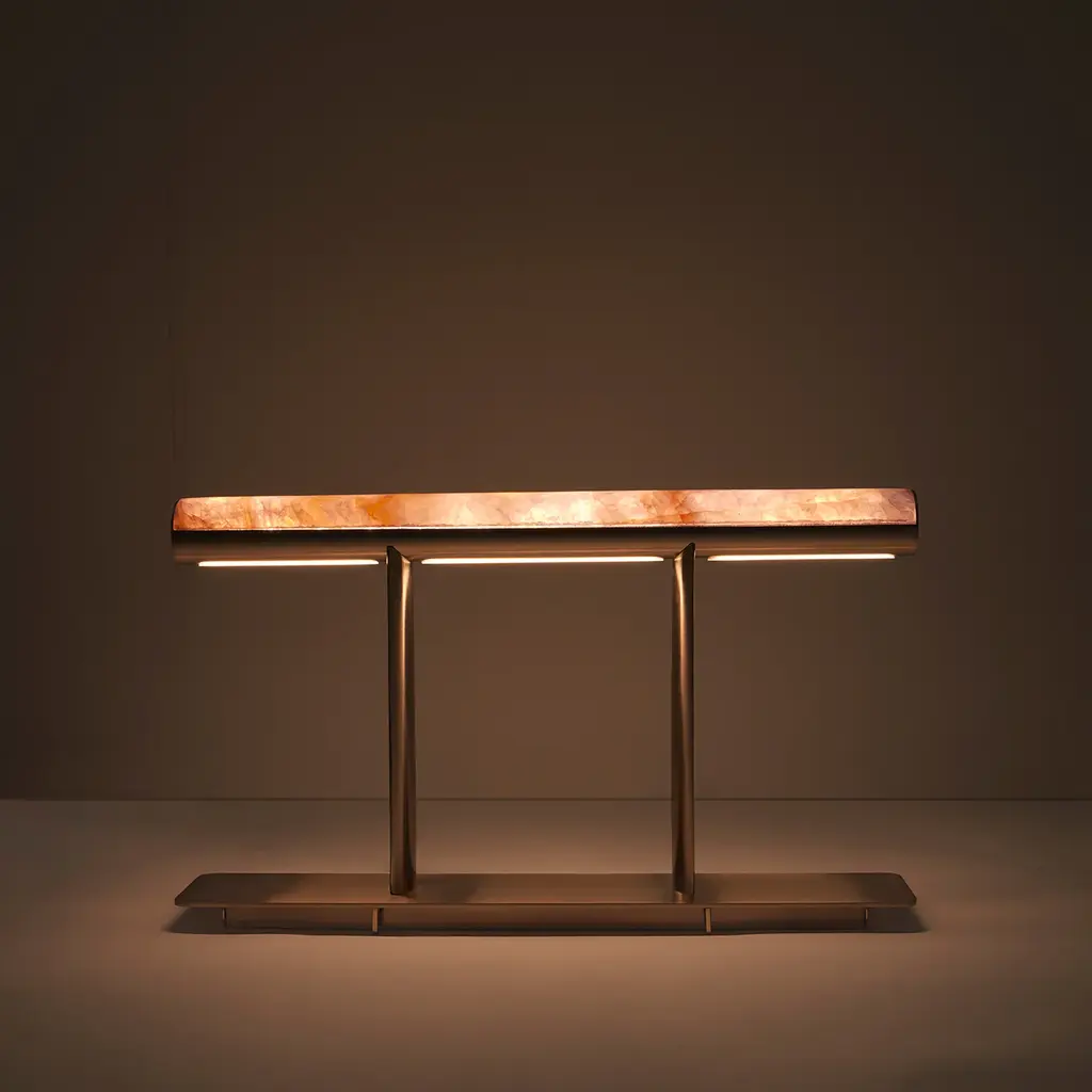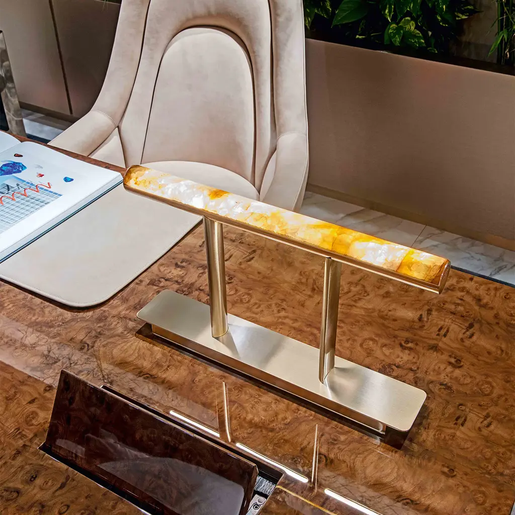The Beatrice table lamp exudes elegance with its satin gold-finished metal structure. Its central light diffuser is enhanced by a stunning insert of natural stone in warm, earthy tones, creating a harmonious blend of luxury and nature-inspired design.