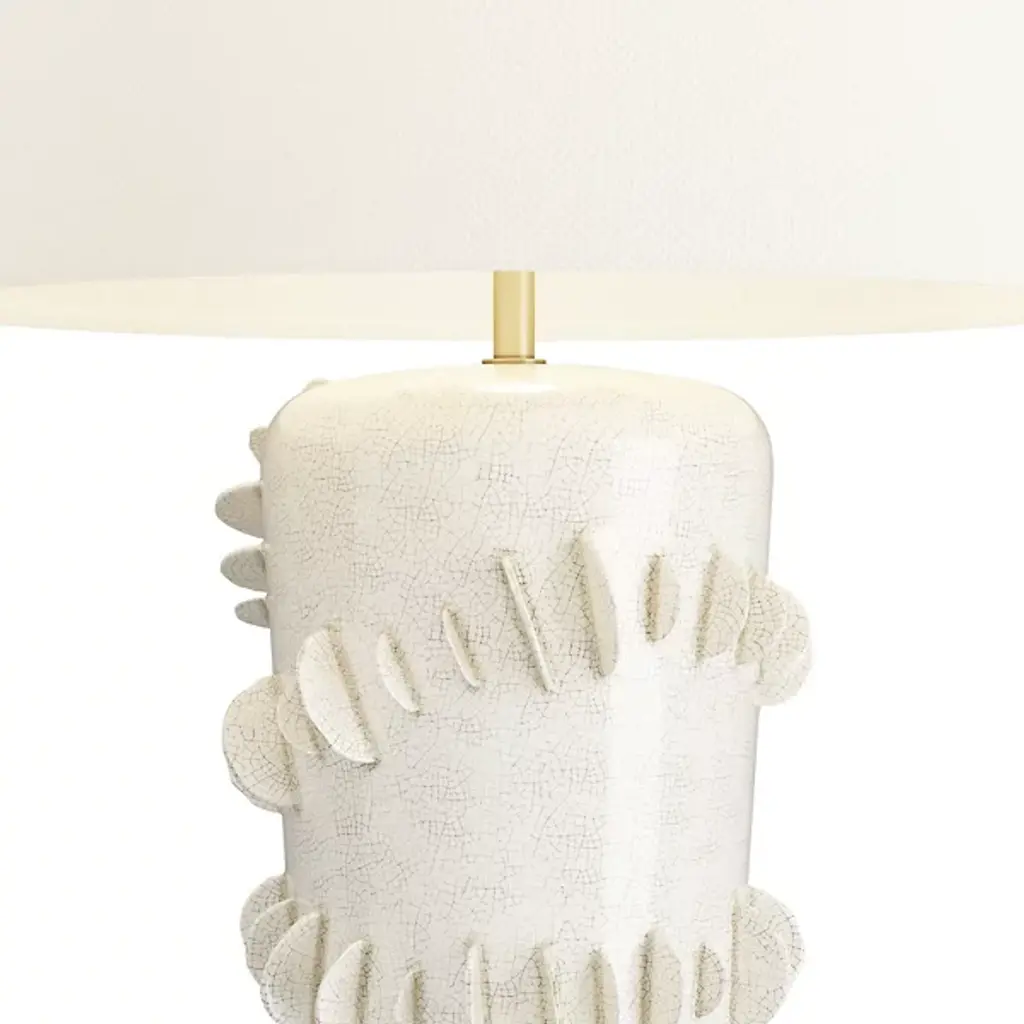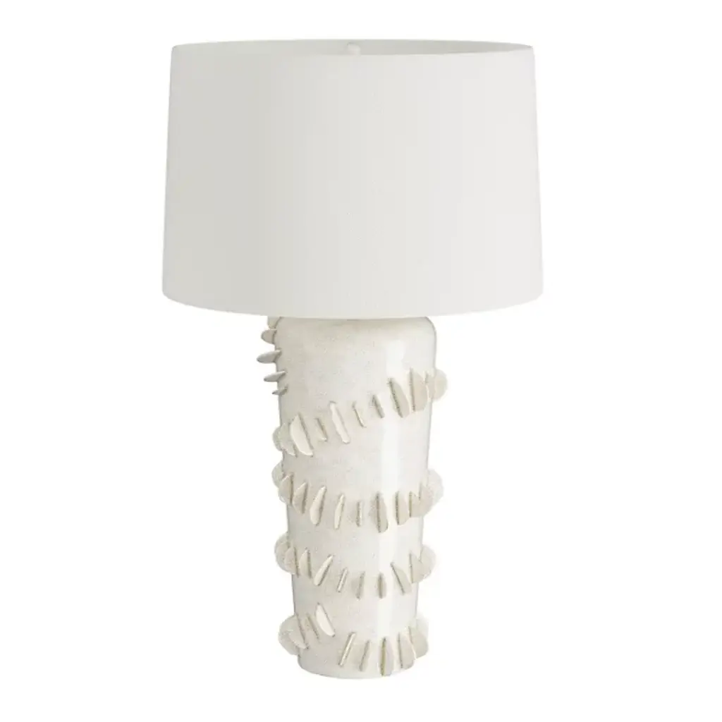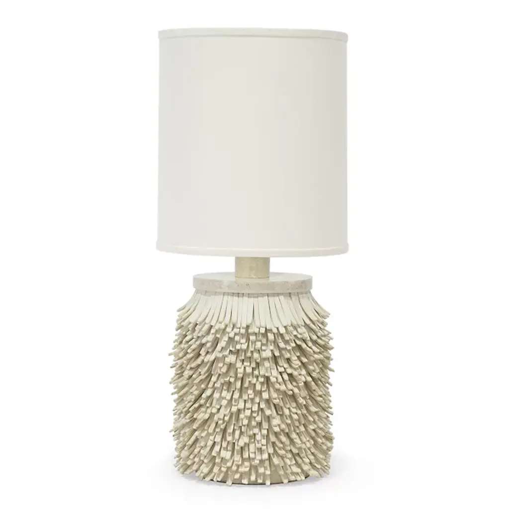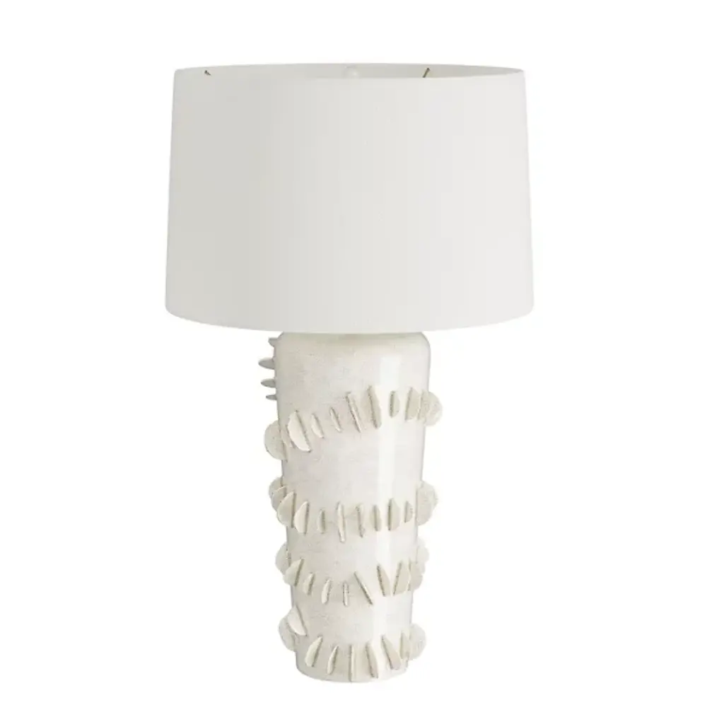 Drawing inspiration from the graceful lines of aquatic plants and coral, the Beatrix Table Lamp from Arteriors is a masterpiece in ivory ceramic with a delicate crackle finish. Its base features hand-applied "fins," adding captivating texture, while the ivory drum shade is adorned with a matching ceramic finial. Enhanced with antique brass hardware, a clear silver cord, and a three-way rotary switch, this lamp brings a touch of the sea's elegance and organic beauty to your space.