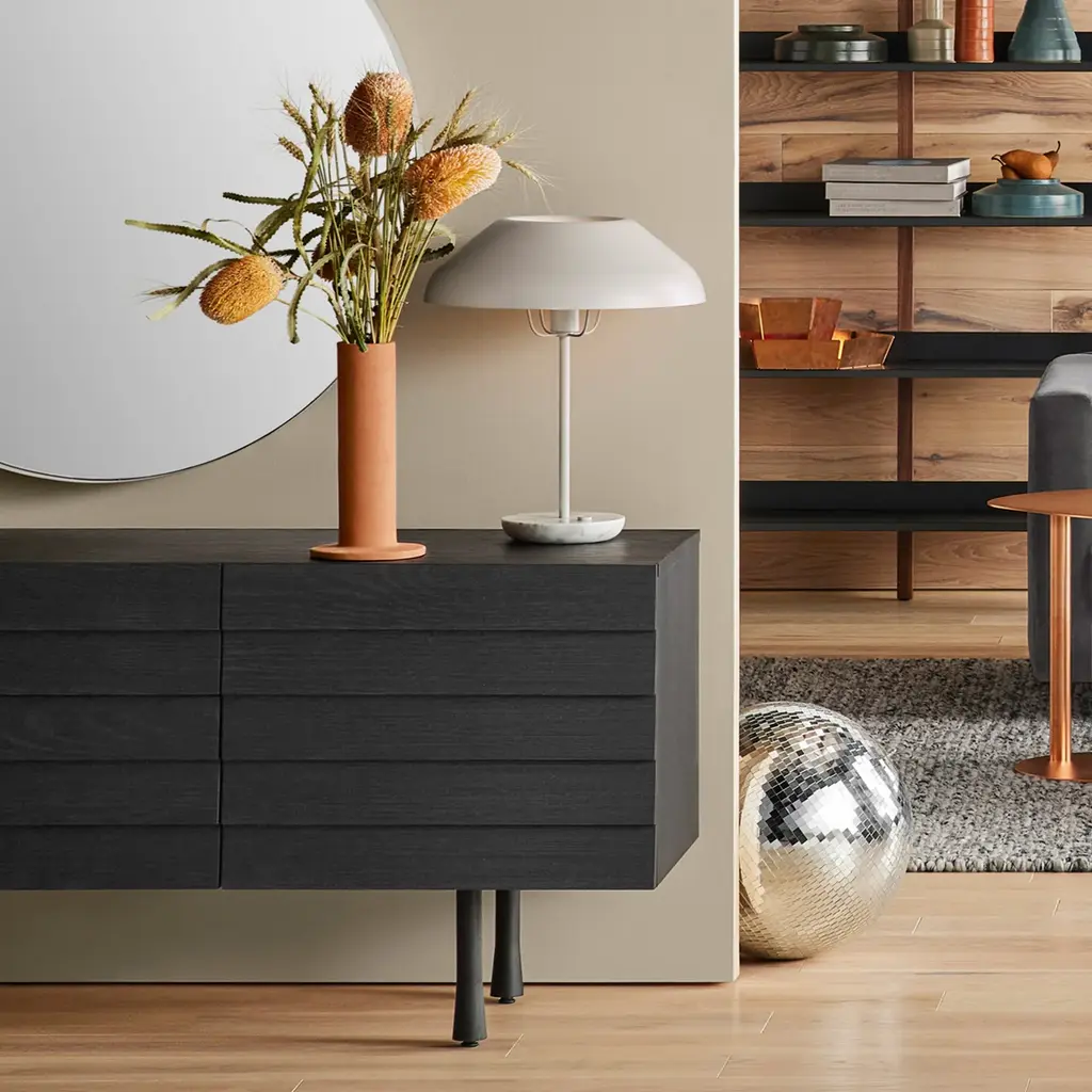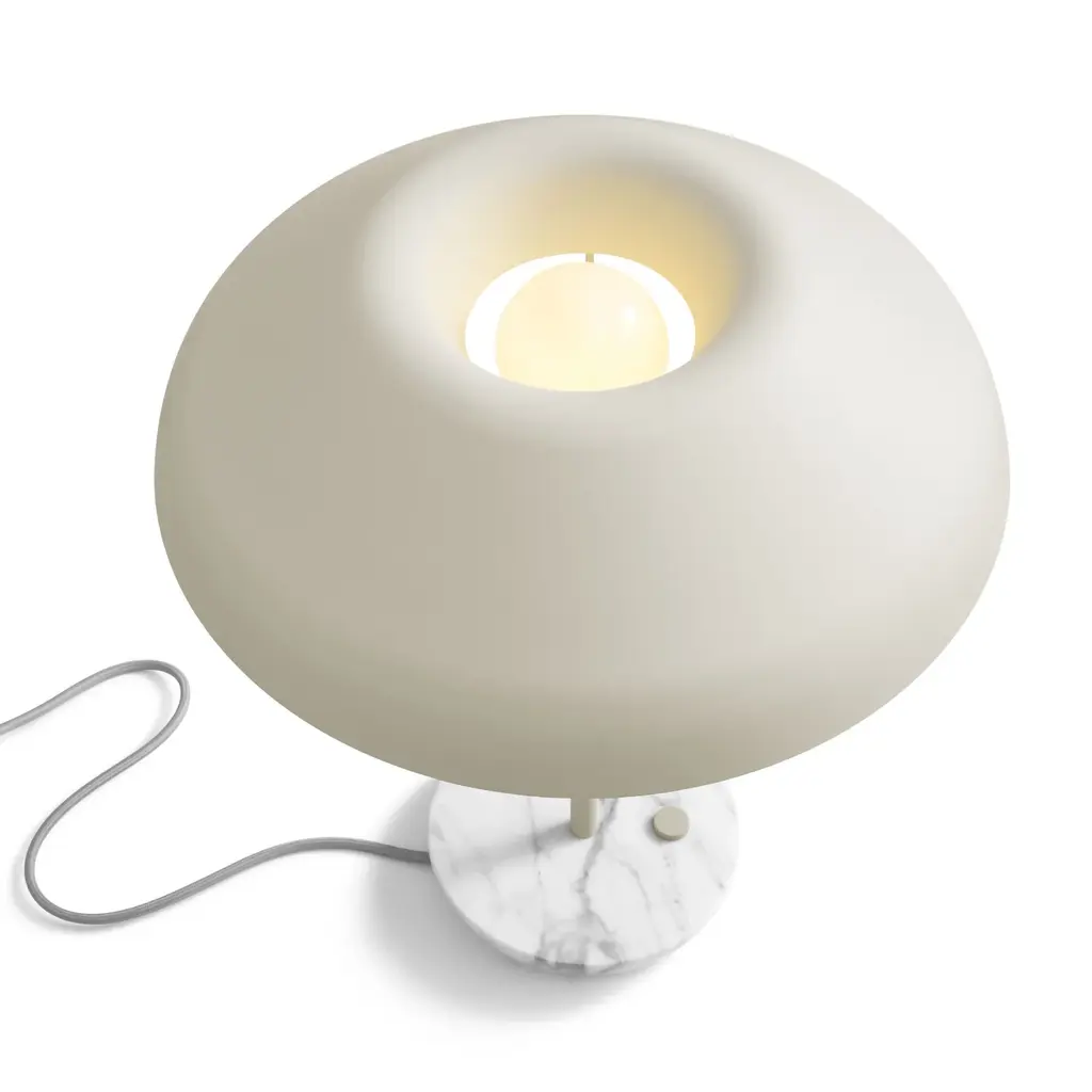 A rounded marble base is the foundation for a great relationship with your table, desk, credenza, you name it. Slender stem and genial steel shade provide charm and three levels of brightness with the touch of a finger. Also available in floor size.