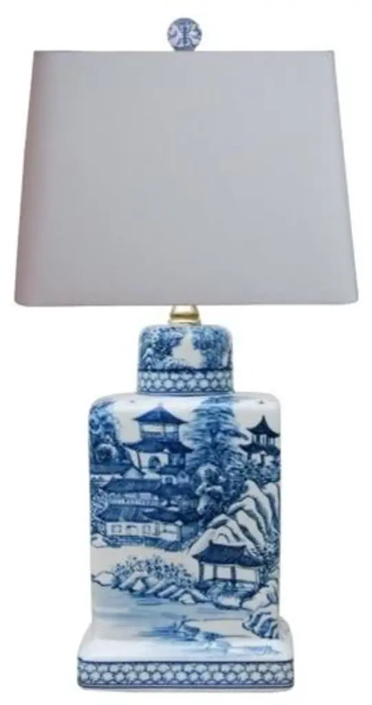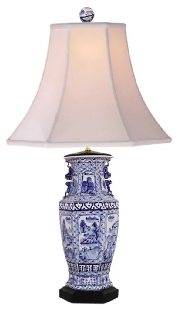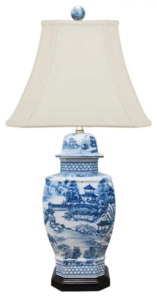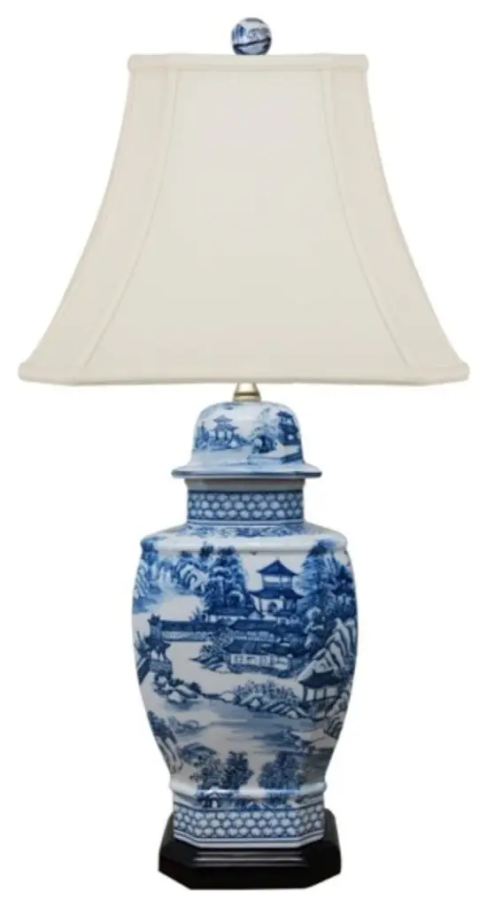 Please note : As most of our porcelain pieces are hand made and hand painted they may be slightly different from the photo in both shape and the way it is even colored! We do our best to find the one that is most common but sometimes they will be slightly different. Beautiful Chinese Blue and White Blue Willow Porcelain Temple Jar Table Lamp 22" Country of Origin: China Dimensions (in inches): Height: 22.5" Length: 11" With shade (Max Watt 100) Bulb not Included UL listed Supports 3 Way Bulb