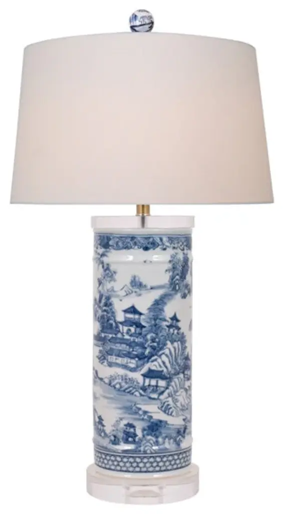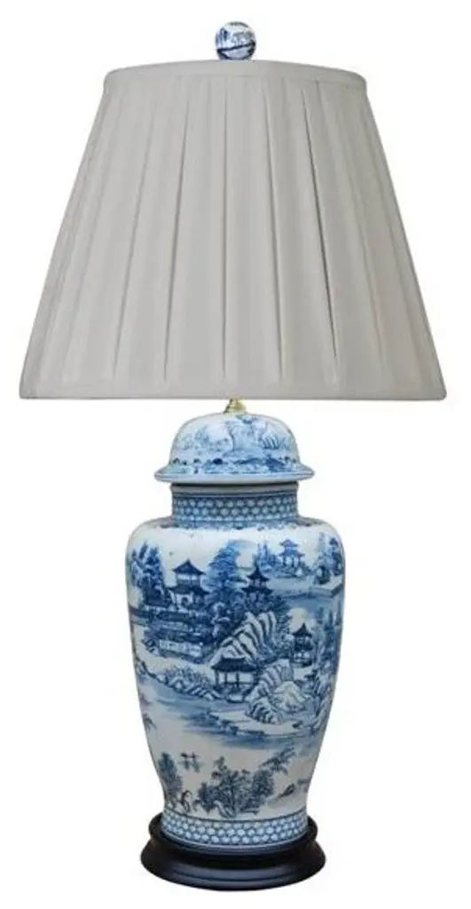 Beautiful Chinese Blue And White Blue Willow Porcelain Temple Jar Table Lamp, 22