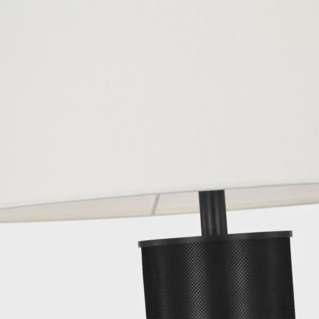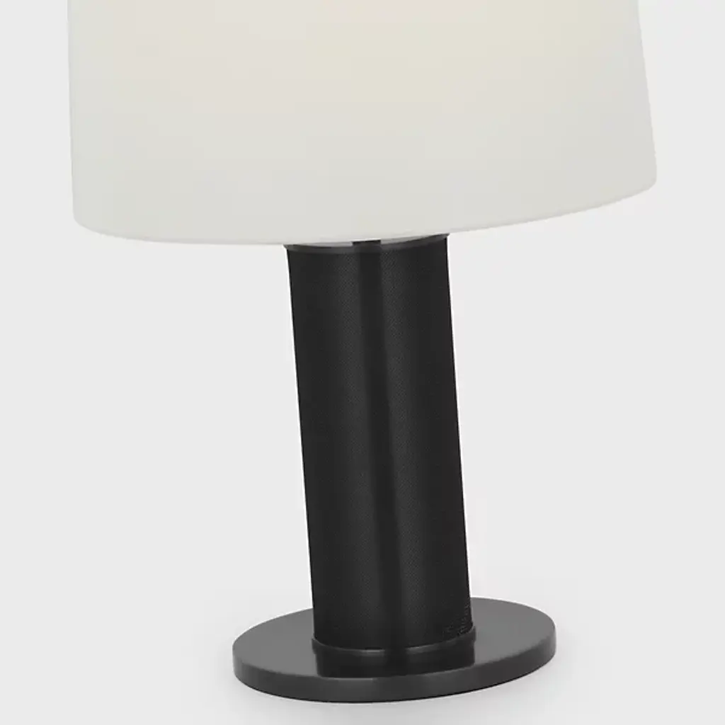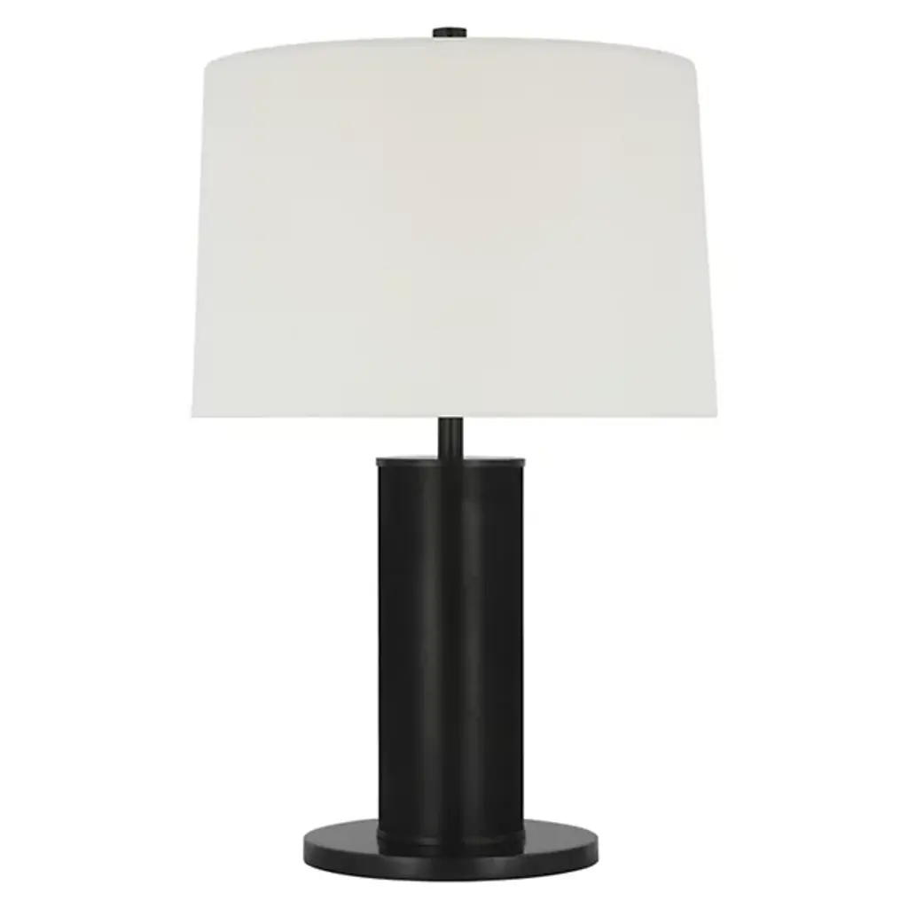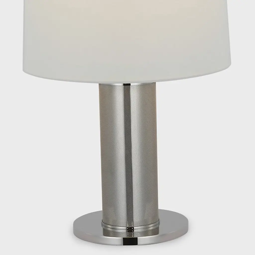 The Beckford 22" Table Lamp from Visual Comfort Signature exemplifies Ralph Lauren's approach to refined lighting design. The cylindrical base features a knurled texture that adds tactile interest while maintaining a strong architectural presence. A circular platform grounds the lamp, creating a stable foundation that complements the base's vertical lines. The linen shade provides balanced lighting while softening the mechanical precision of the metalwork below.