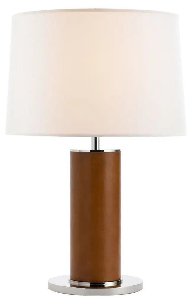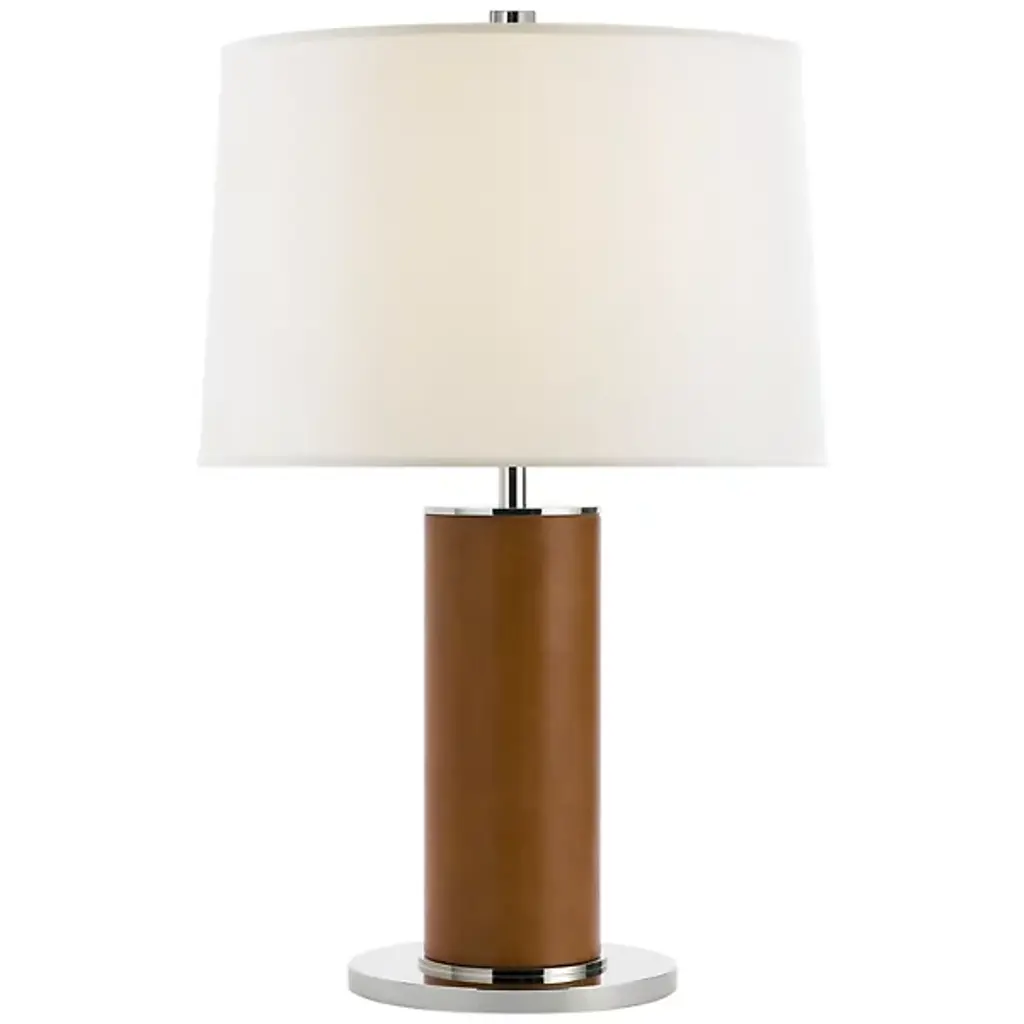 Natural warmth balanced by modern lines. The Beckford Table Lamp by Visual Comfort Signature, formerly known as Visual Comfort, is a chic accent piece for the eclectic home. Designed by Ralph Lauren, this piece begins at a smooth, circular base that holds a robust cylindrical body wrapped in leather upholstery for a textural element. Its open-top linen shade surrounds a single incandescent bulb, softly diffusing its light and adding a crisp contrast to the piece.