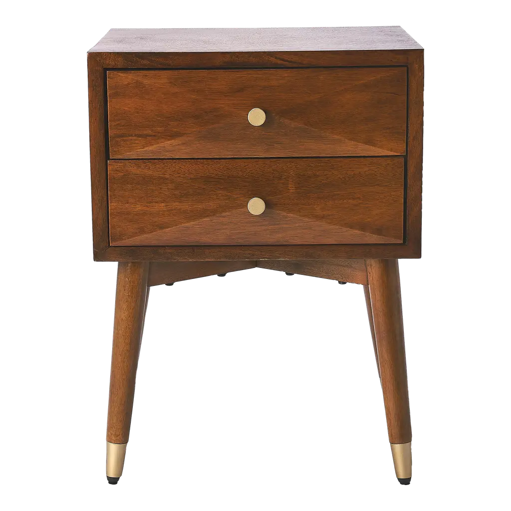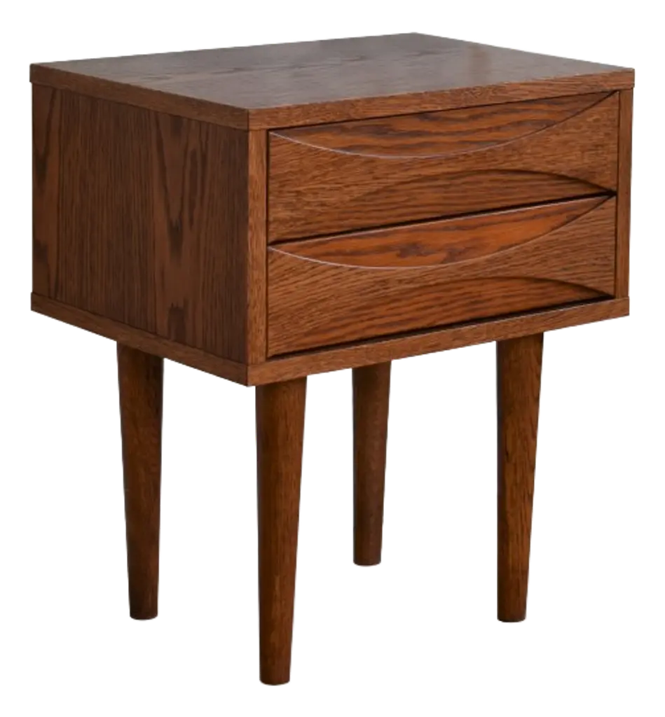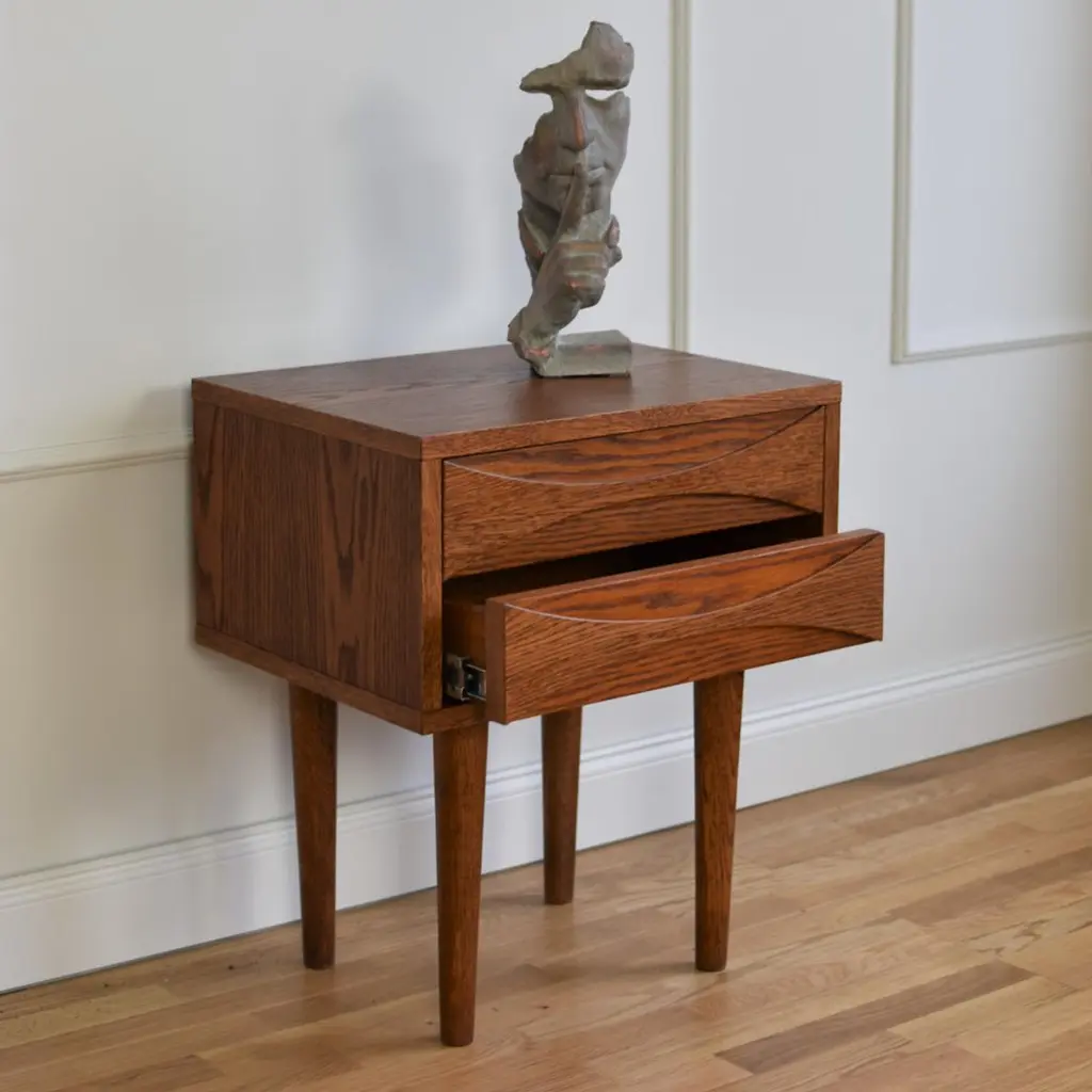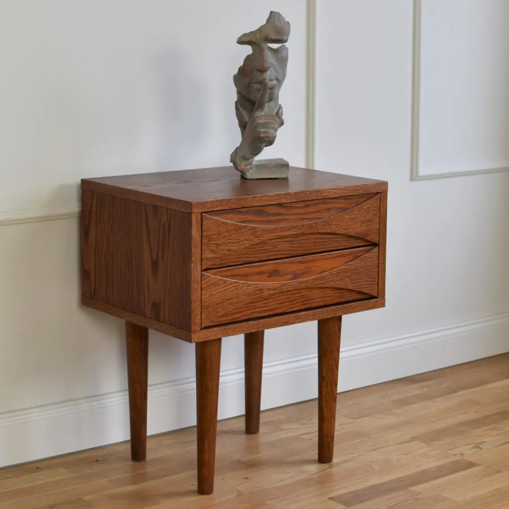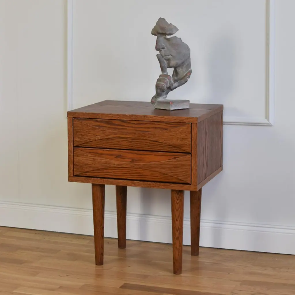 Bedie Vela Bedstand by PastformDimensions: D 35 x W 45 x H 54 cm.Materials: Stained and varnished wood.Available in different wood color finishes: Whiskey, Rum, BPA, Nobel, Brandy, Schwarz, Cognac, Honig, Nevada, Dunkelbraun, and Natura. Please contact us.A bedside cabinet is a piece of furniture that is both useful and decorative. It is useful when we want to have a glass of water at hand at night or in the morning. We put on it piles of books and magazines that we like to read, glasses, cosmetics, and other small items. Therefore, it is important that there is a lot of space inside and outside. Bedie Sils retro bedside cabinets have been created for those who need some more space. They have two drawers and a large top, on which you can put a bedside lamp and a flower pot, and still, there is a lot of space for other items.Bedside cabinets do not necessarily have to stand in a bedroom. The Bedie Vela is so versatile that it can be successfully placed in a living room or a hallway. Its drawers can be opened with recessed round handles in a contrasting black color.The furniture is entirely made of wood covered with oak veneer. Our furniture is made of only natural materials, so individual models may differ in the arrangement of grain and color. Bedie Vela Bedside Cabinet is finished with stain and varnish.Rooted in a good traditionThe Pastform Furniture studio dates back to the 1990s. Having in mind the idea of a traditional family company, Dawid Gełeta established a carpenter’s shop in 1997. The company specializes in the manual production of utility furniture. Times have changed and with them, fashion has changed. In 2016 we decided to change the direction, following the growing demand for vintage furniture.My name is Mateusz Gełeta, I am the son of the carpenter who founded the company. From an early age, I have watched my dad’s work. He put his whole heart into creating furniture, polishing every detail with his strong hands and making sure that nothing escaped our attention before sending the product to the customer. He made sure that every piece of furniture was perfect and refined. We remain true to these principles.Following the blow, I decided to create a harmonious combination of modern quality with the classic style of the 1960s. This is why I designed and created a unique collection of wonderful furniture, which, in addition to its well-thought-out functionality, also creates a perfect design and composes original arrangements.The golden age of interior designIn the 1960s interiors used to take on a very characteristic touch. All over the world, this style was called a mid-century modern, locally it was simply – retro furniture. Simple, elegant minimalistic form, without unnecessary decorations and splendor. Decorating with the idea of an uncomplicated composition, it allows for an undisturbed selection of the arrangement accessories and emphasizes a high level of functional comfort. One might say – a perfect piece of furniture. Comfortable, hiding surprisingly many items despite quite neat dimensions, made of noble species of wood and created by hand, with a focus on carefully refined details. No wonder its popularity is growing so much.Unique, refined, with a soulEach piece of the Pastform collection represents a unique style. Thoughtful concept of usable comfort, refined details, carefully selected raw materials, and proven accessories. We use only high-quality boards which we veneer with oak, American walnut, and other durable wood species. They are carefully oiled with the best, hard, ecological oil waxes, giving the furniture its final shape. This technology brings out the natural beauty of wood, exposes the grain and unique design of each piece, highlights the beautiful color, and allows to achieve timeless durability.This is how unique, thoughtful, and refined furniture with a soul is created.Thinking about futureWe are trying to positively create the world of which we are a part, contributing to a better tomorrow. We cooperate with local suppliers, support small companies and production plants, care for ecology, and respect the needs of the land. We always strive to establish long-lasting, based-on-trust relationships with customers and contractors.Flexible, with openness and heart on handWe sincerely like what we do. Playing with the shape, structure, and texture of wood is fascinating. Creating new arrangements and coming up with innovations that will meet your expectations. We are proud of our products and we are happy to present you with our collection of refined furniture.All our vintage furniture can be made on request – fulfilling the boldest dreams and fantasies. See our offer and if you want to know more, feel free to contact us. We are waiting for you!