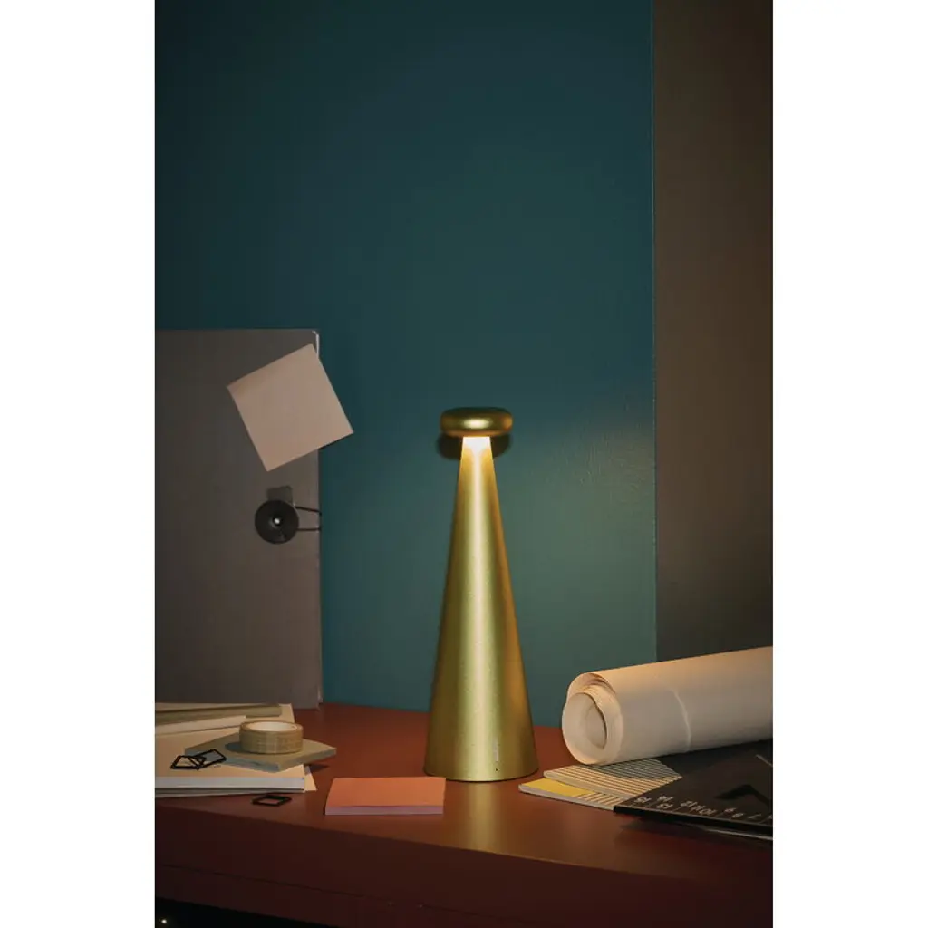 Alessi’s Bedin portable table lamp by Allesandro Stabile turns the proportions of a classic table lamp on their head: instead of a prominent shade, the most eye-catching feature is its sculptural, cone-shaped base that flares downward. The minimalist upper part houses the light source and functions as a dimmer switch – simply rotate the small, round top to adjust brightness and color temperature. Casting a soft, downward glow onto the base and table surface, Bedin creates a cozy atmosphere at the dining table and works equally well on a side table or nightstand. Made of anodised aluminum, the rechargeable lamp is lightweight and easy to move. It comes with a charging base and USB-C cable, and provides up to 30 hours of light on the lowest setting.
