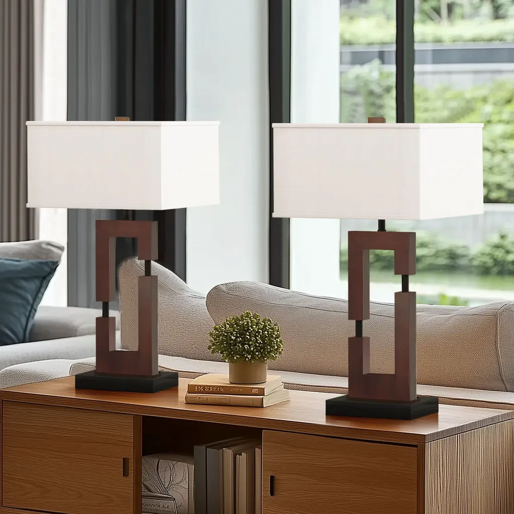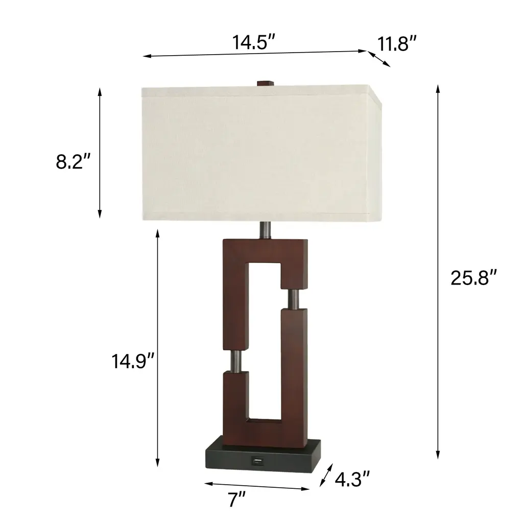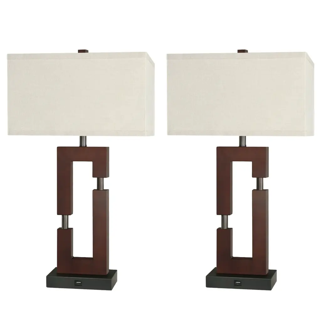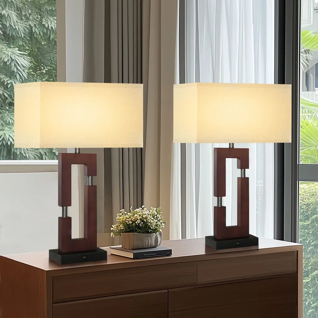 Representative of minimalist art, this set of two table lamps has brought you brand-new visual art. Its frame-like lamp body and dark wood pattern, specially made with resin and metal, show the beauty of the line. Perfect for modern decoration at home or office. White linen effectively covers the light bulb and makes it a great luminary. Besides all that, it comes with a very convenient USB port, which allows charging devices while using the light.Feature:Highlight: