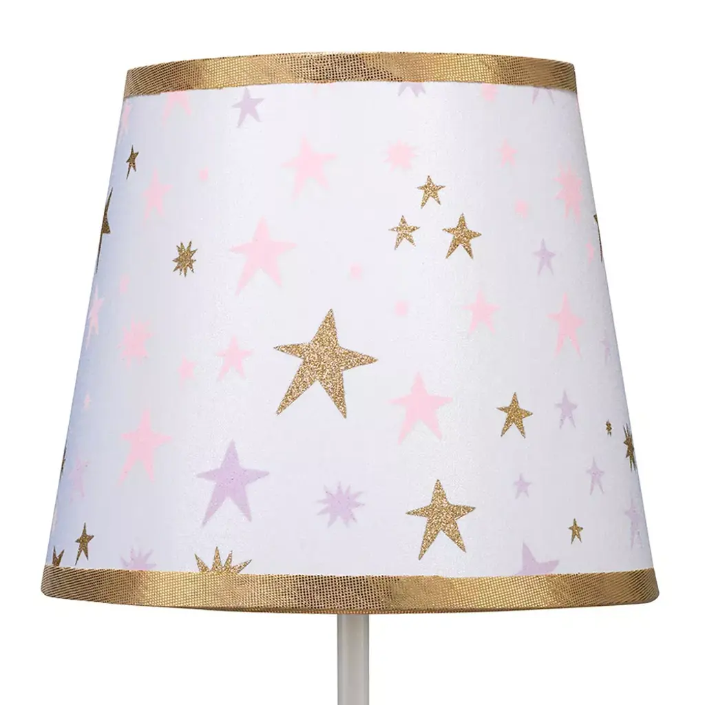 Add a soft glow to your child’s room with this adorable resin 2-dimensional Rainbow Unicorn lamp and shade. Pearl, our sweet little unicorn is white with a pink mane, gold metallic hoofs and horn and is sitting on a pretty pink base. The approximate height of the lamp and shade is 11”. The lamp shade is on a white ground with pink, lavender, and gold stars. A long-lasting energy efficient light bulb is included. It is a 5-watt LED bulb equivalent to a 40-watt incandescent bulb.