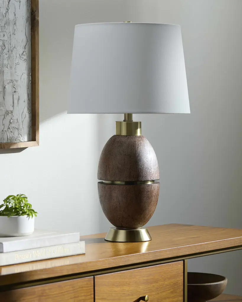 Collection: Begunitsy Colors: Dark Red, Metallic Gold, White, Metallic - Brass, Translucent Material: Body: Resin / Base: Iron / Shade (Outside): Linen / Shade (Inside): Linen / Finial: Iron Styles: Traditional Made In: China Lighting Type: Accent Table Lighting Base: Iron Base Color: Metallic - Gold Shade Material: Linen, Linen Shade Color: White, White Cord Length: 6' Switch Type: 3-Way Number of Bulbs: 1 Socket Type: E-26 Bulb Wattage: 100W