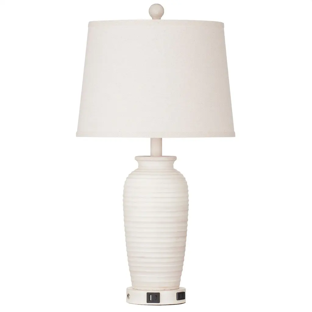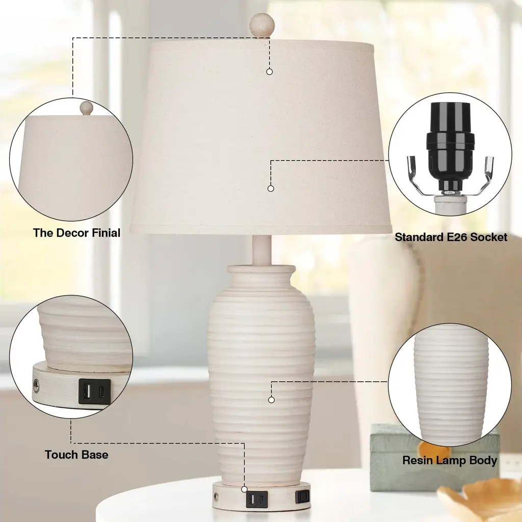 Clay pot sculpt table lamps with drum shade and modern practical functions. Resin material with beige provides better visual experience. Pair with white fabric shade, it can be integrated with a varitety of interior decoration styles. The shade is knockdown for convenient clean. Beige harp to fasten the shade. The lamp holder is bakelite. Turn it on, color temperature is 2700K. It shows the warm light and can built a cozy ambience. Especially, the lamp base comes with built-in multifunctional module for smart devices. For example, one USB charging port, one type-C charging port and one AC outlet. And you can still use it no matter the lamp is ON or OFF. The full lamp height is up to 24.3''. It can be a necessary part of your room and light the room up for more comfortable.Overview of features: