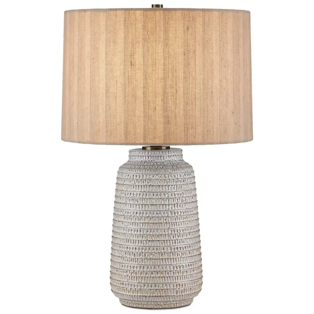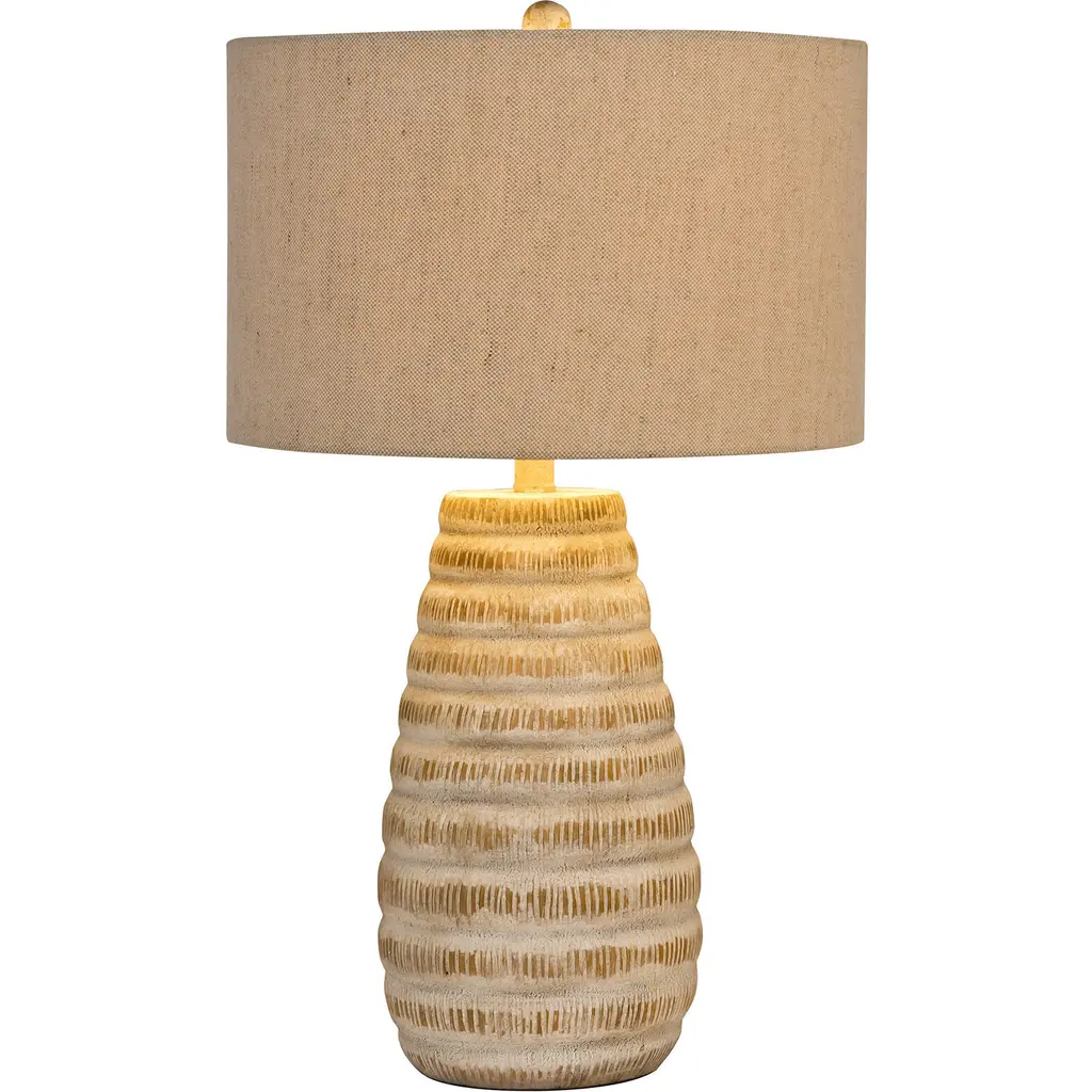 With hundreds of etched markings on the base and a bulbous silhouette, this lamp invites a sense of aged charm to a modern decor. This 26.5 lamp is crafted with a resin base that showcases a distressed white and tan finish and paired with a hardback fabric drum shade in a beige textured hue that allows for ample light, and accommodates one 60W 3 way bulb (not included).