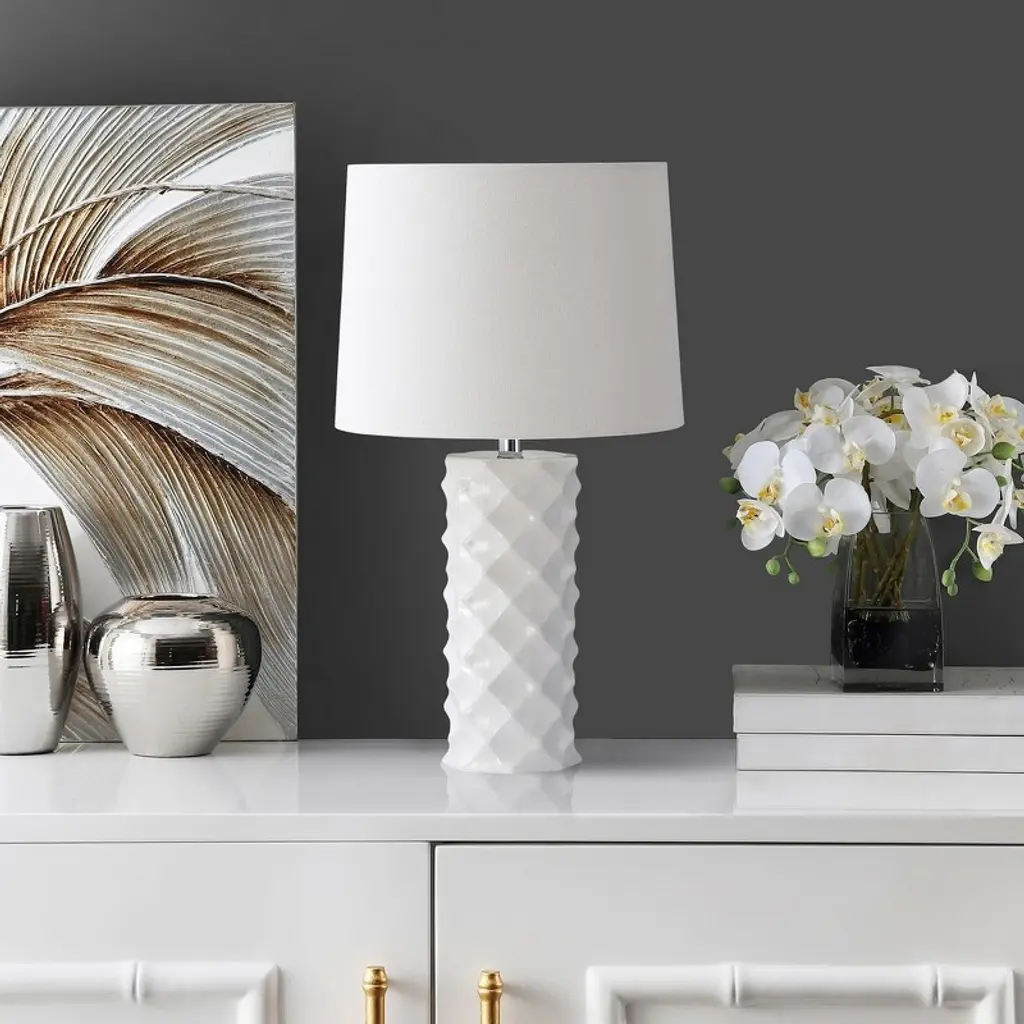 Illuminate your space with the Belford Table Lamp in a refreshing white finish. This lamp brings a touch of elegance with its clean and crisp design. The ceramic base offers a textured yet sleek look, making it a versatile addition to any room. Whether placed in a living room, bedroom, or office, the Belford Table Lamp complements a wide range of decor styles. The soft light diffused through its stylish shade creates a cozy atmosphere, perfect for reading or relaxation. Easy to use and maintain, this lamp is an ideal choice for those looking to enhance their home with simple yet stylish lighting solutions. Update your home decor with the subtle charm of the Belford Table Lamp and enjoy a welcoming ambiance in your favorite spaces.