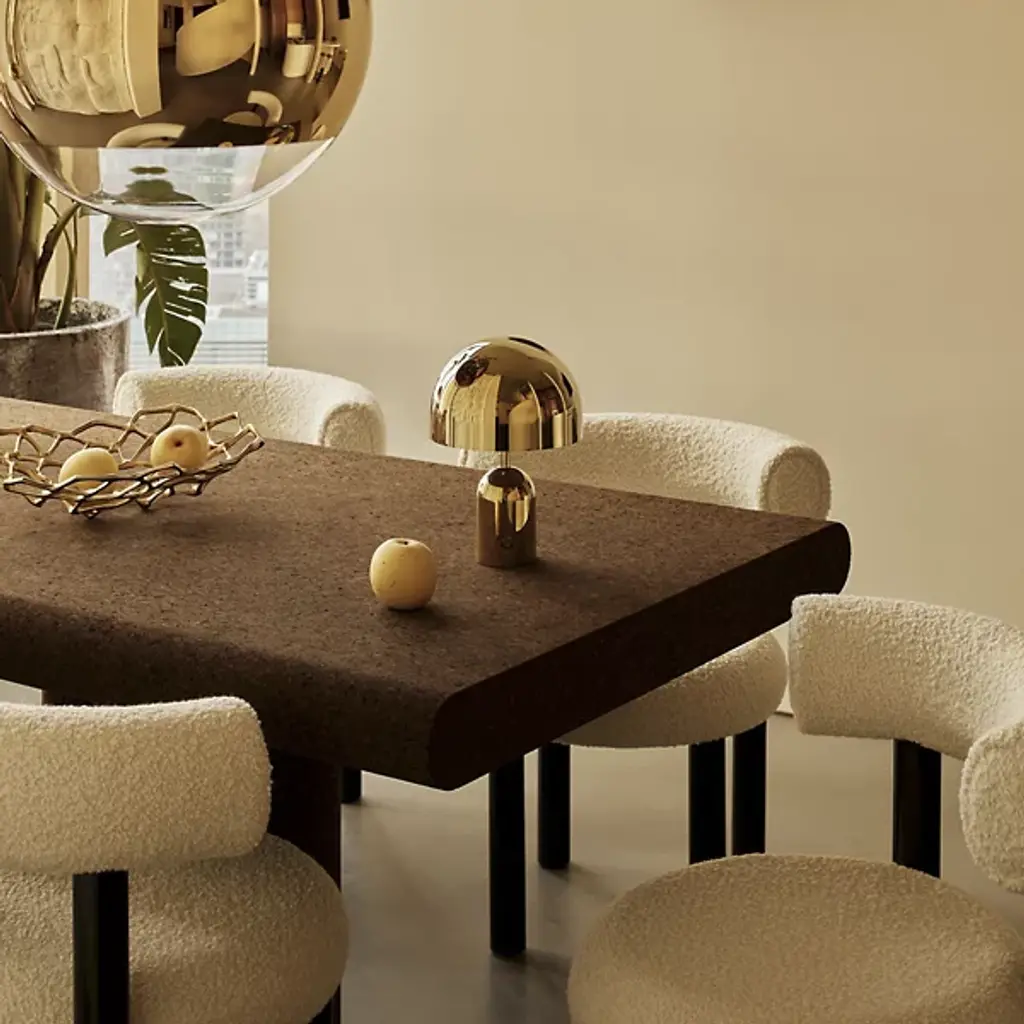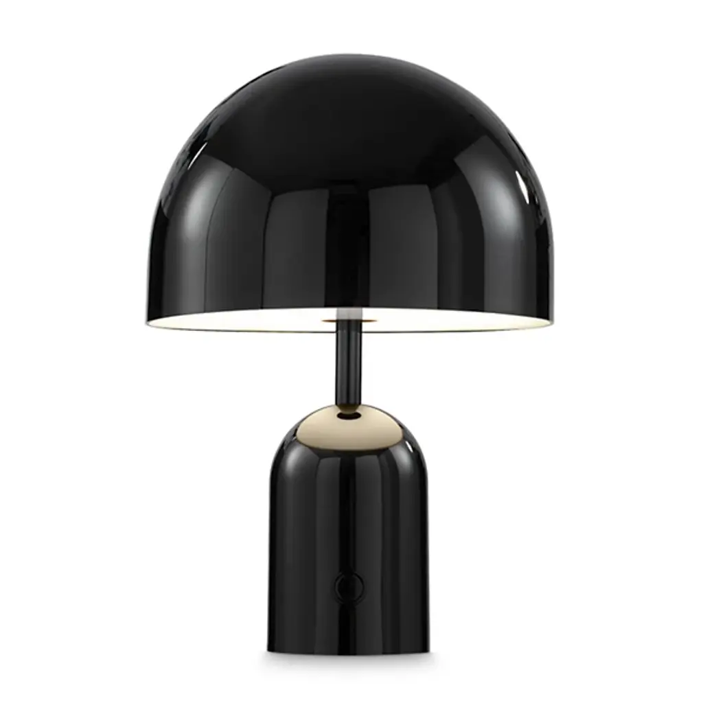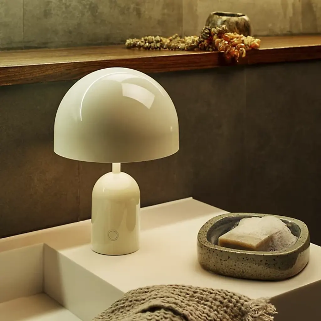 The Bell LED Rechargeable Table Lamp from Tom Dixon reflects the designer's 2021 exploration of reductionist forms through its dome-and-cylinder composition. Dixon developed this piece around the bell shape, where the rounded shade sits atop a matching cylindrical base, characterized by continuous curves. The rechargeable LED system eliminates cord dependency, and the ABS plastic construction keeps the weight manageable while maintaining structural integrity. Touch controls integrated into the base provide dimming capability, while the dome shape directs light downward for ambient illumination.