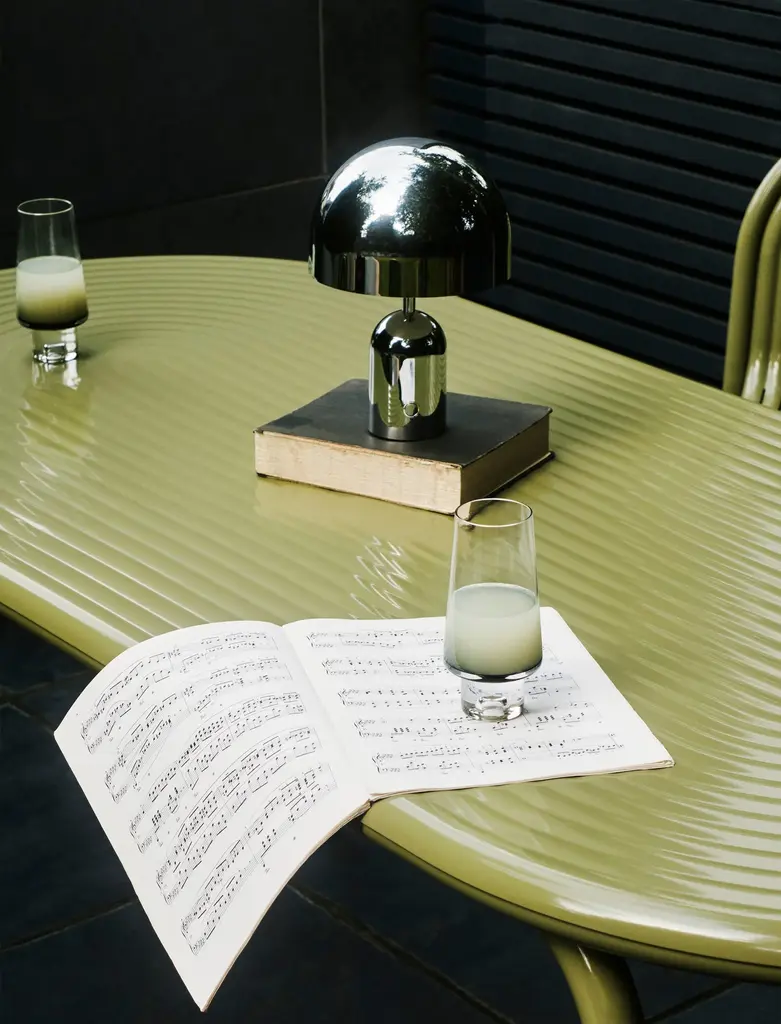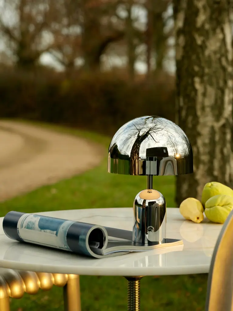 The BELL portable lamp is a minimalist, high-gloss portable lamp inspired by vintage car bumpers. Crafted from plated pressed steel, it mirrors its surroundings while a concealed diffuser emits soft light. This portable light offers 9-hour battery life, indoor-outdoor versatility, energy-efficient LED lighting, and comes with gloves for a fingerprint-free finish.