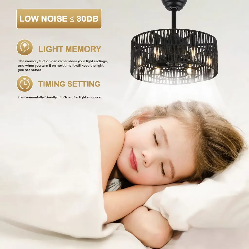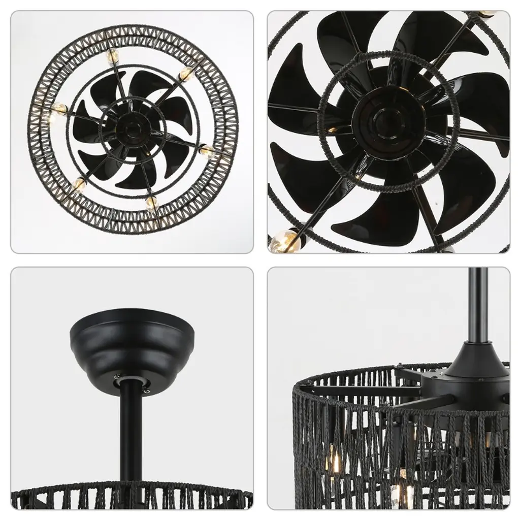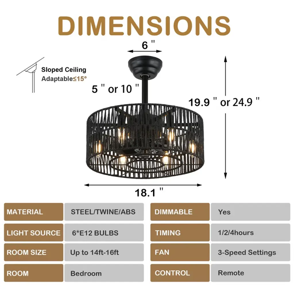 Elevate your space with the Bella Depot 18" Woven Caged Ceiling Fan Light, a stunning blend of rustic charm and modern functionality. This elegantly designed fan features a sturdy black metal frame and a beautifully woven cage lampshade, creating a natural, vintage-inspired aesthetic perfect for any room. With seven durable ABS blades, this fan ensures ample airflow, while its six-speed settings and reversible function make it versatile for year-round use. Enjoy a peaceful environment with whisper-quiet operation at just 50 dB, even on the highest setting. The fan can accommodate up to six E12 bulbs (not included), catering to all your lighting needs. Designed for convenience, it comes with a built-in timer and is easy to install, featuring 4" and 8" downrods to fit smaller spaces like bedrooms and studies. Transform your home with this stylish and functional ceiling fan light¡ªwhere elegance meets practicality!