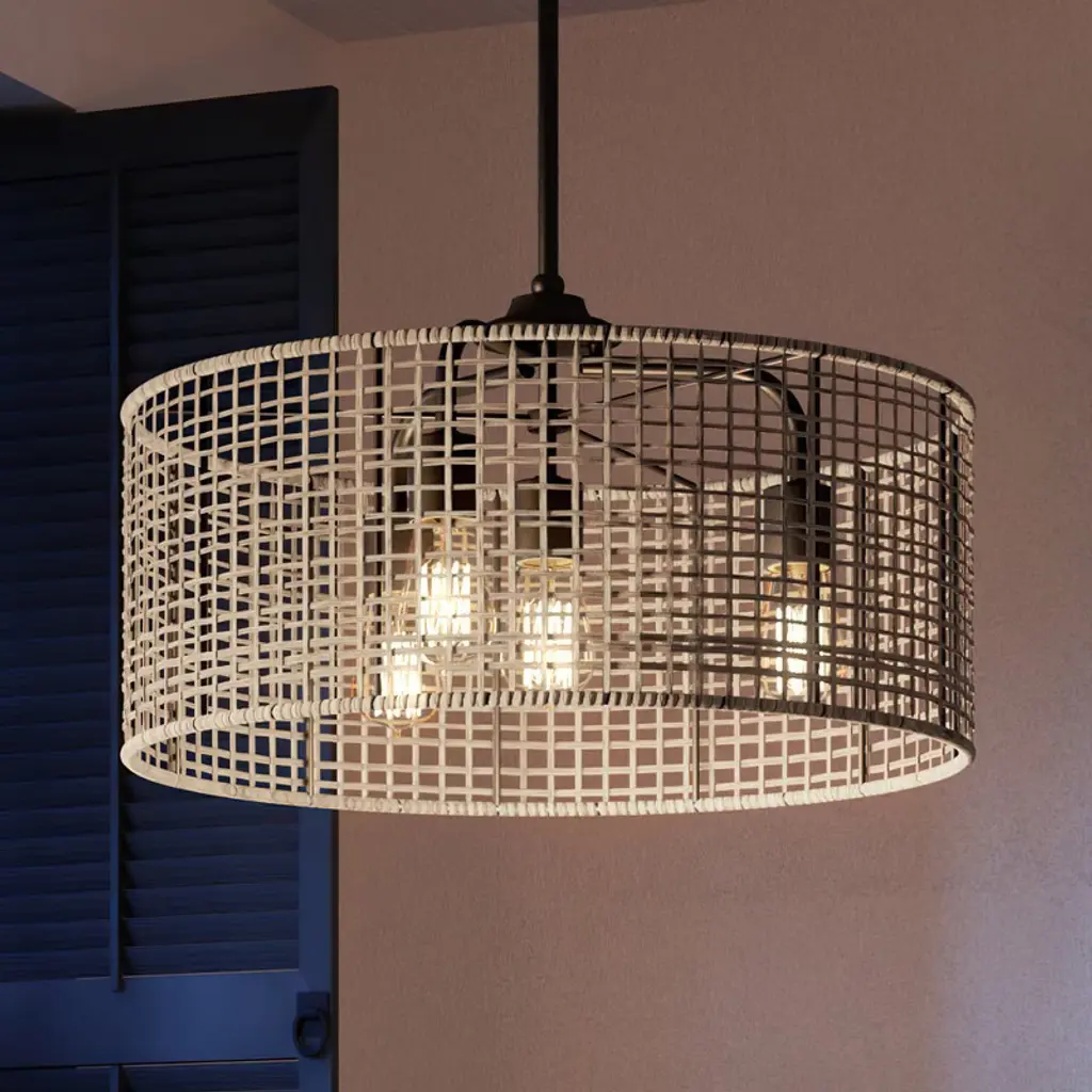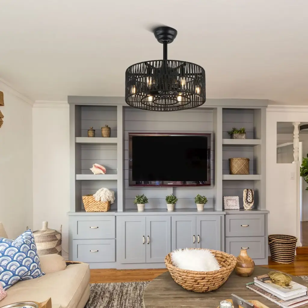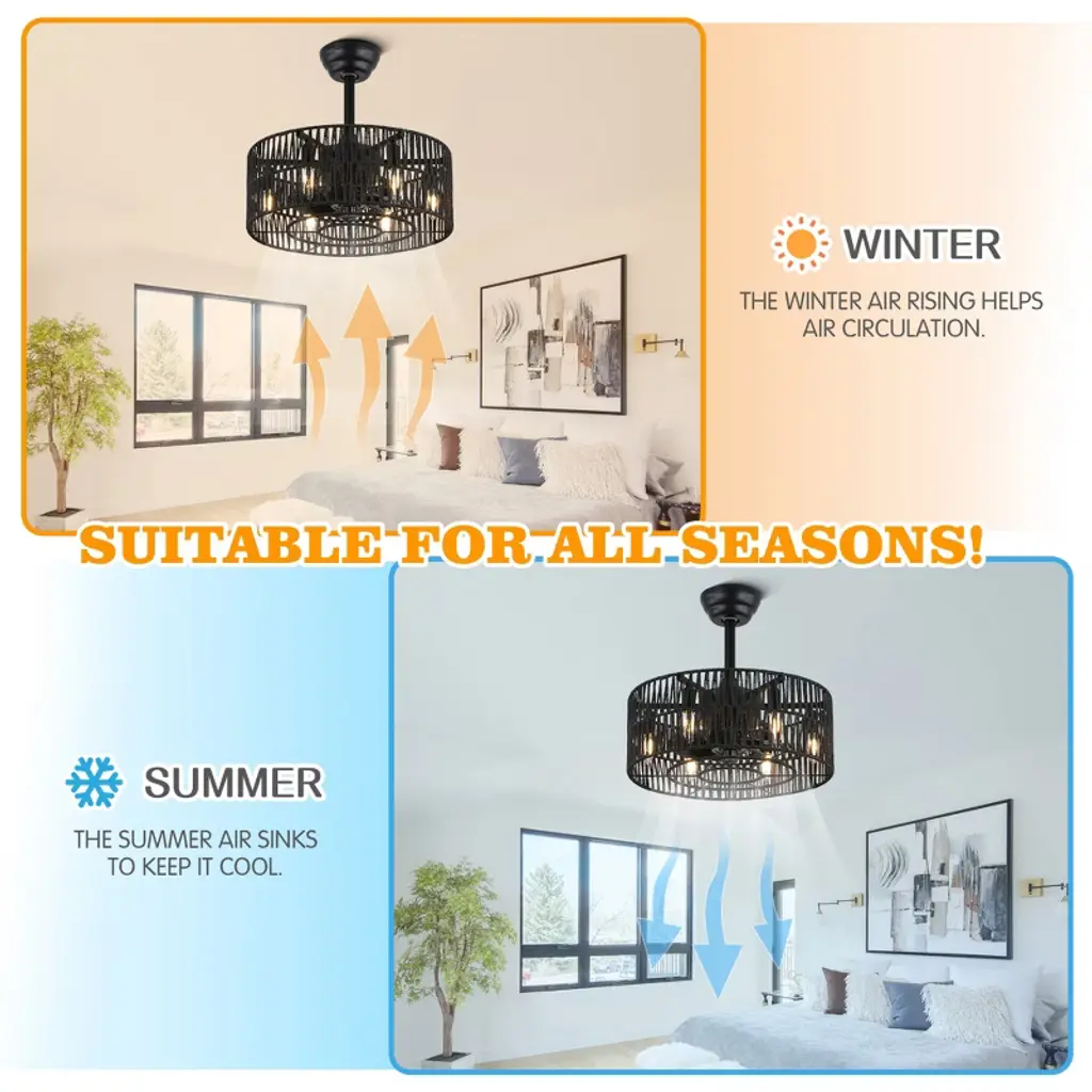 Elevate your space with the Bella Depot 18" Woven Caged Ceiling Fan Light, a stunning blend of rustic charm and modern functionality. This elegantly designed fan features a sturdy black metal frame and a beautifully woven cage lampshade, creating a natural, vintage-inspired aesthetic perfect for any room. With seven durable ABS blades, this fan ensures ample airflow, while its six-speed settings and reversible function make it versatile for year-round use. Enjoy a peaceful environment with whisper-quiet operation at just 50 dB, even on the highest setting. The fan can accommodate up to six E12 bulbs (not included), catering to all your lighting needs. Designed for convenience, it comes with a built-in timer and is easy to install, featuring 4" and 8" downrods to fit smaller spaces like bedrooms and studies. Transform your home with this stylish and functional ceiling fan light¡ªwhere elegance meets practicality!