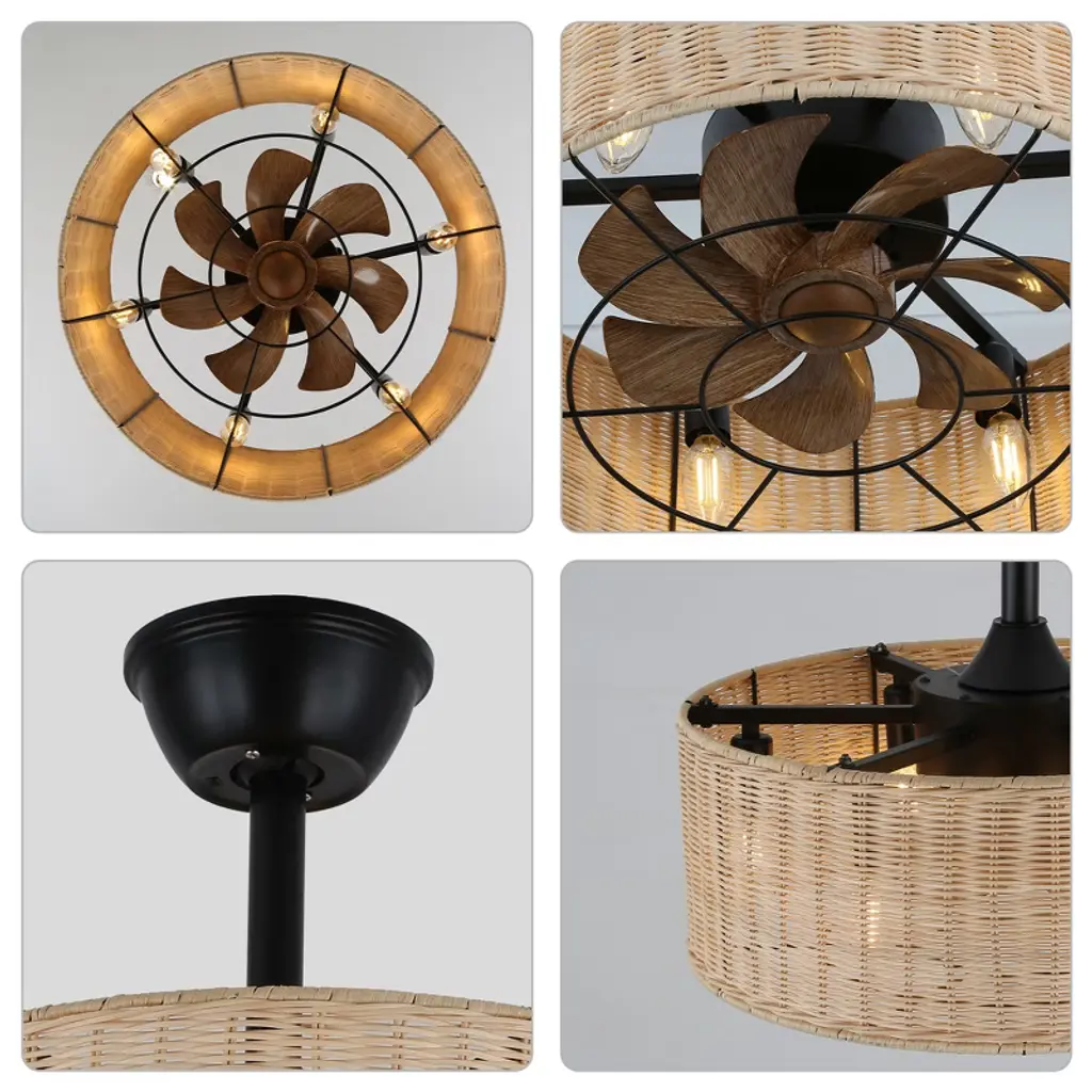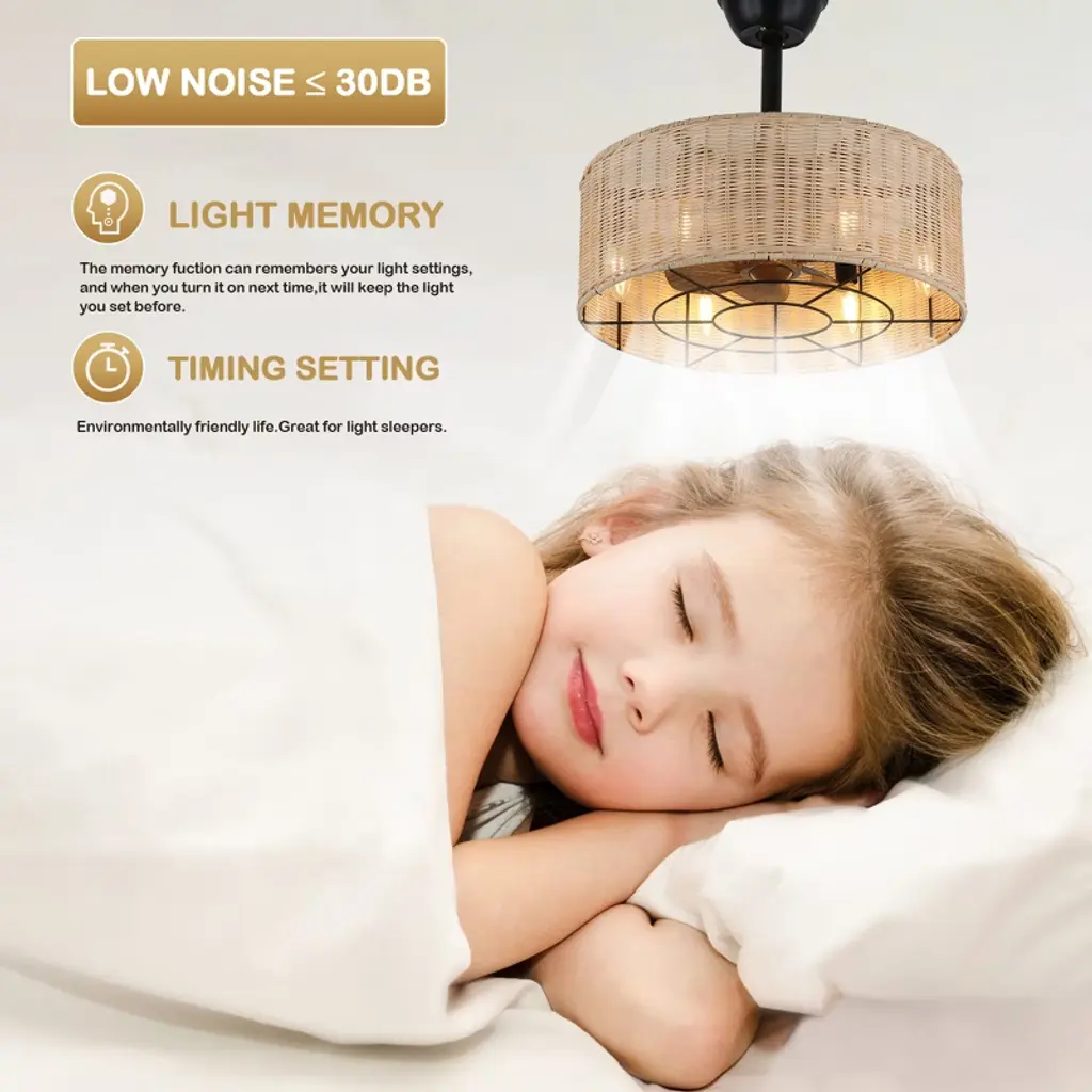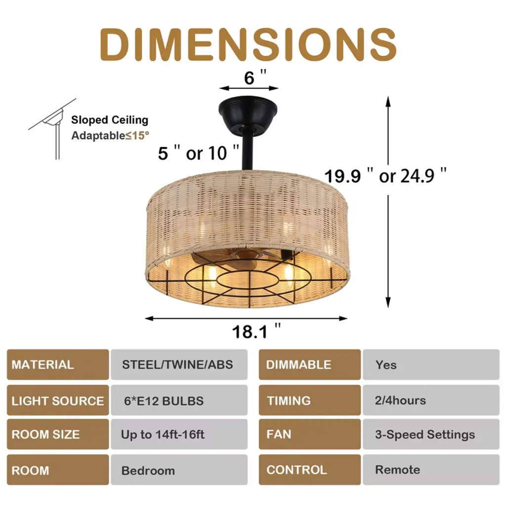 Elevate your space with the Bella Depot 18" Woven Caged Ceiling Fan Light, a stunning blend of rustic charm and modern functionality. This elegantly designed fan features a sturdy black metal frame and a beautifully woven cage lampshade, creating a natural, vintage-inspired aesthetic perfect for any room. With seven durable ABS blades, this fan ensures ample airflow, while its six-speed settings and reversible function make it versatile for year-round use. Enjoy a peaceful environment with whisper-quiet operation at just 50 dB, even on the highest setting. The fan can accommodate up to six E12 bulbs (not included), catering to all your lighting needs. Designed for convenience, it comes with a built-in timer and is easy to install, featuring 4" and 8" downrods to fit smaller spaces like bedrooms and studies. Transform your home with this stylish and functional ceiling fan light¡ªwhere elegance meets practicality!