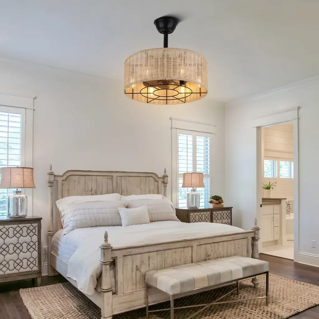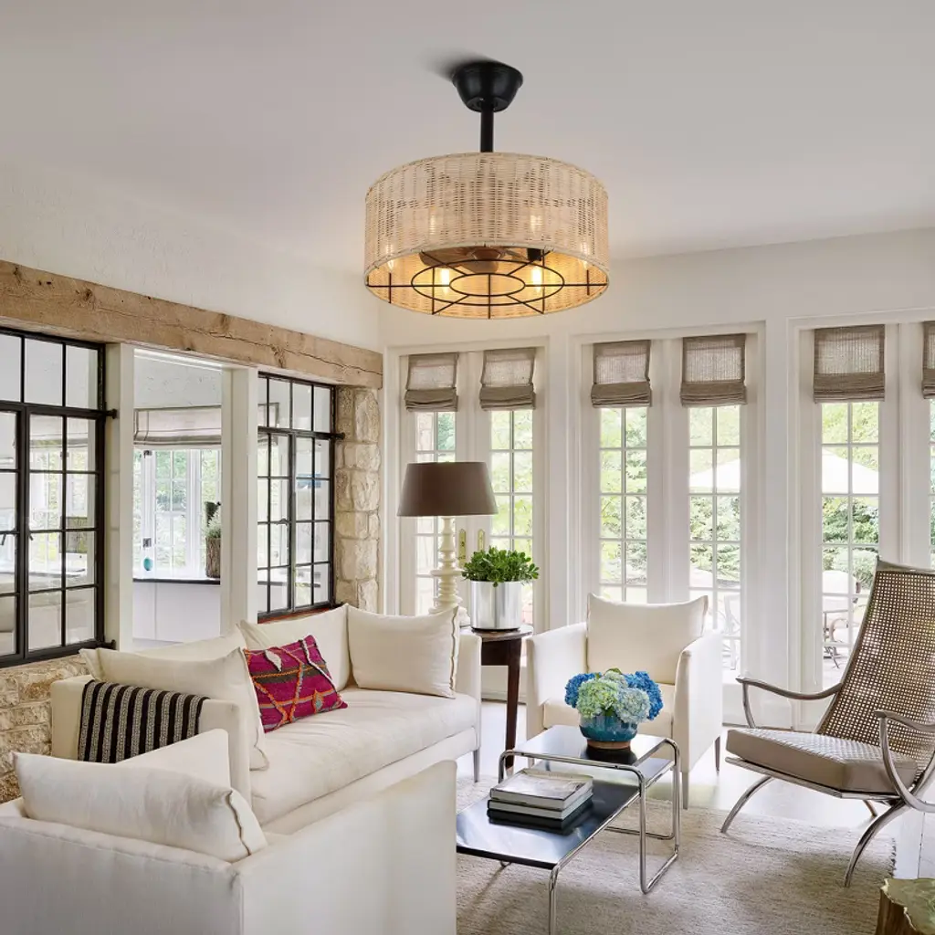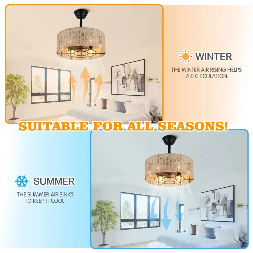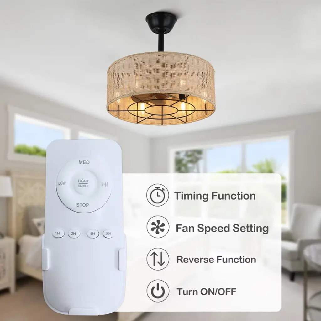 Elevate your space with the Bella Depot 18" Woven Caged Ceiling Fan Light, a stunning blend of rustic charm and modern functionality. This elegantly designed fan features a sturdy black metal frame and a beautifully woven cage lampshade, creating a natural, vintage-inspired aesthetic perfect for any room. With seven durable ABS blades, this fan ensures ample airflow, while its six-speed settings and reversible function make it versatile for year-round use. Enjoy a peaceful environment with whisper-quiet operation at just 50 dB, even on the highest setting. The fan can accommodate up to six E12 bulbs (not included), catering to all your lighting needs. Designed for convenience, it comes with a built-in timer and is easy to install, featuring 4" and 8" downrods to fit smaller spaces like bedrooms and studies. Transform your home with this stylish and functional ceiling fan light¡ªwhere elegance meets practicality!