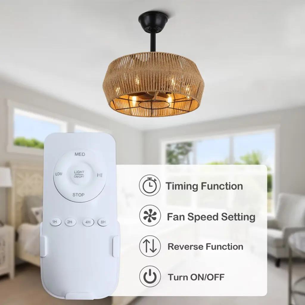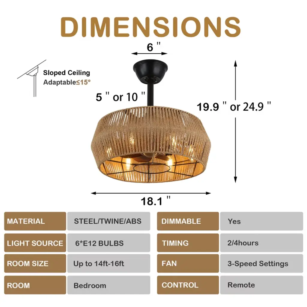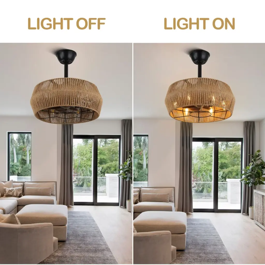 Elevate your space with the Bella Depot 18" Woven Caged Ceiling Fan Light, a stunning blend of rustic charm and modern functionality. This elegantly designed fan features a sturdy black metal frame and a beautifully woven cage lampshade, creating a natural, vintage-inspired aesthetic perfect for any room. With seven durable ABS blades, this fan ensures ample airflow, while its six-speed settings and reversible function make it versatile for year-round use. Enjoy a peaceful environment with whisper-quiet operation at just 50 dB, even on the highest setting. The fan can accommodate up to six E12 bulbs (not included), catering to all your lighting needs. Designed for convenience, it comes with a built-in timer and is easy to install, featuring 4" and 8" downrods to fit smaller spaces like bedrooms and studies. Transform your home with this stylish and functional ceiling fan light¡ªwhere elegance meets practicality!