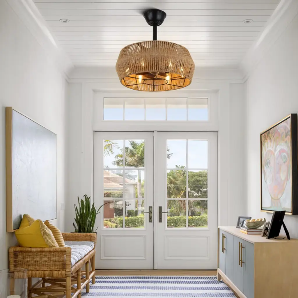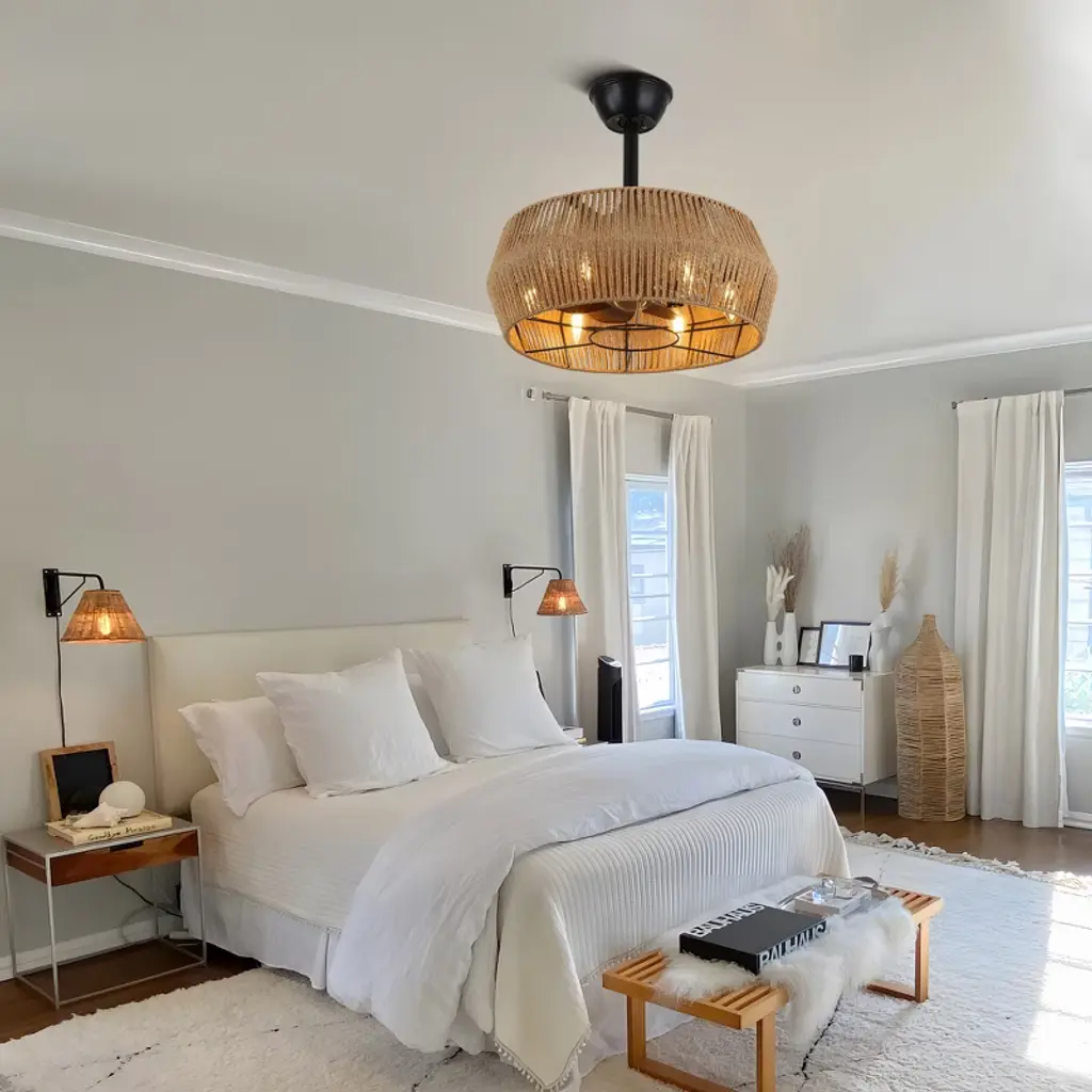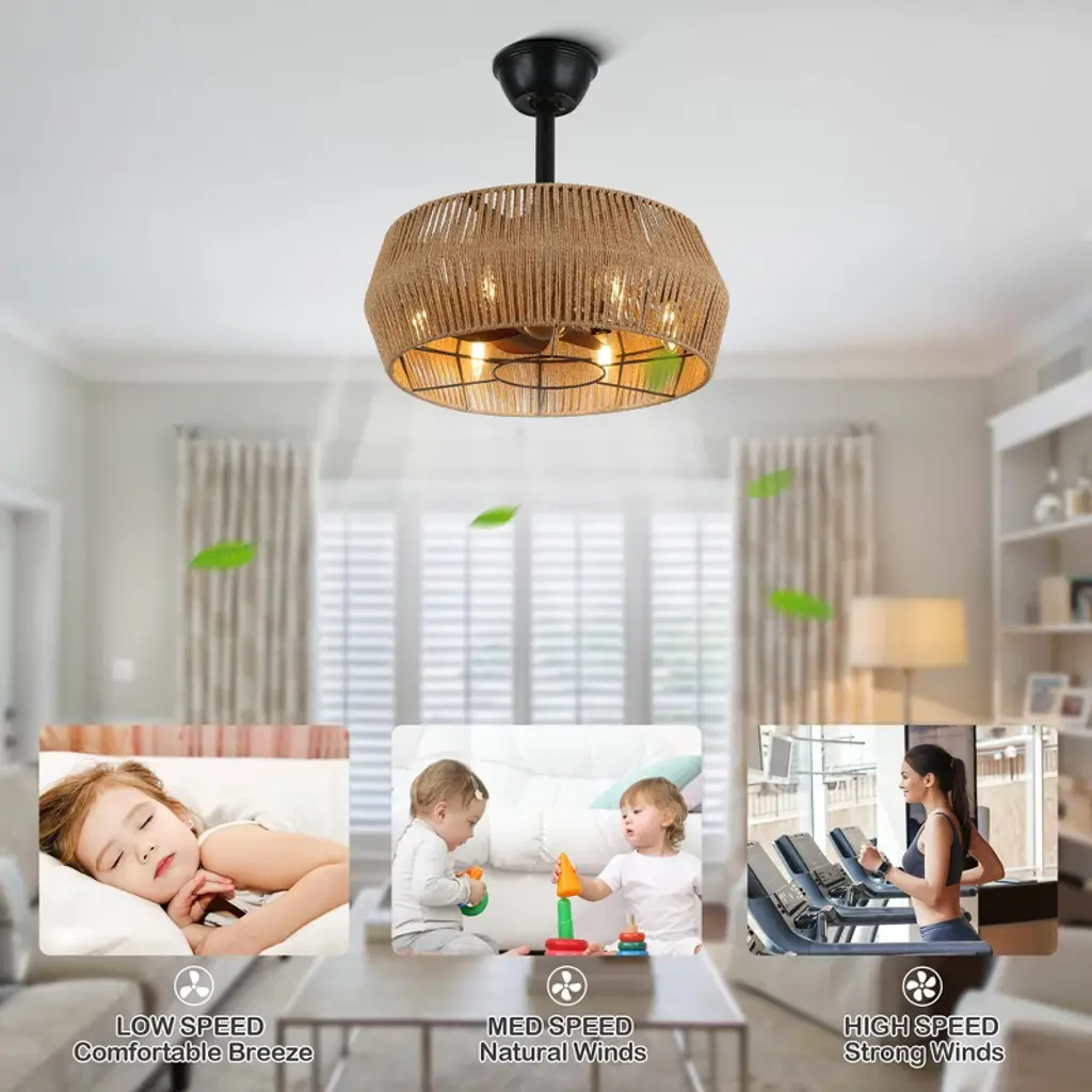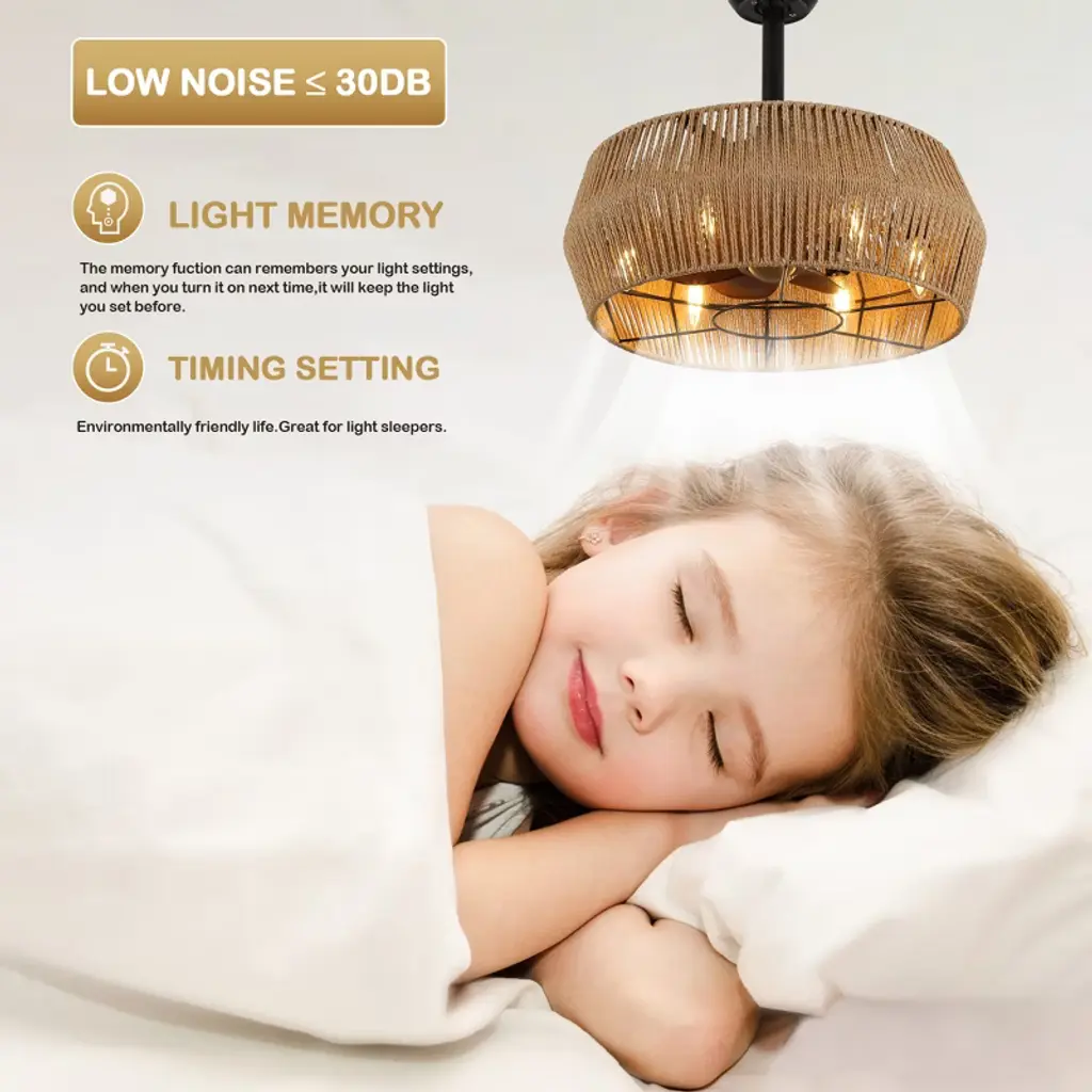 Elevate your space with the Bella Depot 18" Woven Caged Ceiling Fan Light, a stunning blend of rustic charm and modern functionality. This elegantly designed fan features a sturdy black metal frame and a beautifully woven cage lampshade, creating a natural, vintage-inspired aesthetic perfect for any room. With seven durable ABS blades, this fan ensures ample airflow, while its six-speed settings and reversible function make it versatile for year-round use. Enjoy a peaceful environment with whisper-quiet operation at just 50 dB, even on the highest setting. The fan can accommodate up to six E12 bulbs (not included), catering to all your lighting needs. Designed for convenience, it comes with a built-in timer and is easy to install, featuring 4" and 8" downrods to fit smaller spaces like bedrooms and studies. Transform your home with this stylish and functional ceiling fan light¡ªwhere elegance meets practicality!