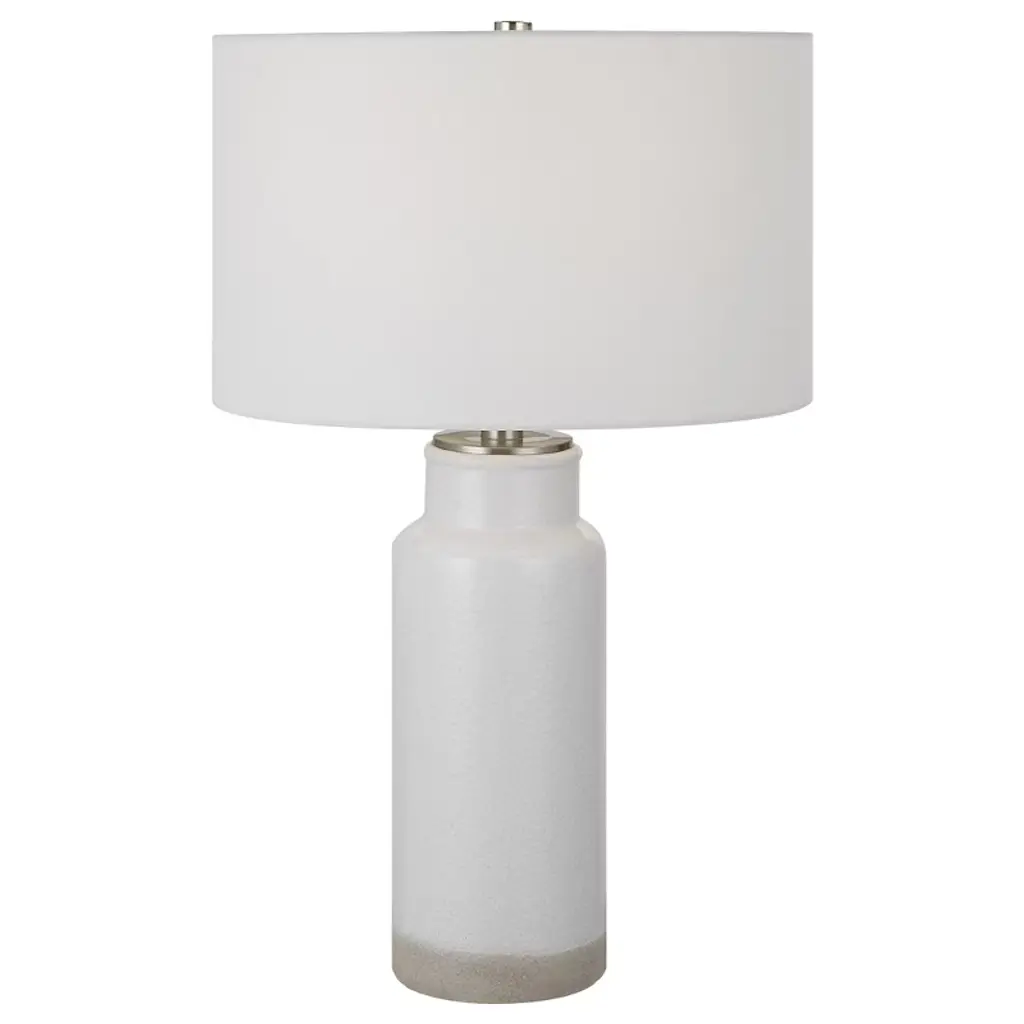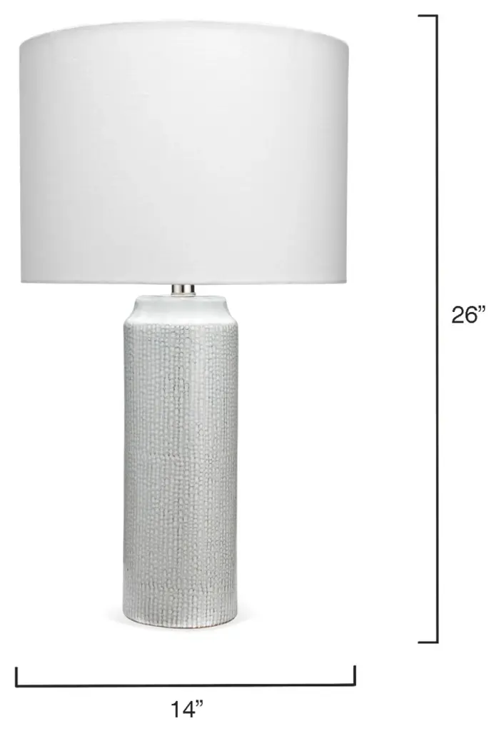 A simple, unrefined shape lends this table lamp organic beauty. Crafted of ceramic, this lamp features a subtle blue and white dot pattern in reactive glaze. Topped with a linen shade for a soft contrast and refined glow. Handmade of ceramic100% Linen White Drum ShadeDot Pattern Base''silver Ball FinialThe handcrafted nature of ceramic creates products with character and individuality. The inherent variations in tone or texture, are preserved, to create pieces rich in detail and natural beauty. These unique imperfections and variations are what define our products, with each piece having its own personality. Lamp Dimensions: 16"H x 5.5" Diameter Footprint''shade Dimensions: 10"H x 14"W x 14"D1 bulb required; Bulb Not Included100 Max Wattage; 120 VoltsE26 Bulb Base Type 8 Ft Clear Cord3-way SwitchCare Instructions: We do not recommend using harsh or abrasive cleaners at any time as they can damage product. Wipe surfaces gently with soft, dry cloth. If needed, you may use a lightly damp cloth with water only on base.