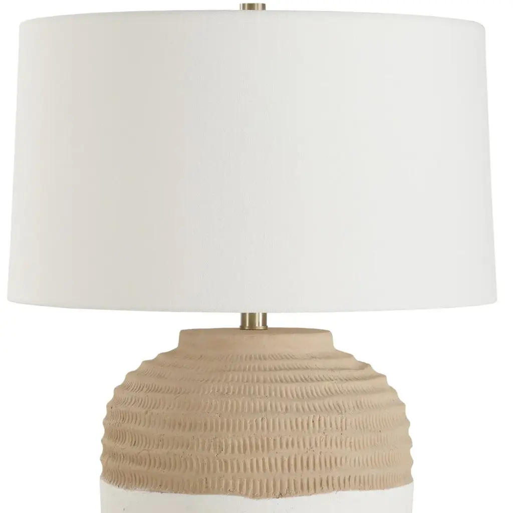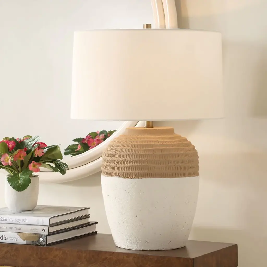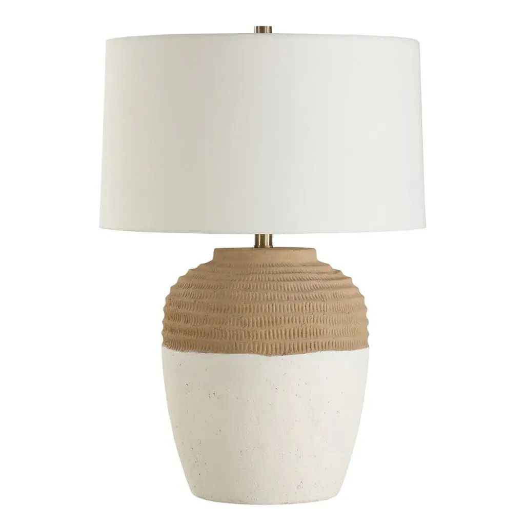 Timeless in beautiful ceramic, this table lamp has fabulous terracotta top contrasting into an elegant white base. Accented with brass details and finished with a crisp white linen shade. This lamp will complement any room and add a chic textural element.