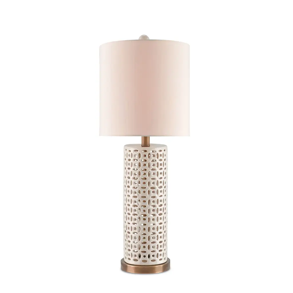 The Bellemeade Table Lamp has a pierced ceramic fretwork made from pale cream-colored ceramic, which contrasts the antique brass finish on the base. When light shines from beneath a honey beige shantung shade, the ivory lamp glows from within and without. Ships In 7-10 Business Days This image is for illustrative purposes only. The colors shown are accurate within the constraints of lighting, photography, and the color accuracy of your screen.