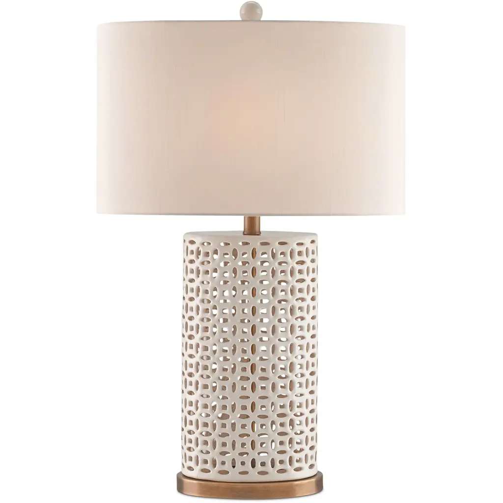 The Bellemeade Table Lamp has a pierced ceramic fretwork made from pale cream-colored ceramic, which contrasts the antique brass finish on the base. When light shines from beneath a honey beige shantung shade, the ivory lamp glows from within and without. Ships In 7-10 Business Days This image is for illustrative purposes only. The colors shown are accurate within the constraints of lighting, photography, and the color accuracy of your screen.
