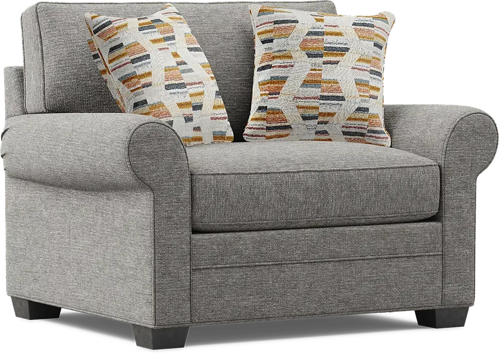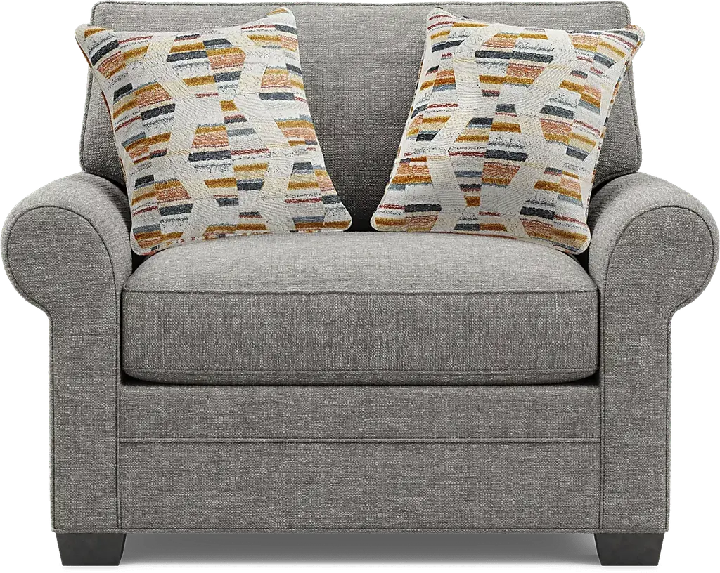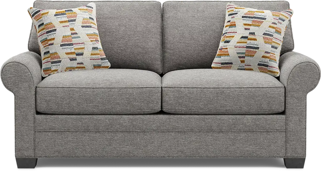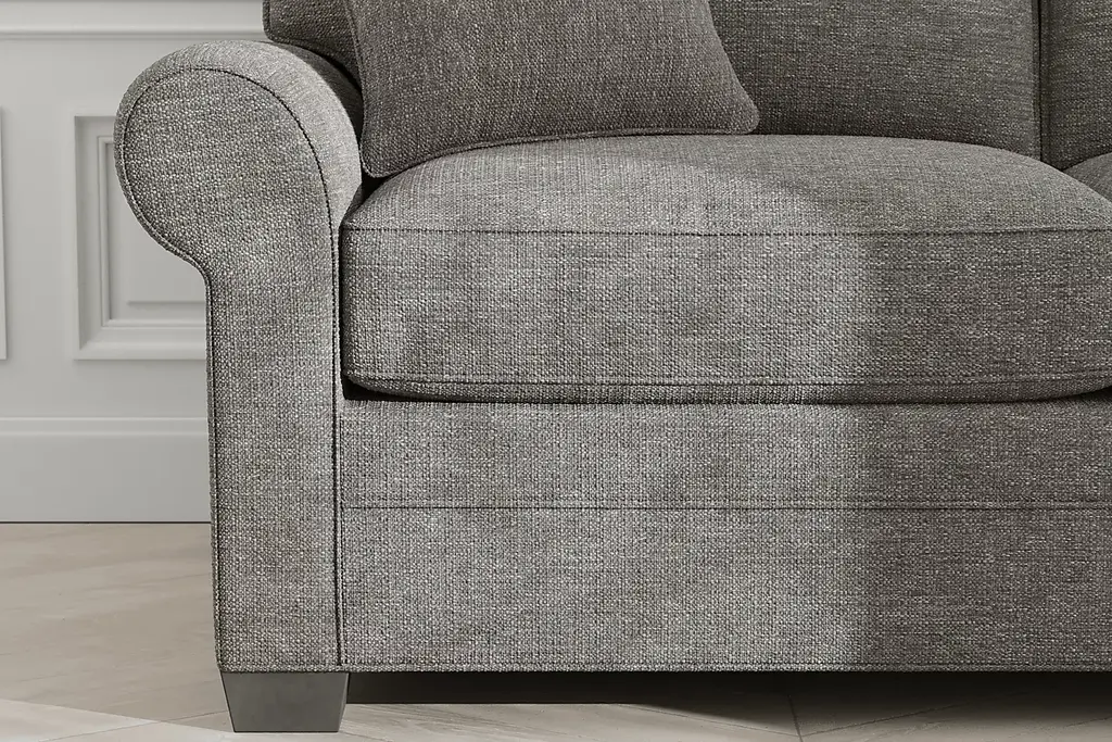 Timeless family-style seating is here with the Bellingham living room from Cindy Crawford Home. Upholstered with textured woven fabric in an irresistible shade of gray, the sofa and loveseat each feature reversible back and seat cushions with double-welted boxed borders. Matching accent pillows and padded rolled arms add perfect final touches. Upholstery: 100% Polyester. Cleaning Instructions: Use water based cleaning agents or foam. Small accent pillow not included. Tables and lamps not as shown in room image.